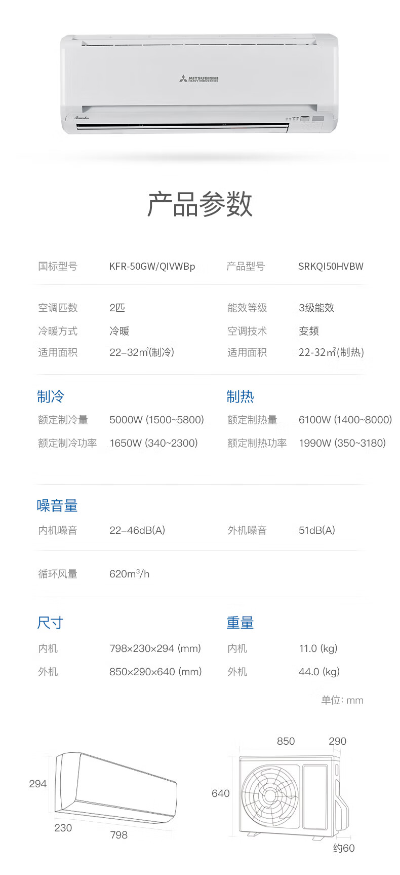三菱重工空调2匹 新3级能效 直流变频 冷暖家用壁挂式空调挂机KFR-50GW/QIVBp 【2匹挂】SRKQI50HVBW