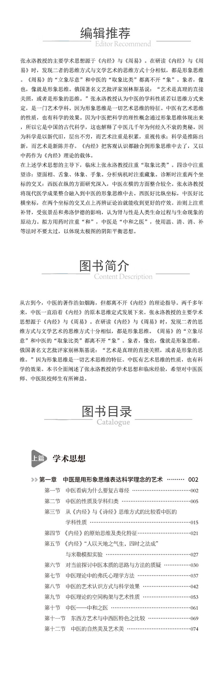 张永洛教授的主要学术思想源于《内经》与《周易。在研读《内经》与《周易》时,发现二者的思维方式与文学艺术的思维方式十分相似,都是形象思维。《周易》的“立象尽意”和中医的“取象比类”都离不开“象”。象者,像也,像就是形象思维。俄国有名文艺批评家别林斯基说:“艺术是真理的直接关照,或者是形象的思维。”因为形象思维是一切艺术思维的特征。中医有艺术思维的性质,也有科学的效果。
