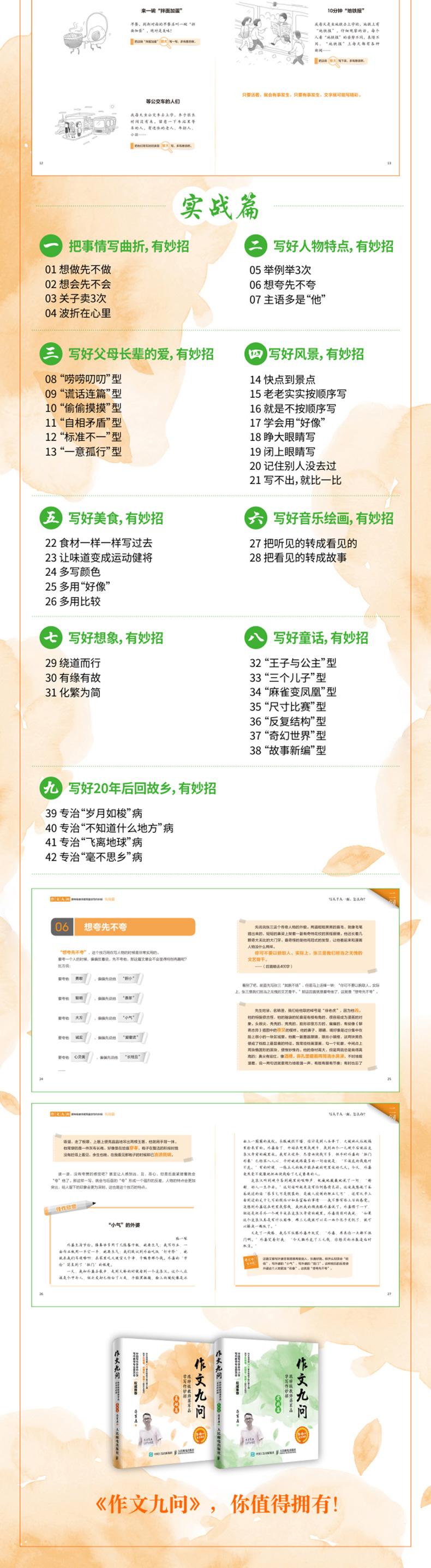 特级教师十年一线教学经验总结 专业编辑一年文稿装帧设计打磨 作文九问,给你百招,招招有效 1.作文九问,每一问都是让孩子心生畏惧的写作痛点。 没内容可写,开不了头,就是写不长,语句磕磕巴巴,总写些陈词滥调,不会写外貌,不会写对话,不会写心理……这么多作文难题,怎么办? 写事都是流水账,写人千人一面,写爱又假又俗,写景不优美,写物特点不突出,写艺术作品没头绪,写想象干巴巴,写童话没思路,写未来总是老一套……这么多作文难题,怎么办? 别怕,跟着特级教师蒋军晶学写作妙招! 2.作文九问,每一招都是特级教师多年的教学经验总结。 要动连着动、要动分开动、遇到“很”“非常”想一想、写到“终于”停一停、就是不用成语、五官轮番上、想做先不做、想会先不会、关子卖3 次、波折在心里、举例举3 次、想夸先不夸……蒋军晶老师将自己多年的教学经验总结成一个个顺口溜似的写作技法,简单实用,孩子听得懂、记得牢、用得上。 3.作文九问,每一招都是一堂精彩的作文课。 蒋军晶老师把自己精心总结的技法录制成了一节节5~8分钟的微课,在多个班级和多个讲学场所展示。二维码微课学习版本的图书也在出版计划中,敬请期待! 4.作文九问,每一页都为孩子轻松阅读、快速领会而设计。 不是密密麻麻地堆砌文字,而是条理清晰地展示技巧。不是低劣粗糙的教辅图书,而是精心设计的名家精品。自己用,有效果!送朋友,有品位!