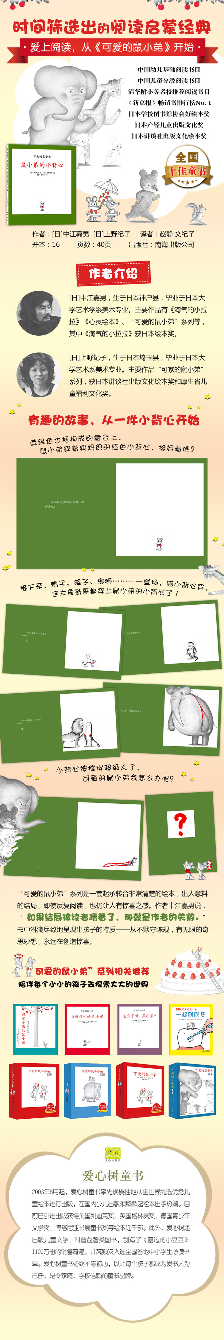 “可爱的鼠小弟”系列是日本绘本作者中江嘉男和上野纪子合著的不朽经典,自1974年诞生以来,斩获日本各大童书奖项——日本学校图书馆协会好绘本奖、日本产经儿童出版文化奖、日本讲谈社出版文化绘本奖、日本厚生省儿童福利文化奖,堪称日本“国民绘本”。