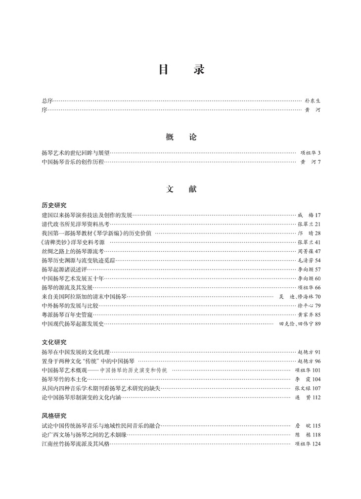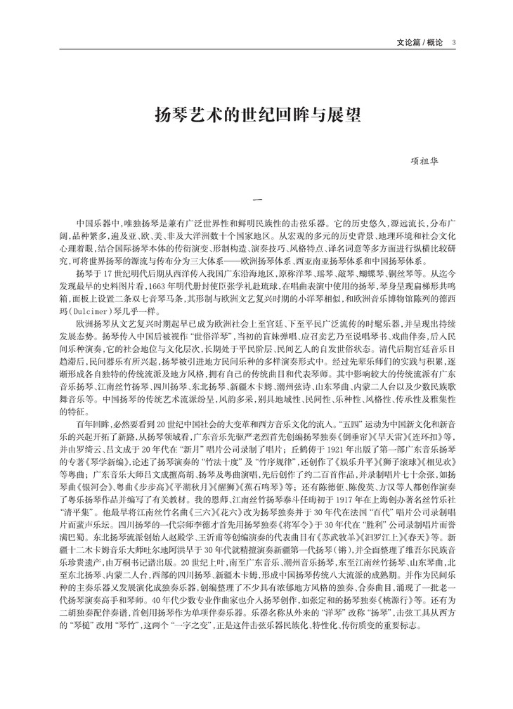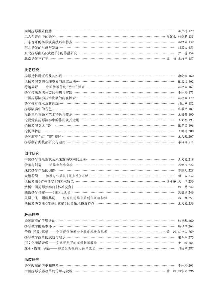 文论卷包括文献、乐人、乐事和资料四个部分。其中作为重点的文献部分包括了历史研究、文化研究、流派研究、教学研究、技艺研究、创作研究与乐改研究七个大类共计近七十篇文章;乐人部分介绍了新老扬琴艺术家共计一百三十余位;乐事部分下设大事记、赛事、学术及纪念活动、学术团体四个板块;最后的资料部分提供了有关扬琴的文论、出版物、作品曲目等有关资料的索引。