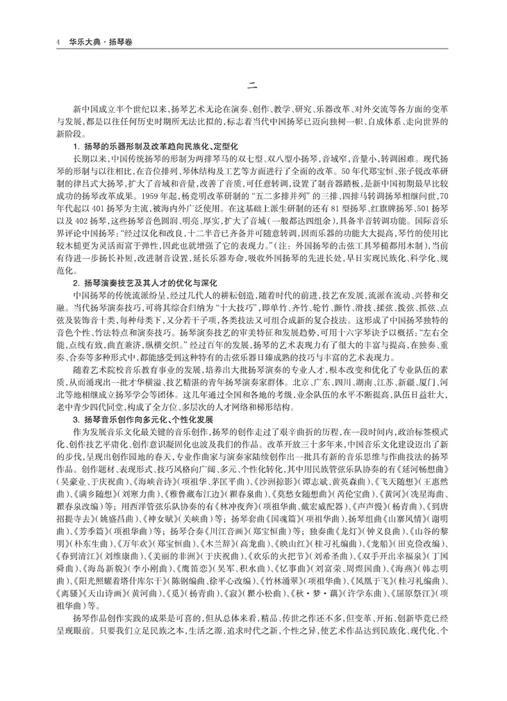作为外来乐器的扬琴,虽然在我国经过数百年的流传和发展,已经成为一件中国的民族乐器,但其文献资料相当缺乏,在长期的民间流传中也没有专业的理论研究作指引,直至新中国成立后才得到重视发展。因此,本大典收录的这些内容具有相当重要的文献与资料价值,同时也是中国扬琴与各国同行们交流的一份宝贵礼物。