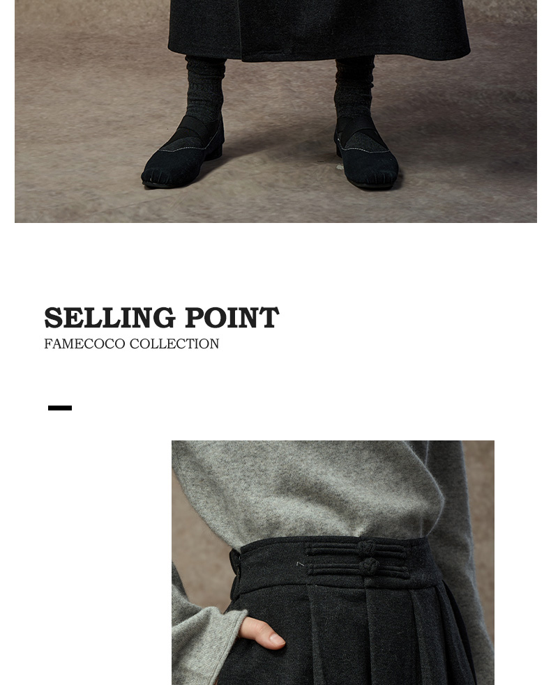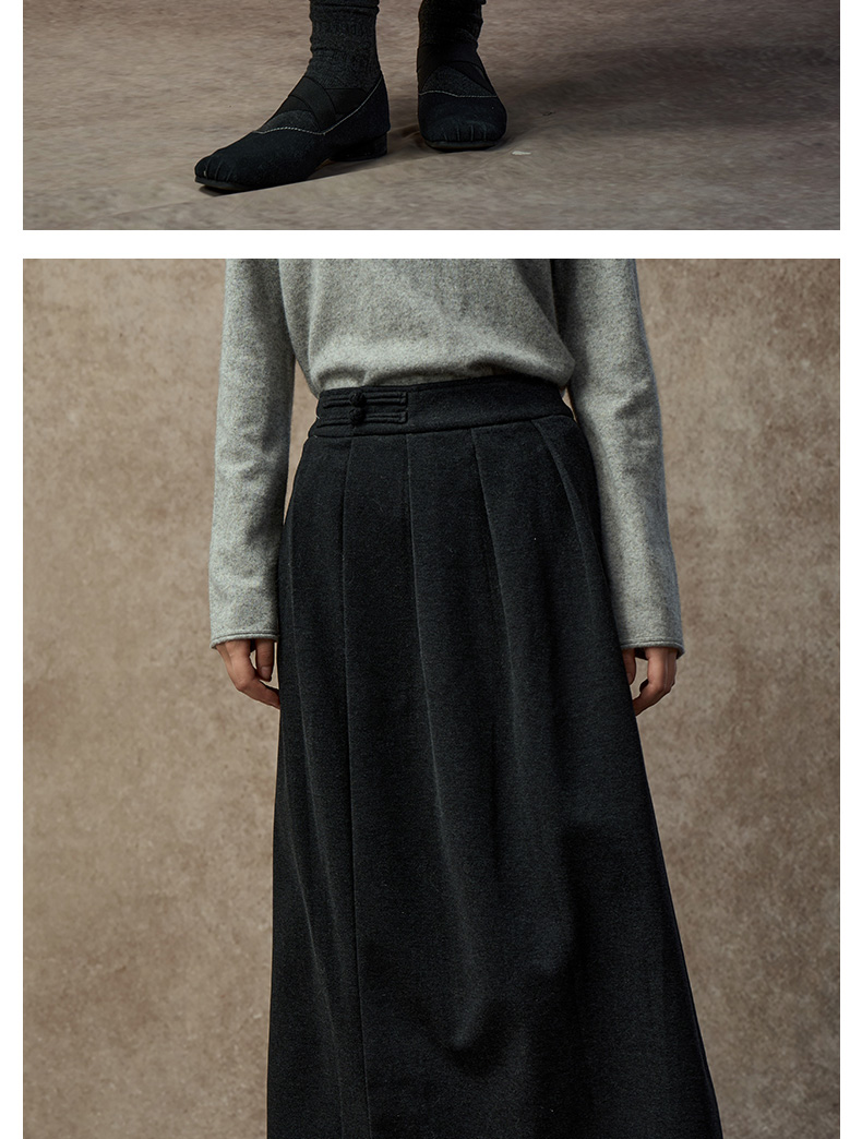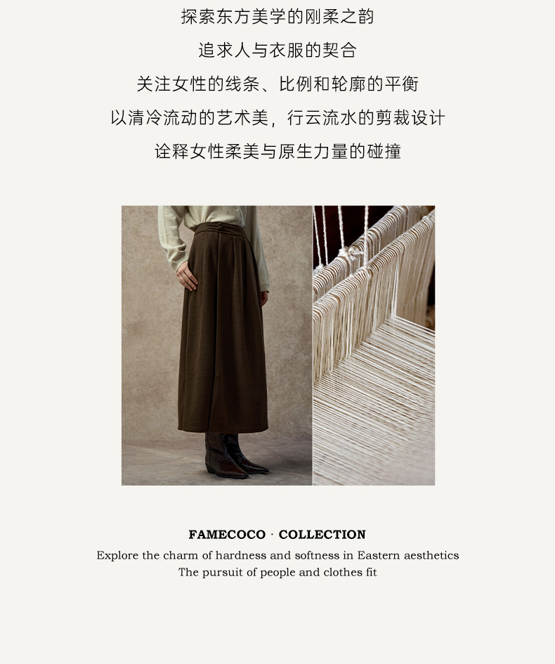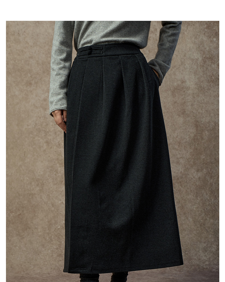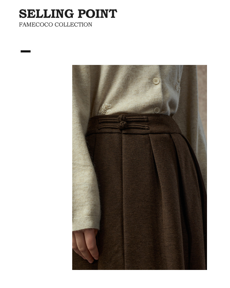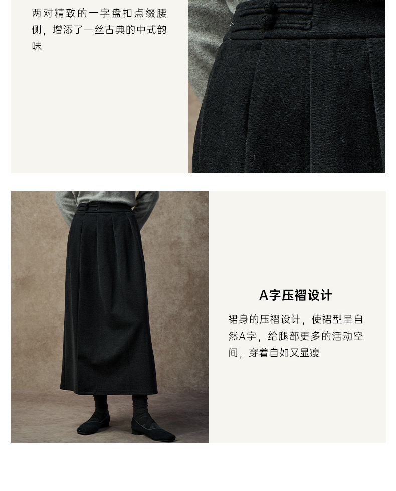 Famecoco新中式改良盘扣显瘦压褶A字毛呢高级感半身裙FAC8HA022