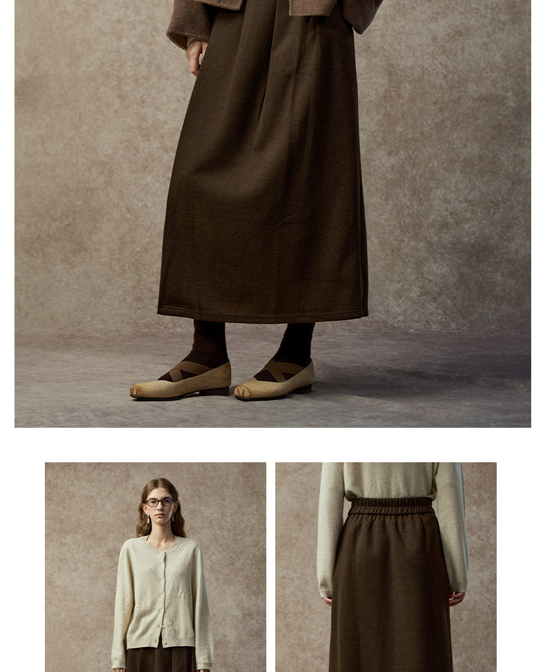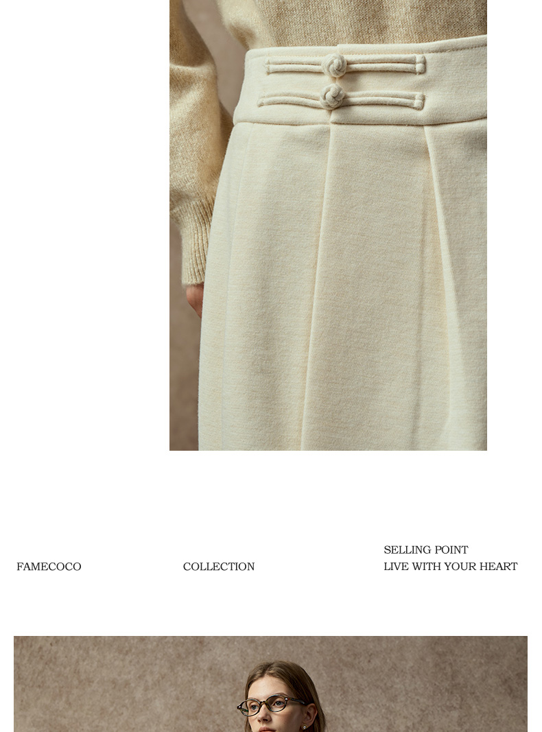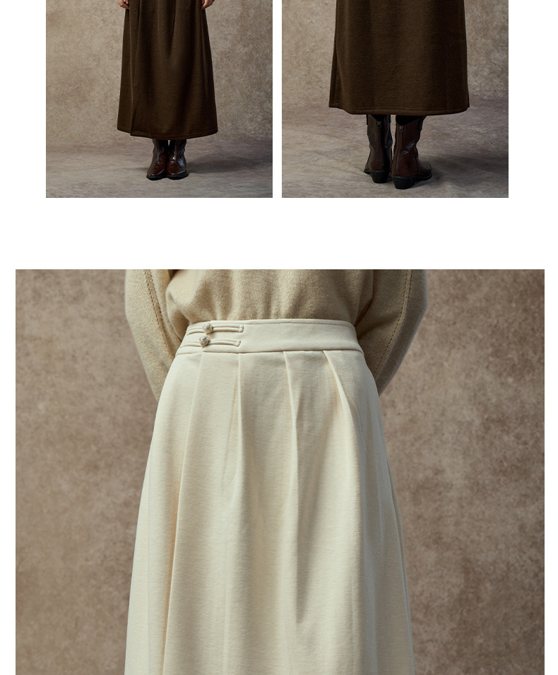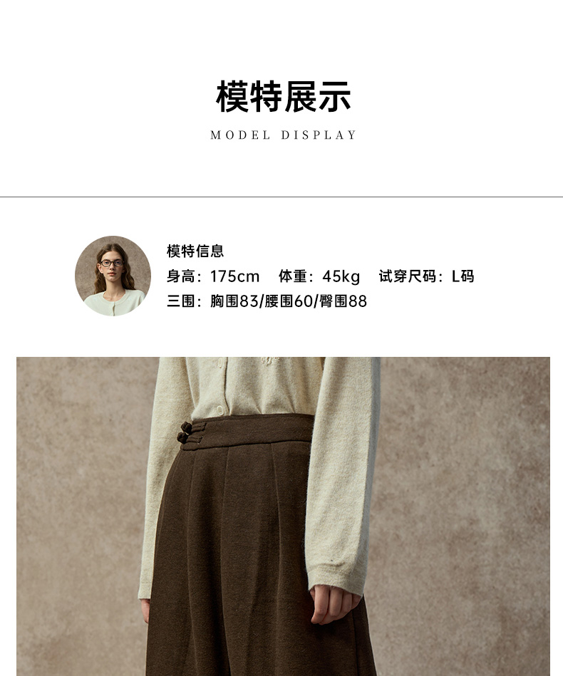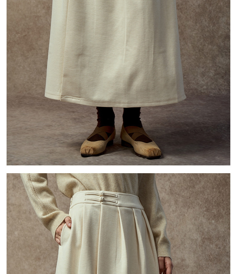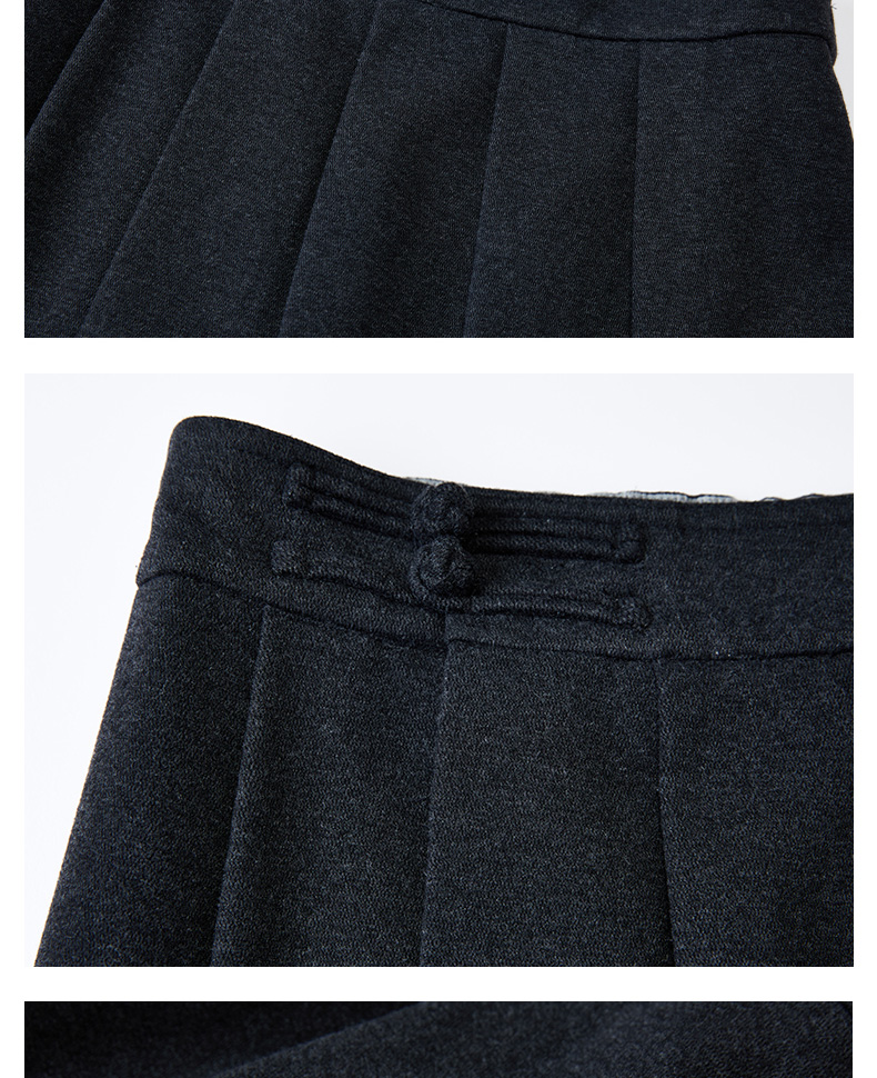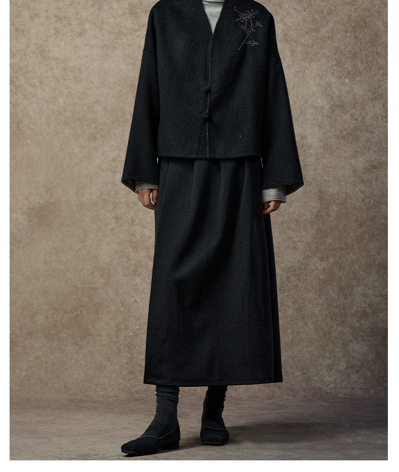 Famecoco新中式改良盘扣显瘦压褶A字毛呢高级感半身裙FAC8HA022