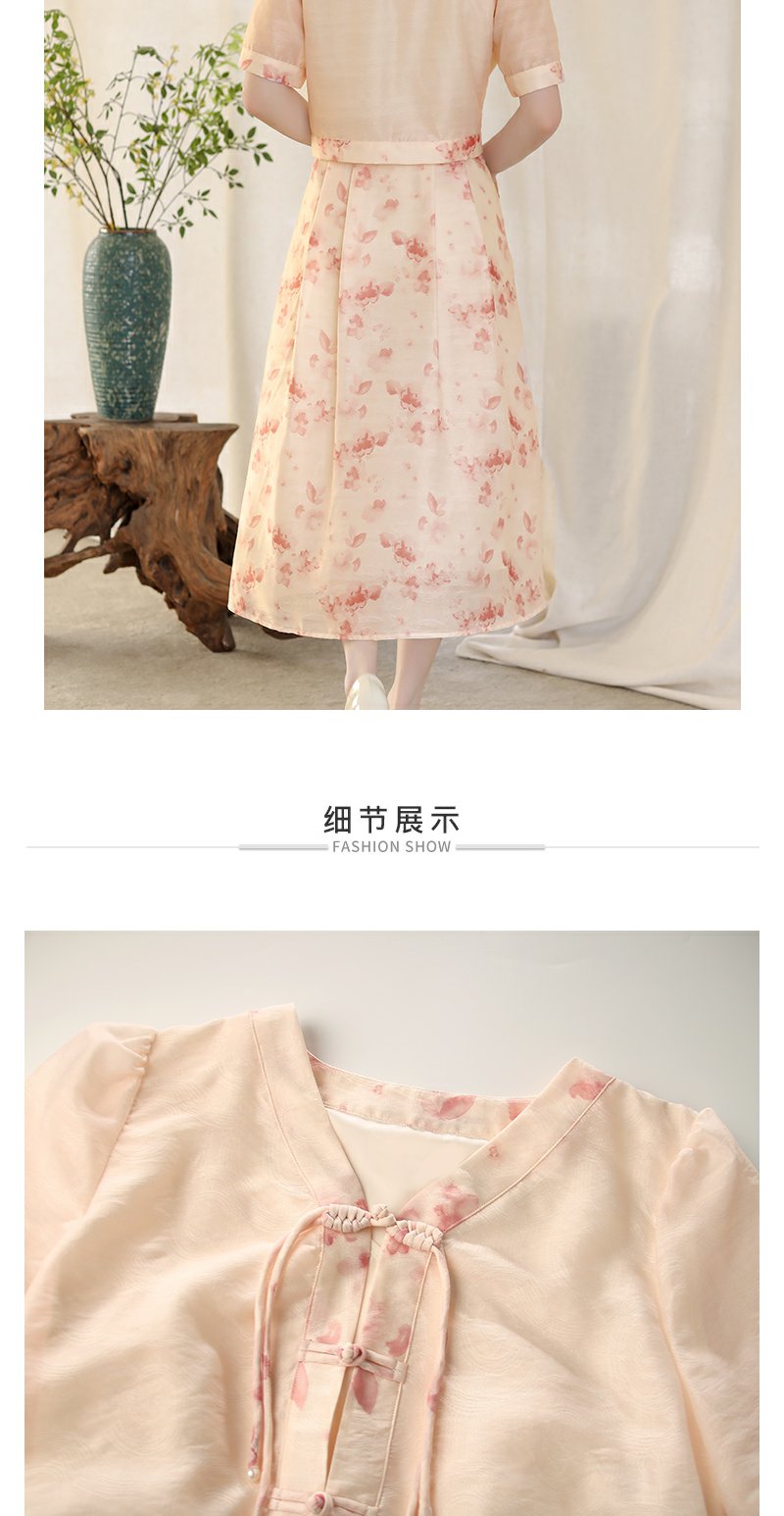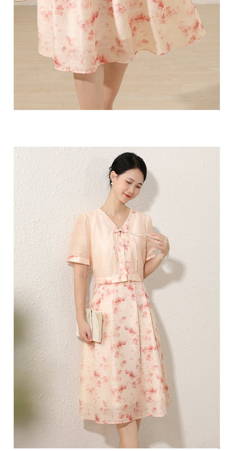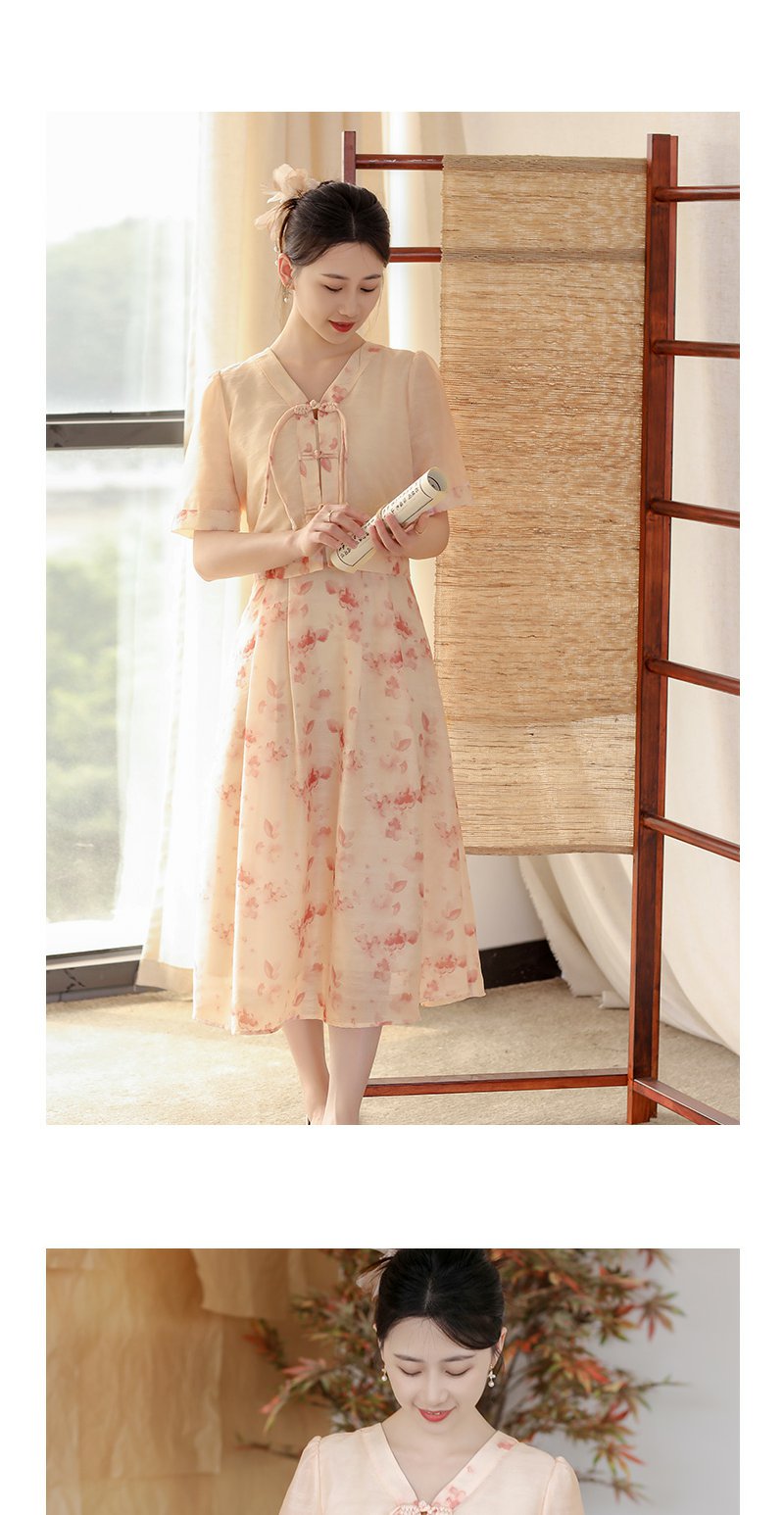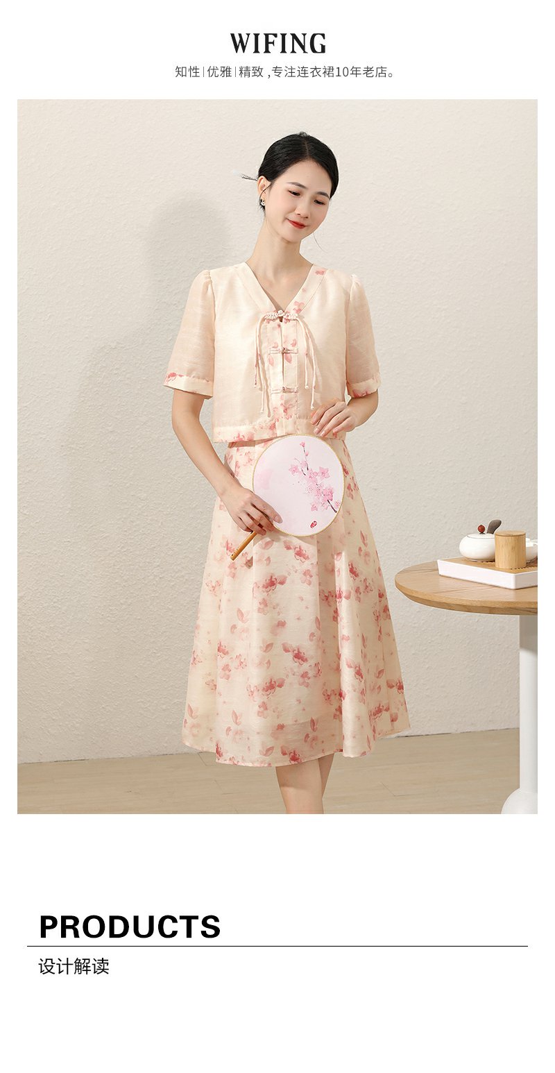 未风粉色显瘦V领连衣裙女夏2025新款夏季高腰新中式国风短袖裙子