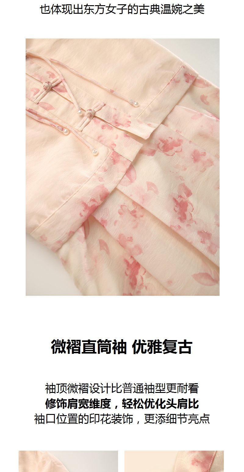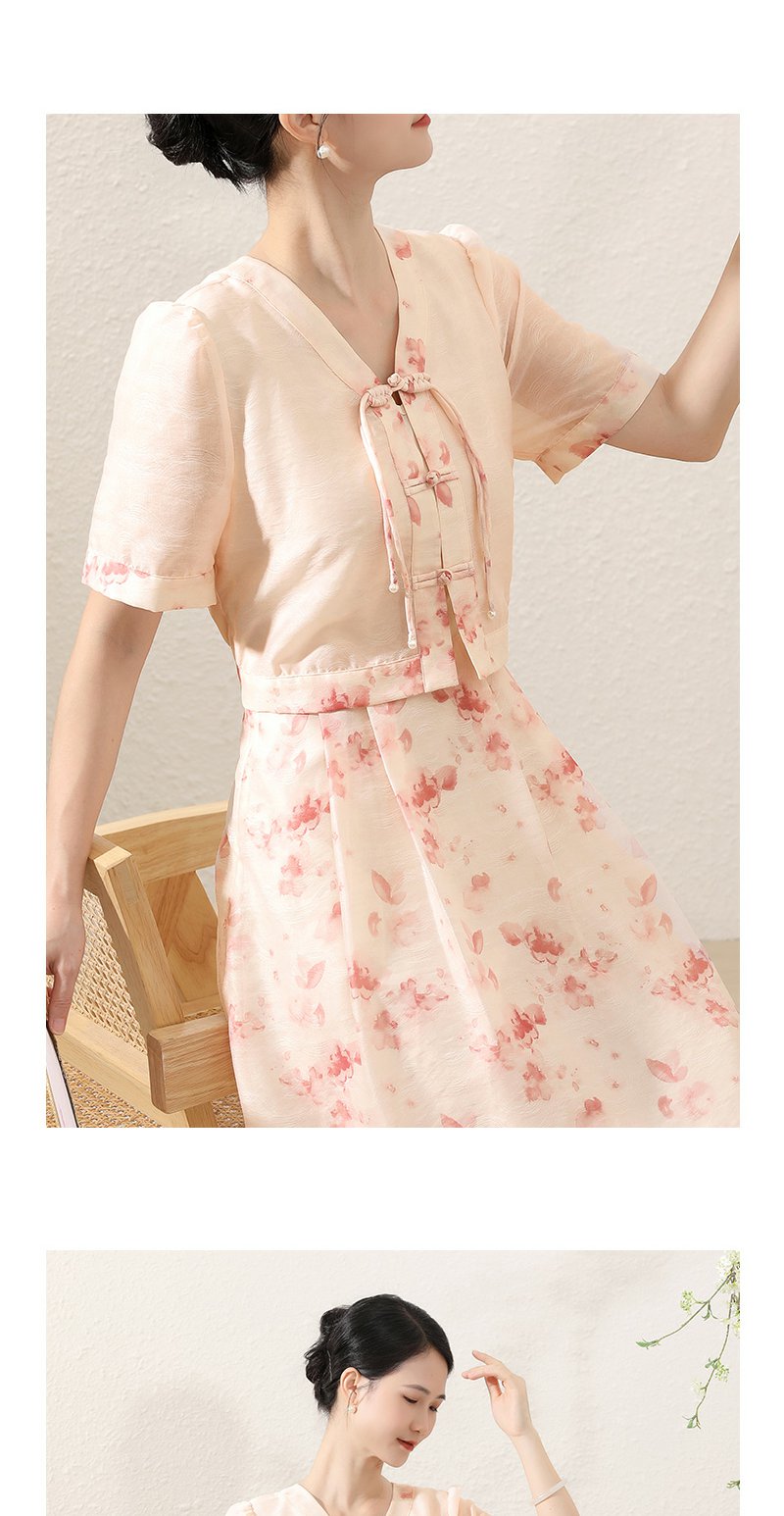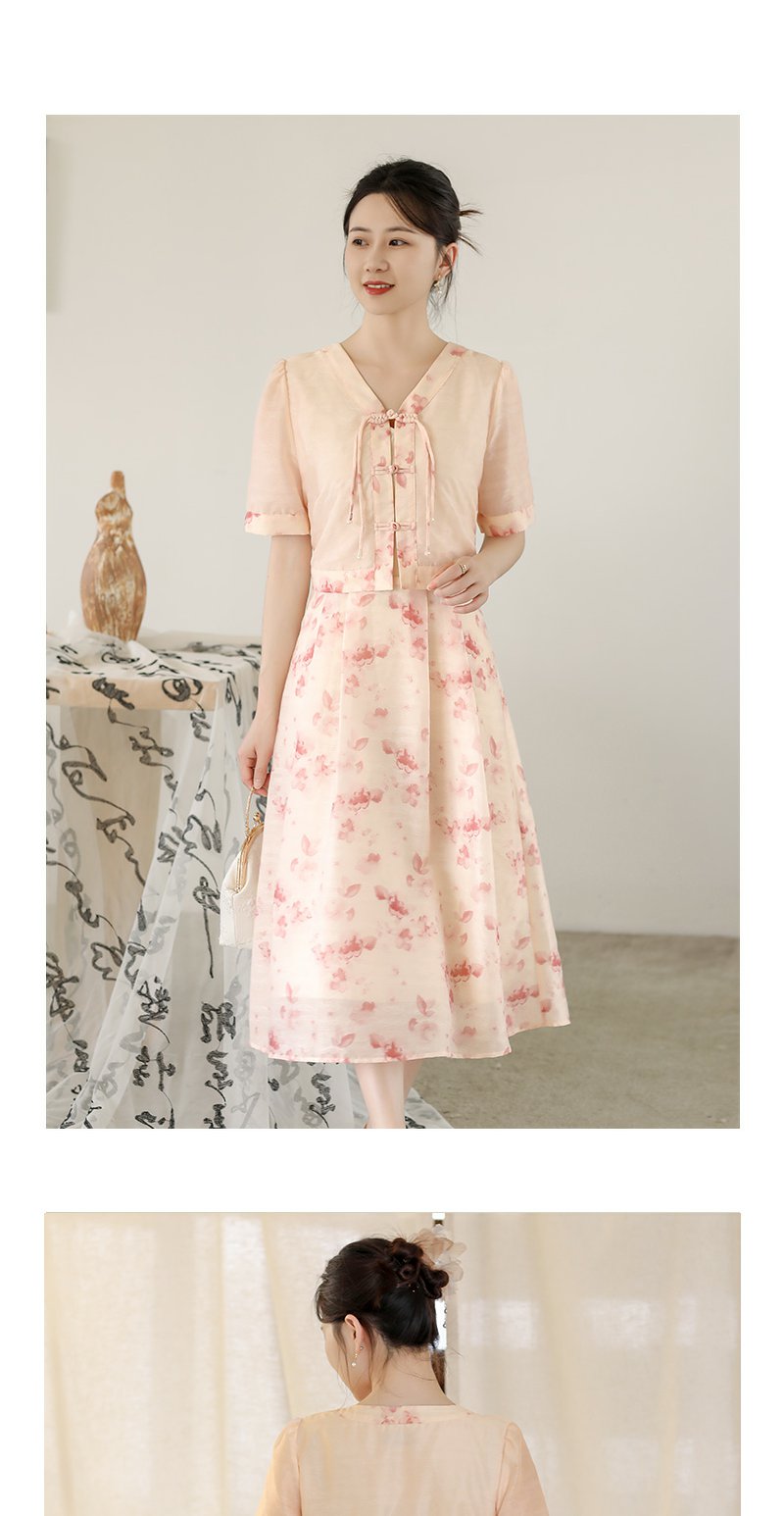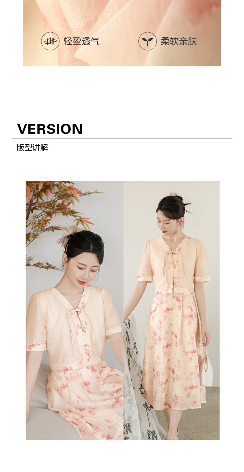 未风粉色显瘦V领连衣裙女夏2025新款夏季高腰新中式国风短袖裙子