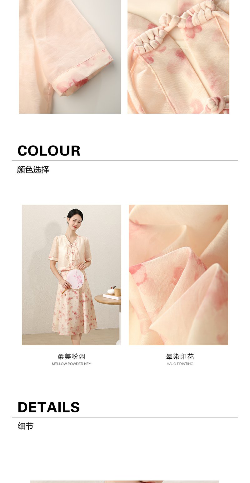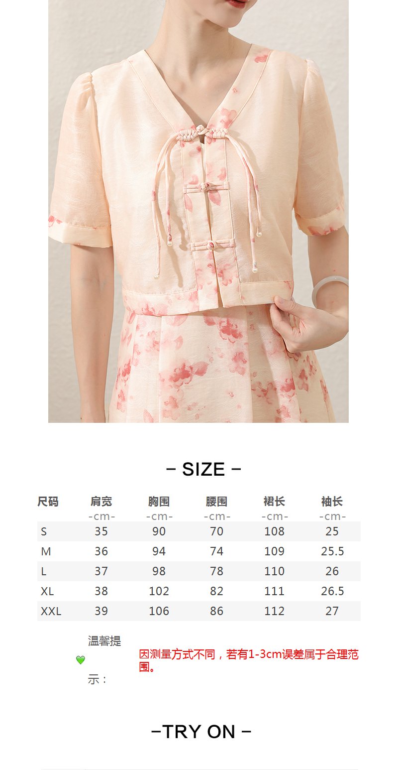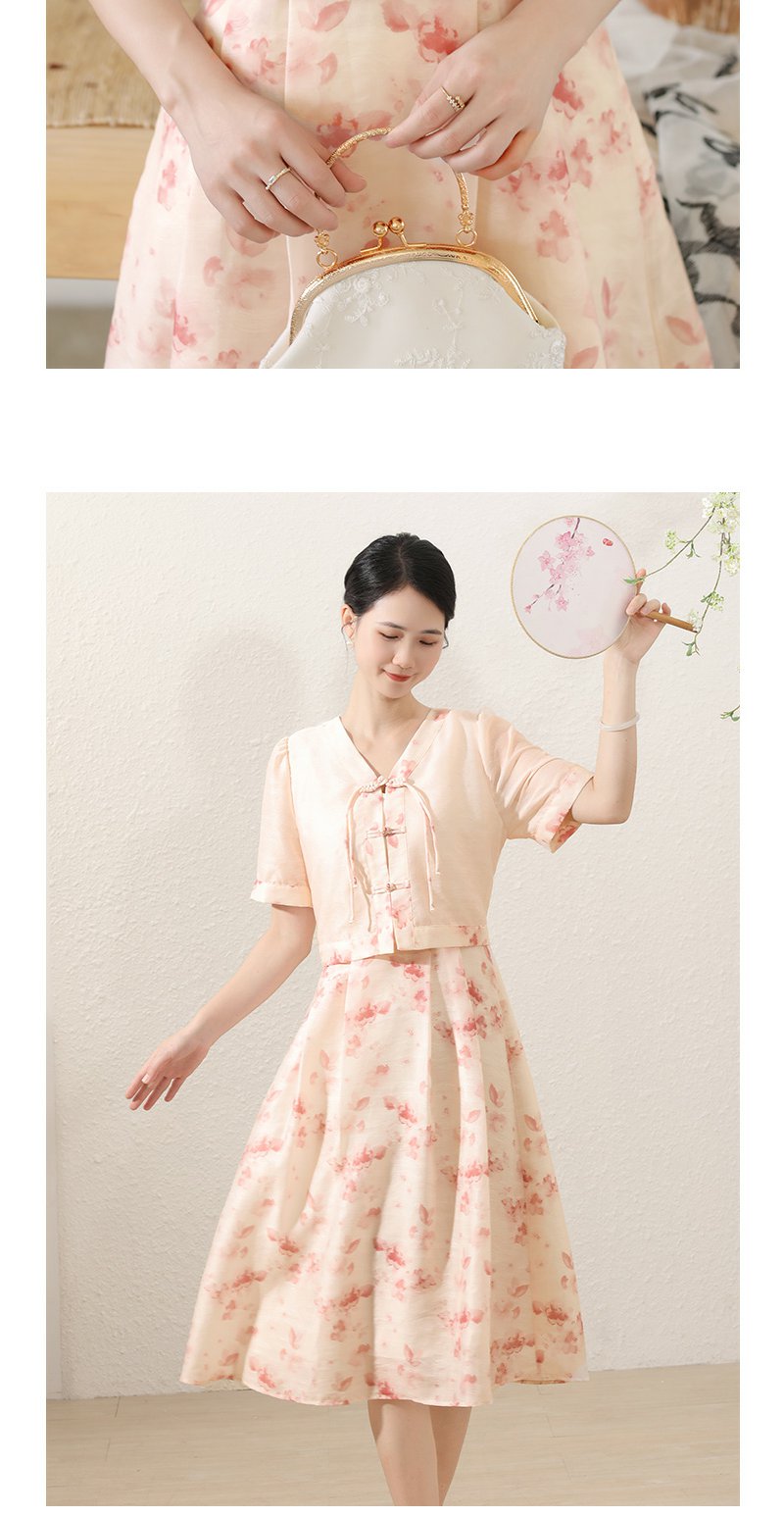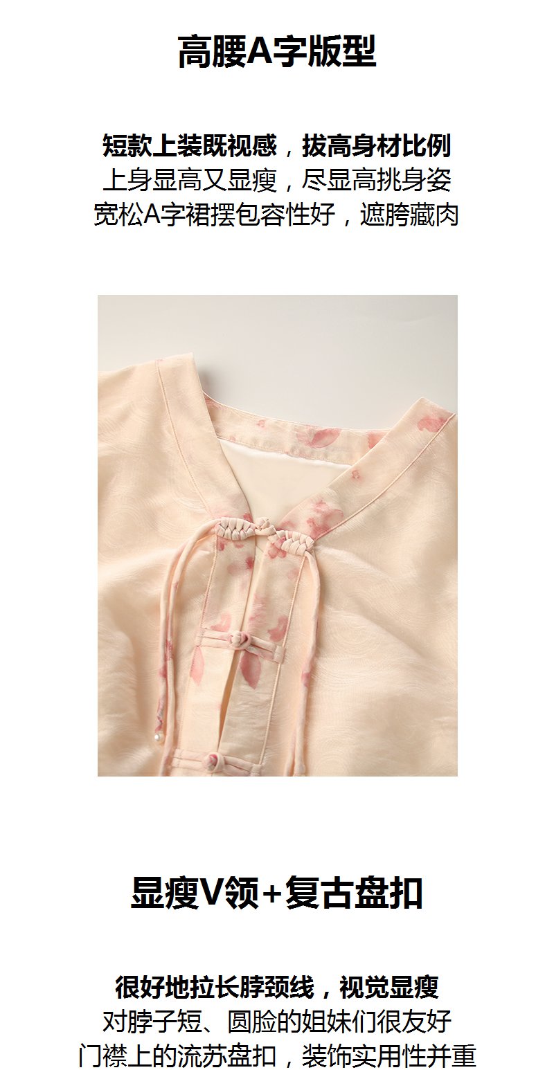 未风粉色显瘦V领连衣裙女夏2025新款夏季高腰新中式国风短袖裙子