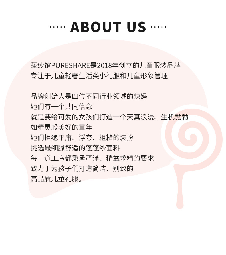 - PureShare蓬纱馆,2018年创立的儿童服装品牌,专注于儿童轻奢生活类小礼服,主张“让孩子做最独特的自己”的品牌理念,为孩子们提供时尚简洁、优雅而又不失童真的生活类礼服。