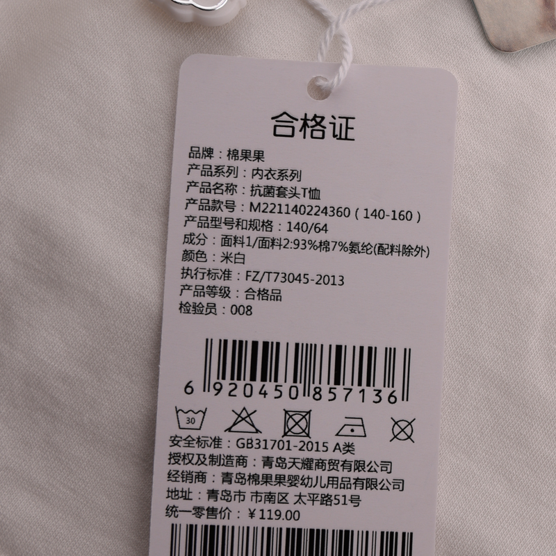 棉果果夏季新品5A抗菌纯棉140-160码女童套头T恤M221140224360