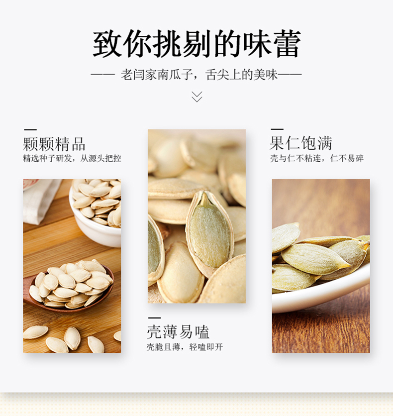 老闫家南瓜子三代人用心坚守每一颗南瓜子执行同一个标准,严选产区,15道工序,坚持古法炒制10次,层层质检严控,只为每一颗好南瓜子。