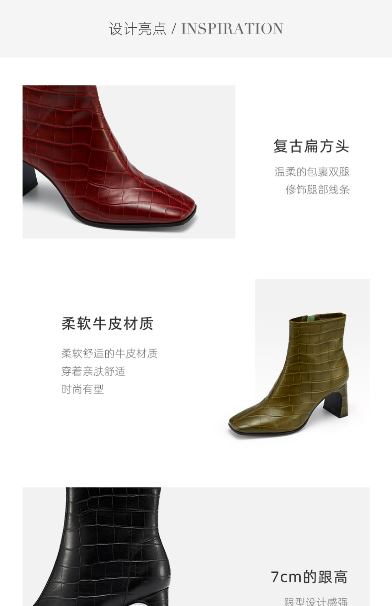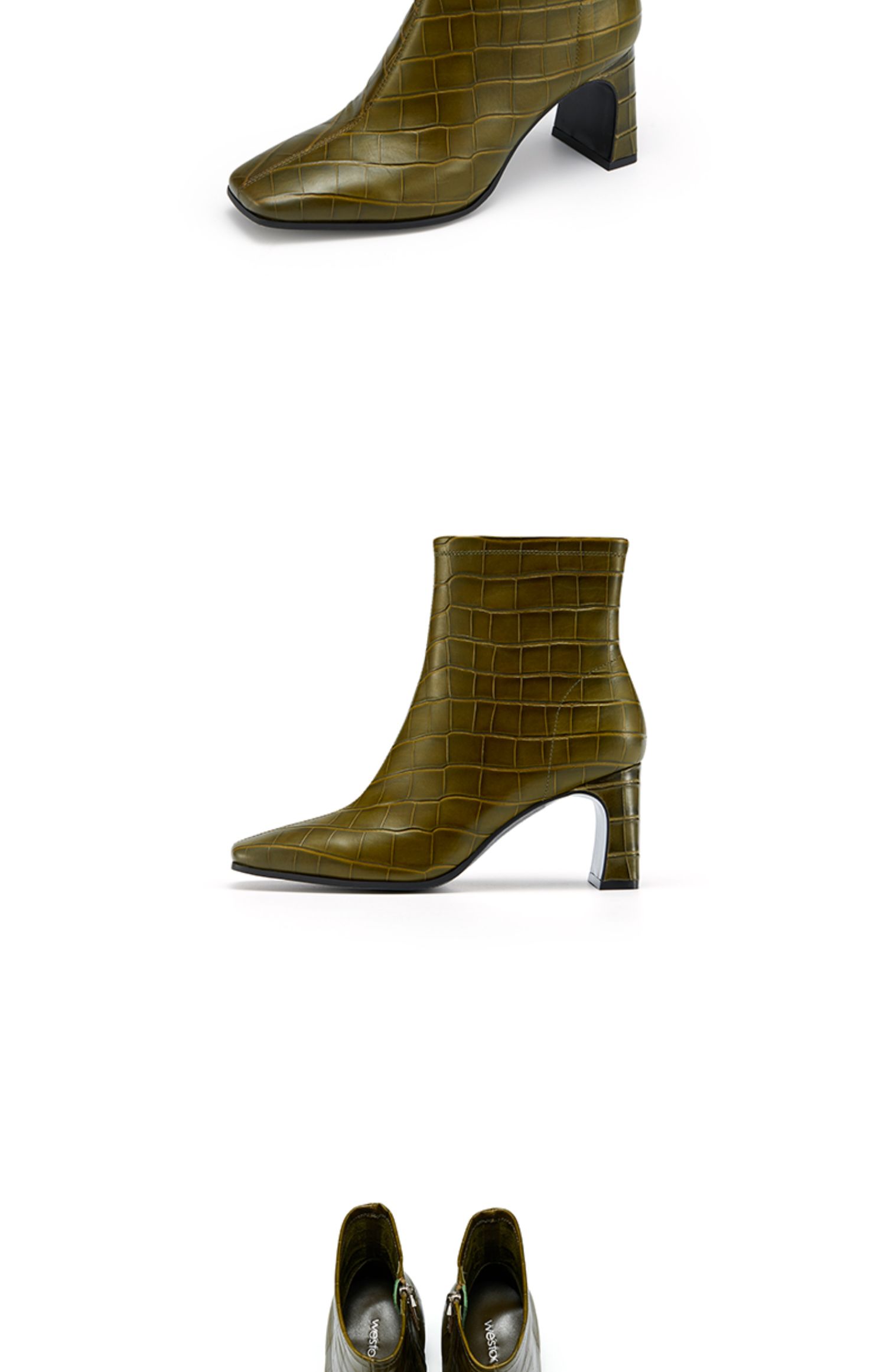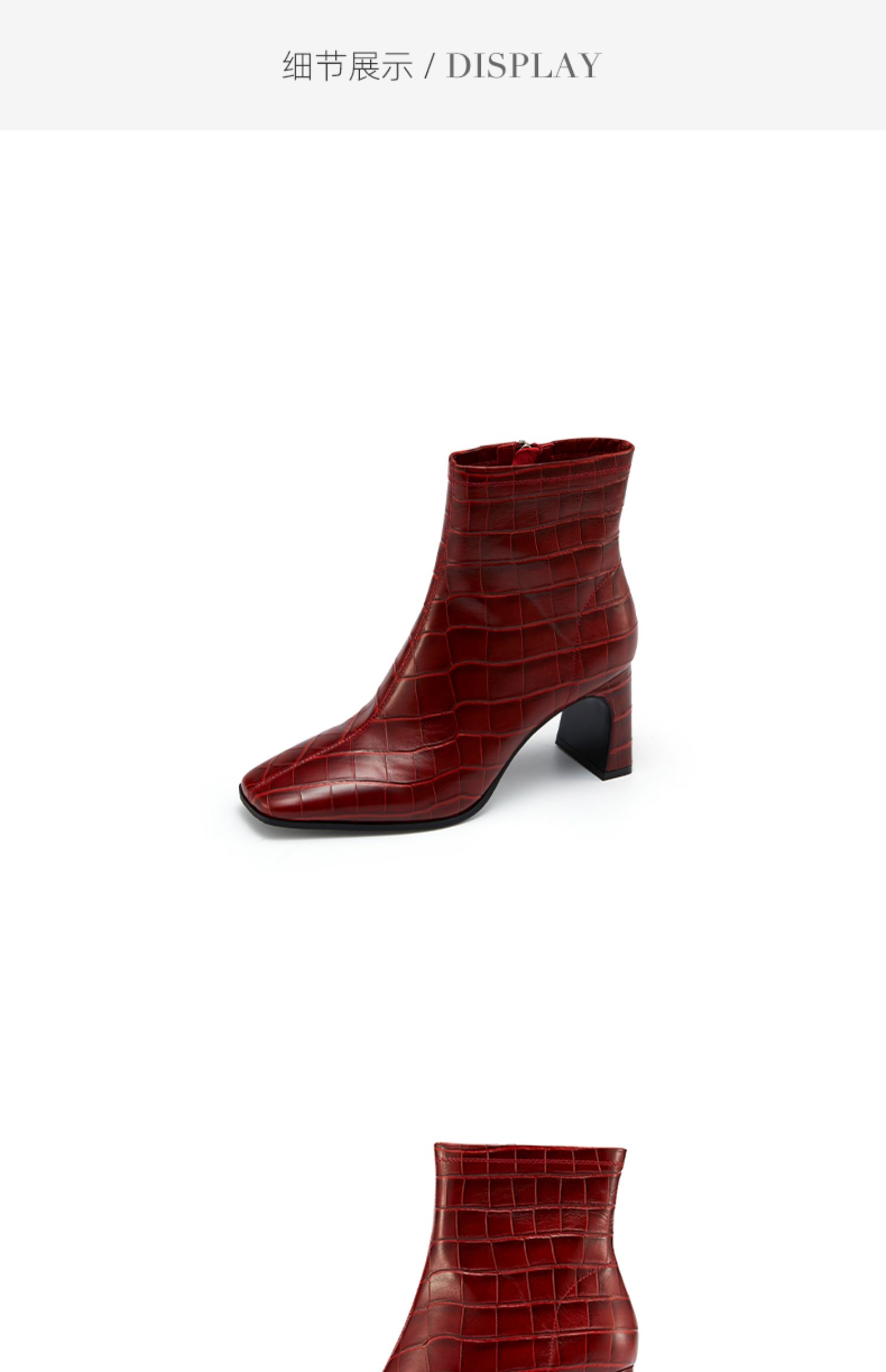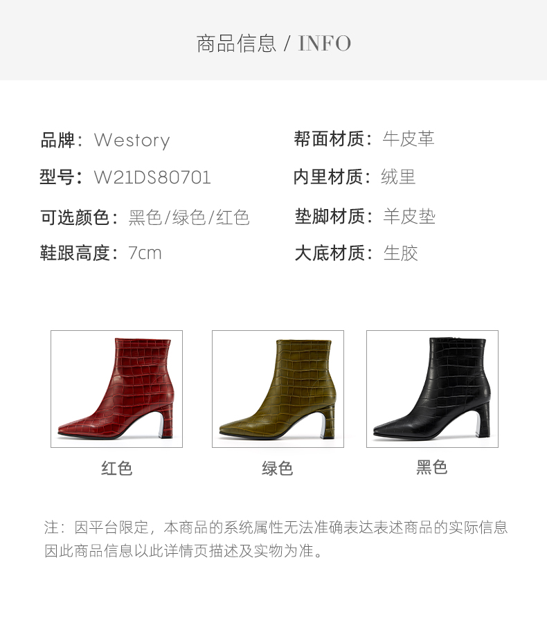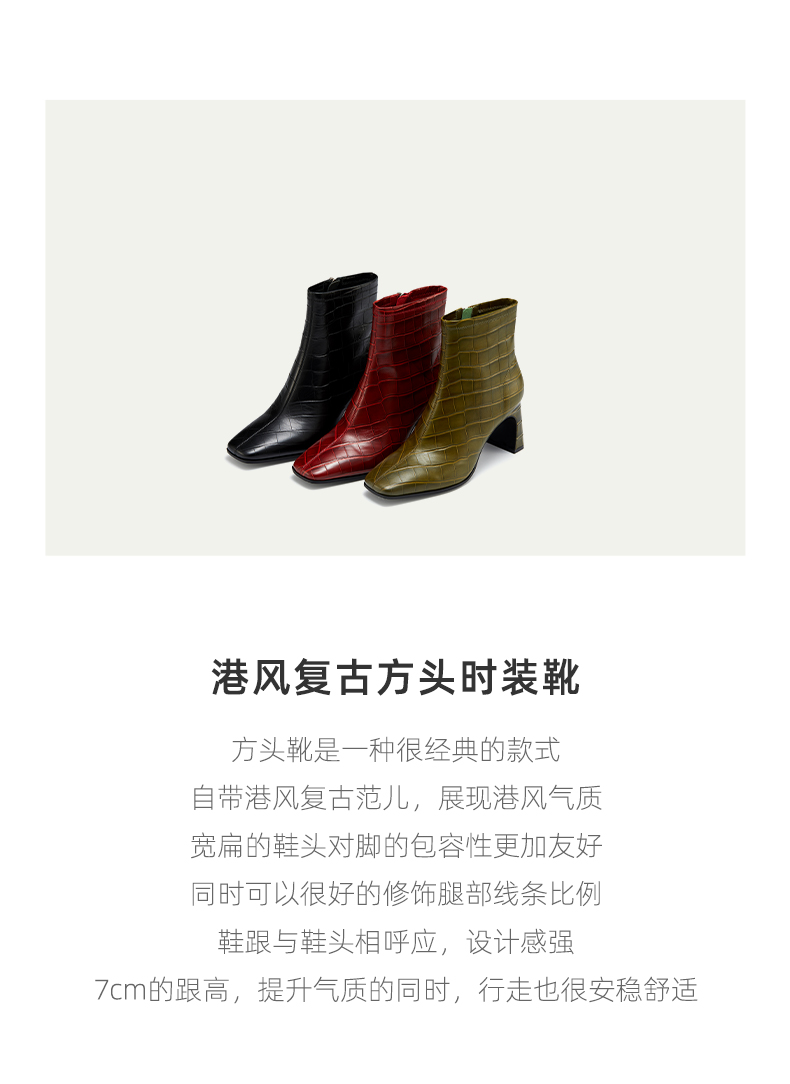 westory2021秋季新款方头粗跟短筒靴子时尚复古石纹W21DS80701