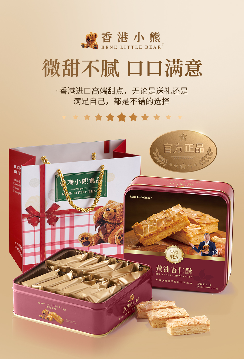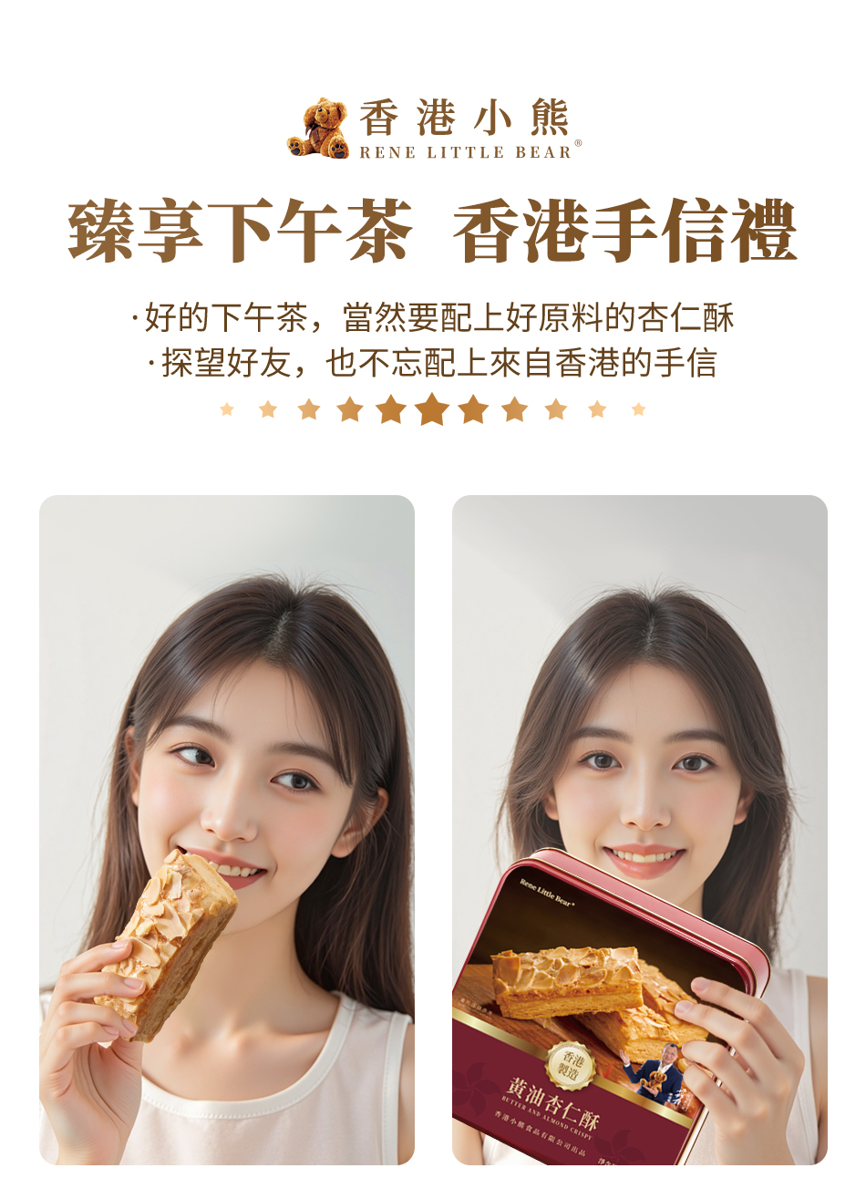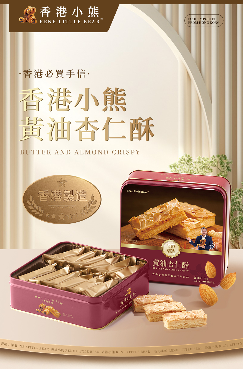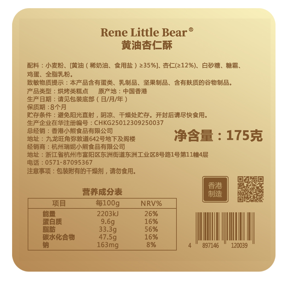 【顺丰包邮】Rene Little Bear 香港小熊 黄油杏仁酥 175g