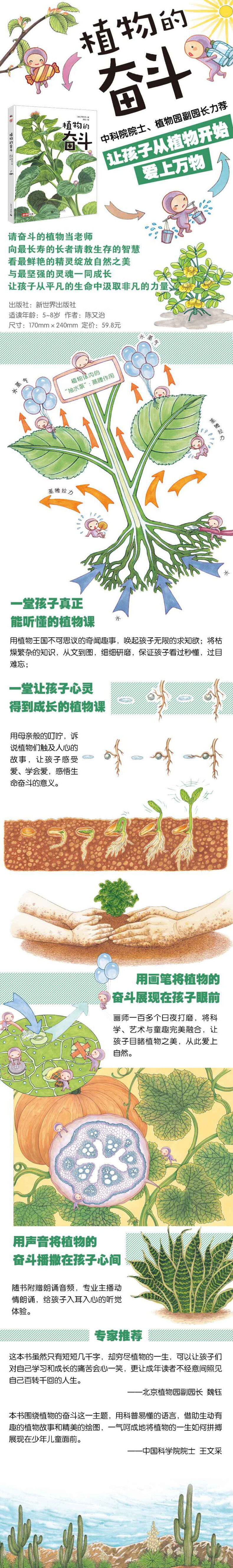 这本书短短六千字,却穷尽植物的一生。 这本书有孩子的视角,诗人的情感,科学家的严谨。 这本书是这样开始的: 爸爸妈妈为了一家人的生活忙碌;你呢,也忙着上学,忙着游戏;动物们忙着到处找东西吃。 在忙碌的生活里,你看到青青的树、红红的花,也许会羡慕地想:植物真舒服,日子过得多悠闲,不用读书,不用做事,就能长高长大。 如果我告诉你,植物也都很忙,它们也要工作,也要努力奋斗,才能生活,你相信不相信呢? ——这,不就是孩子想说的吗? 那么,植物究竟是怎样为了生活而奋斗的呢? 一粒小小的种子,要破缝而出,生根发芽长叶,不仅要拼命吸收水分,沐浴阳光,用叶子里的无数“小工厂”,结合水、二氧化碳来制造食物养活自己;还要与昆虫、野兽等敌人开战;更要与各种天灾人祸抗争,甚至必须要有生病的智慧,才能让自己纤弱的身体活下去。这样的奋斗、这样的努力,这样历经坎坷却永不放弃的精神,可以让孩子对......