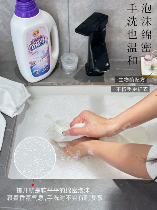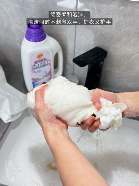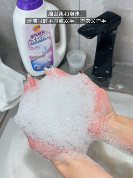 搓开就是软乎乎的绵密泡沫,裹着香氛气息,手洗时不会有刺激感,连娇贵面料都能放心搓,洗完衣服软乎乎的~ 洗完的衣服带着淡淡的香氛气息,不是冲鼻的化工味,是像刚晒过太阳的清新感,贴身穿连香水都省了~