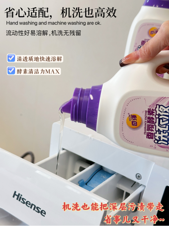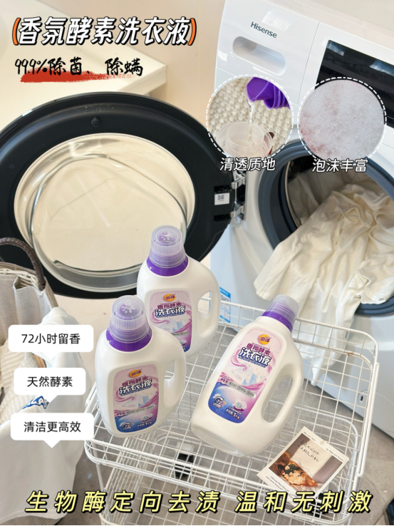 清洁力+酵素加持:含天然酵素+椰子油皂基,能针对性分解污渍,清洁更高效; 香氛持久:主打72小时留香,兼顾清洁与留香体验;