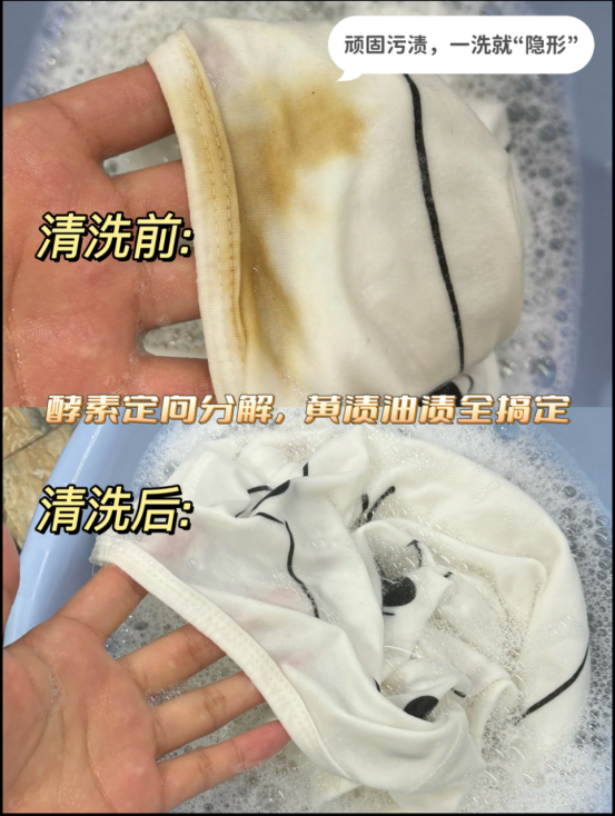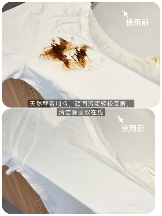 领口发黄、吃饭溅的油点?倒上它泡10分钟,轻轻一搓就干净,洗完像新衣服一样透亮,不用再心疼旧衣啦~ 白T恤、白吊带用它洗,不会越洗越黄,反而越洗越透亮,和彩色衣服混洗也不容易串色,白衣党直接锁死~