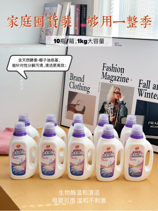 不用费劲搓揉,直接倒进洗衣机槽,清透质地快速溶解,配合酵素清洁力,机洗也能把深层污渍带走,省事儿又干净~ 按家庭每周3次洗衣量算,这一箱够你用小半年!1kg单瓶好拿易倒,整箱囤更划算,不用总跑超市补洗衣液啦~