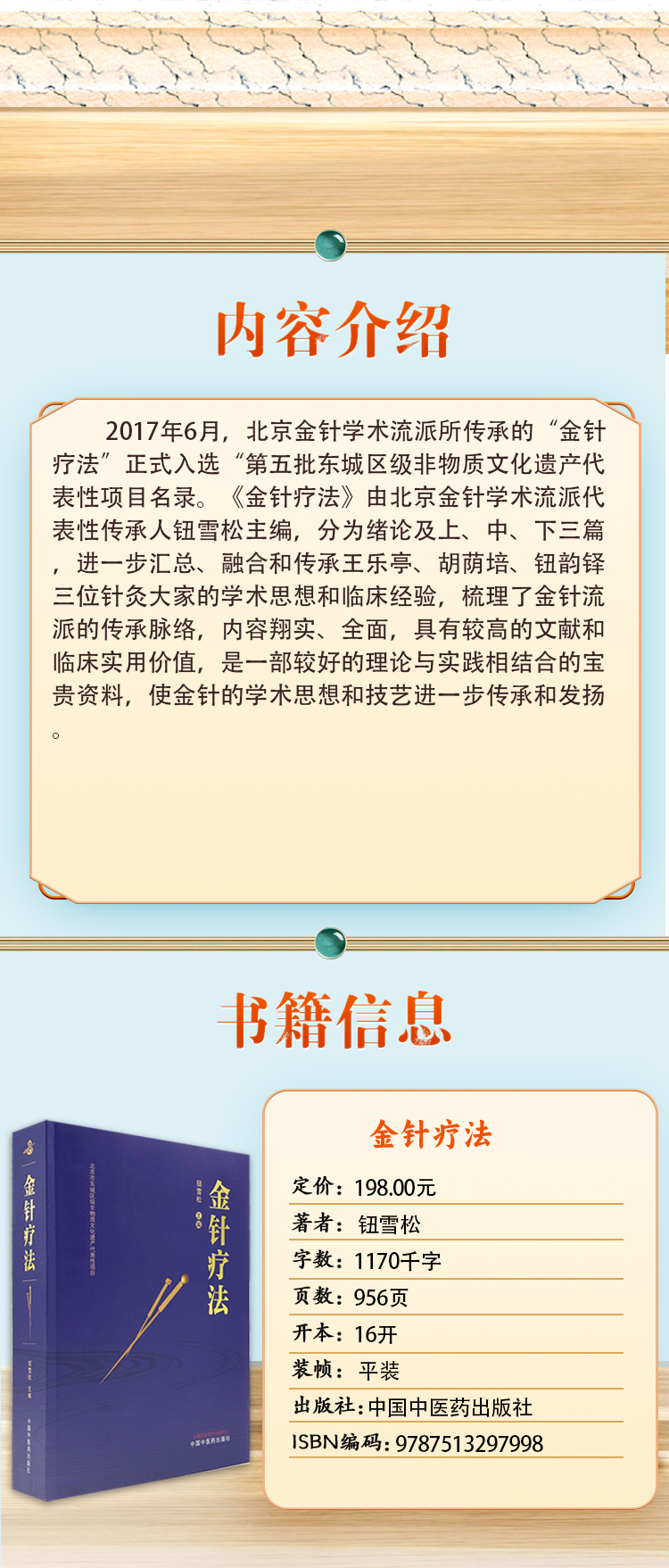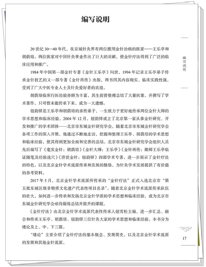 2017年6月,北京金针学术流派所传承的“金针疗法”正式入选“第五批东城区级非物质文化遗产代表性项目名录。《金针疗法》由北京金针学术流派代表性传承人钮雪松主编,分为绪论及上、中、下三篇,进一步汇总、融合和传承王乐亭、胡荫培、钮韵铎三位针灸大家的学术思想和临床经验,梳理了金针流派的传承脉络,内容翔实、全面,具有较高的文献和临床实用价值,是一部较好的理论与实践相结合的宝贵资料,使金针的学术思想和技艺进一步传承和发扬。