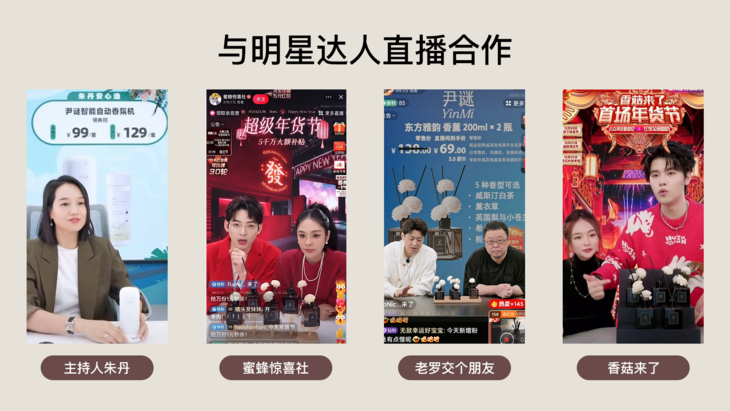 尹谜(YINMI)与多位明星、达人达成直播合作关系 (如著名主持人朱丹、蜜蜂惊喜社、老罗交个朋友、香菇来了等), 在抖音等直播平台取得较好的销售数据。