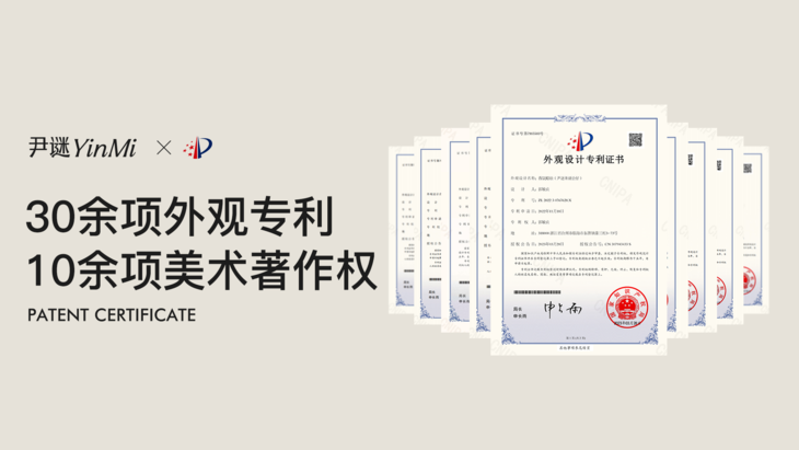 尹谜(YINMI)品牌拥有一支优秀且专业的产品设计师团队,从用户需求角度出发,结合产品实用性、美观度以及质价比,创造了多款爆款香氛(如东方雅韵无火香薰、观雨茶香系列、梦旅人融蜡灯等),现已拥有30余项外观专利及10余项美术著作权。