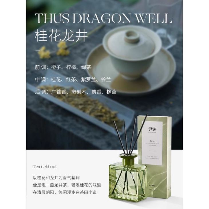 桂花龙井茶的相遇茶引花香,花益茶味 一股清甜的桂花香就混着茶香扑面而来!! 瞬间被治愈谁懂!😭就那种漫步在秋日的龙井茶园里 枝头桂花簌簌落在青石板上 空气里飘着焙火茶香与蜜渍桂花的甜香~ 介个 观雨无火香薰整个感觉就是晨露浸润过的龙井嫩芽🍃