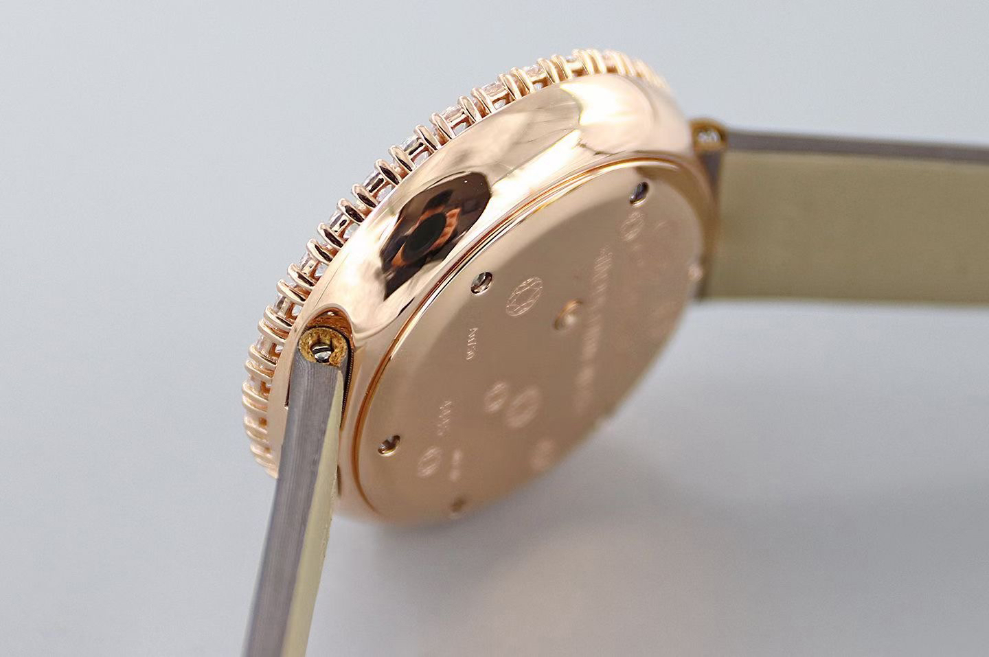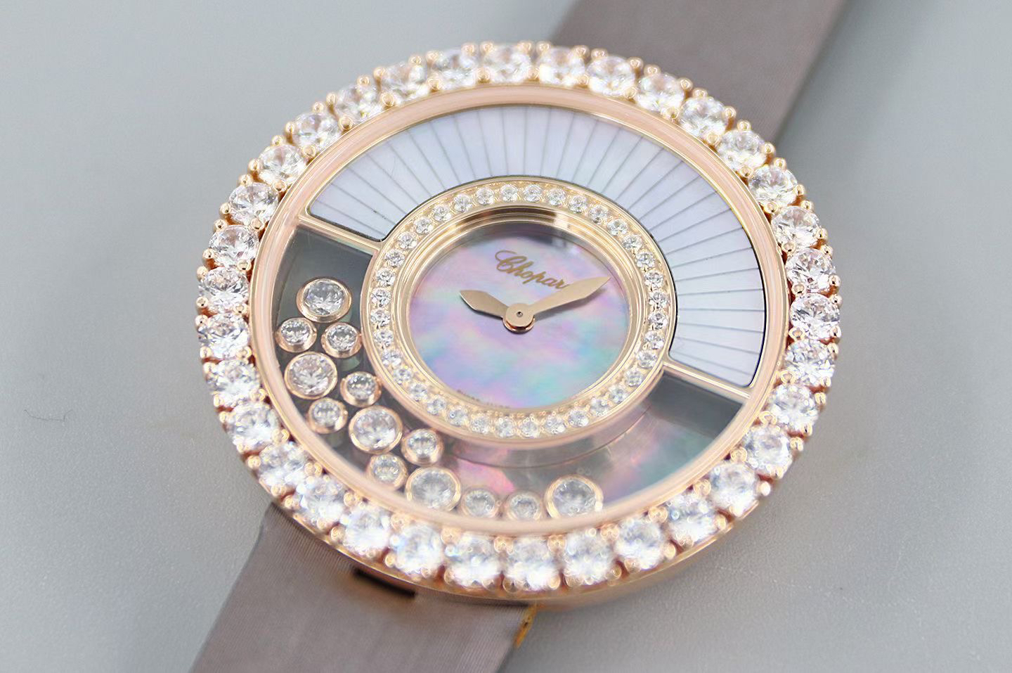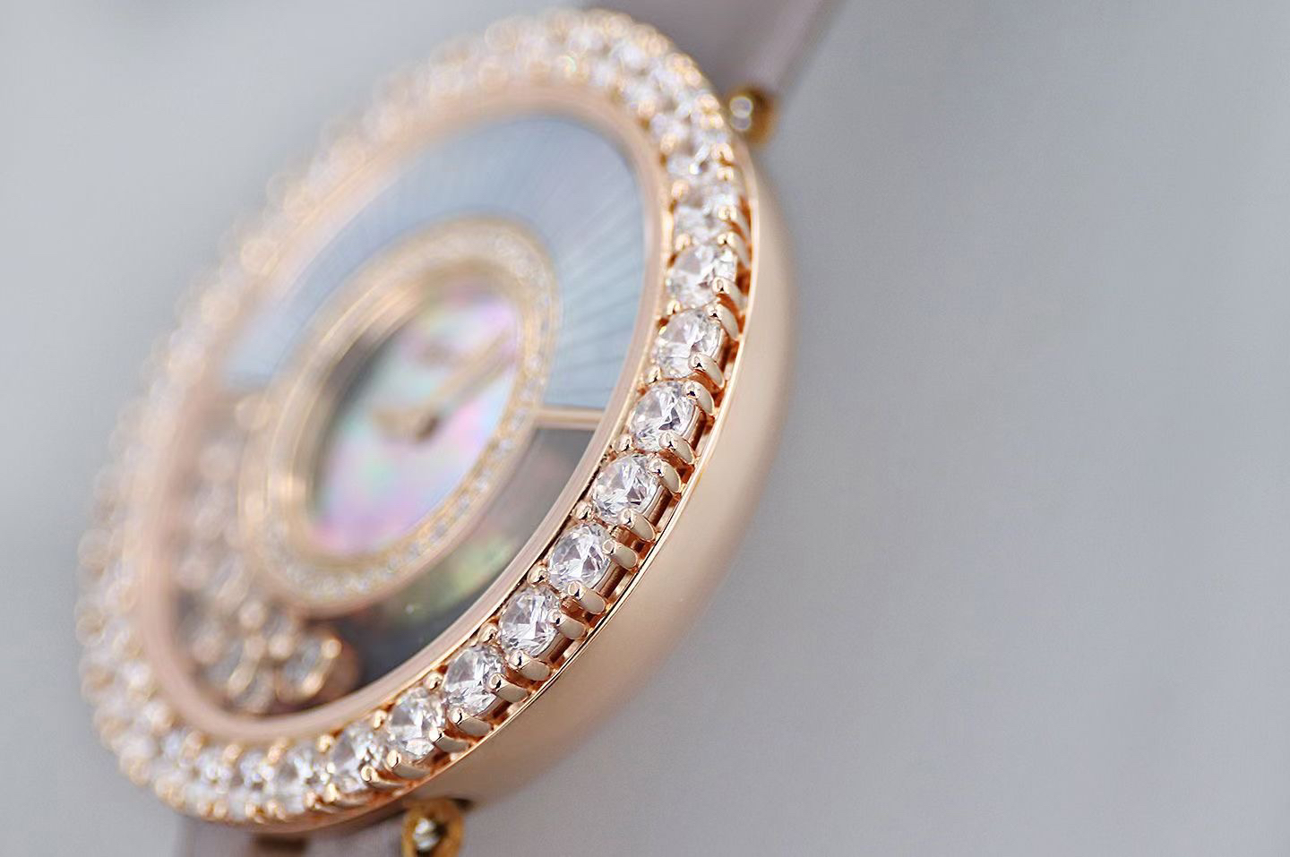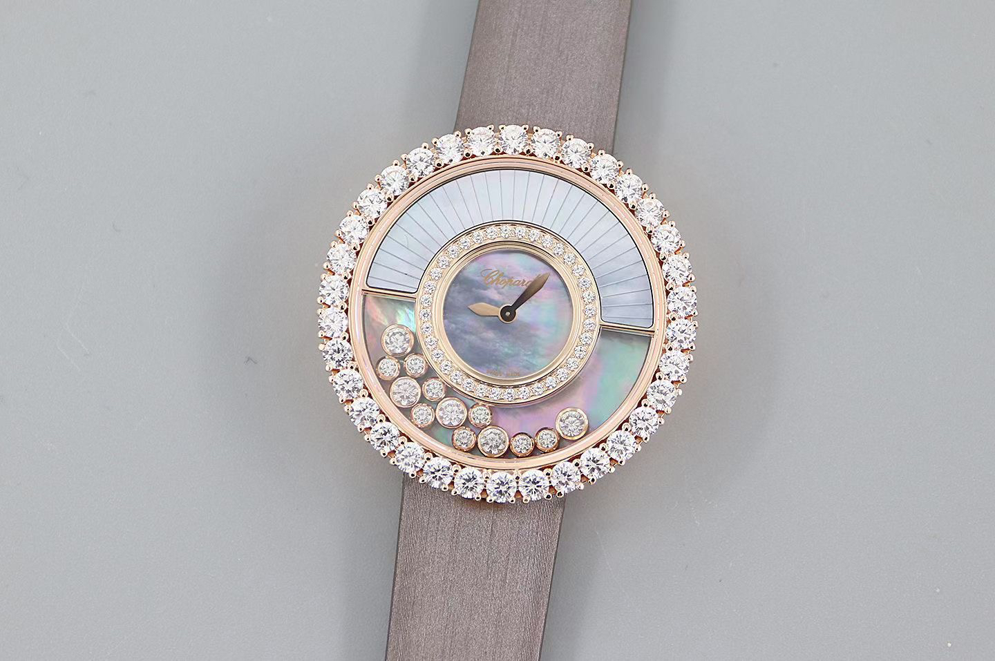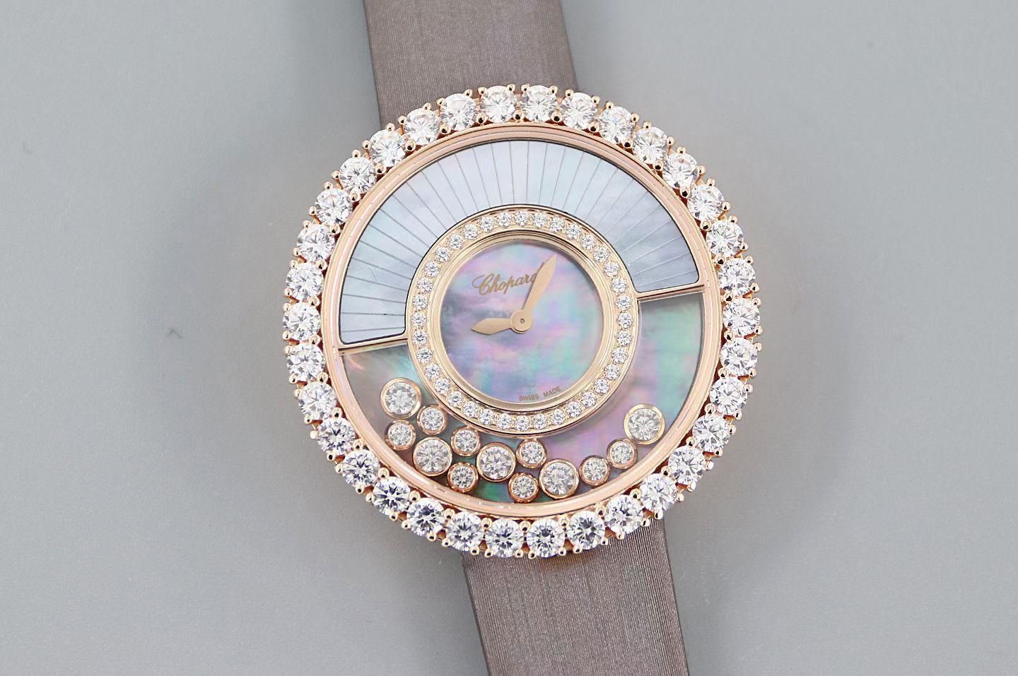 快乐钻HAPPY DIAMONDS,38mm 作为萧邦销的系列一直以细腻的手法诠释萧邦标志性灵动钻石的概念,2021年这系列推出了一款限量版全新的珠宝腕表,新作延续了Happy Diamonds腕表的经典元素,双层玻璃中间钻石滚珠能自由滑行旋转,让每一位女性都以最迷人的造型惊艳登场。这些可活动的钻石有两种不同大小,散落的瞬间就像从瀑布中飞溅出的水珠!