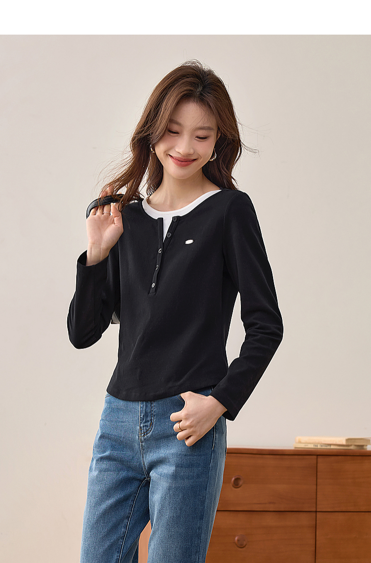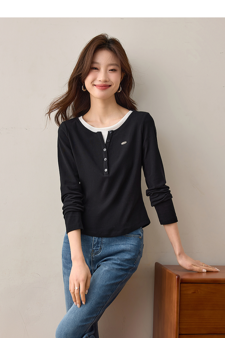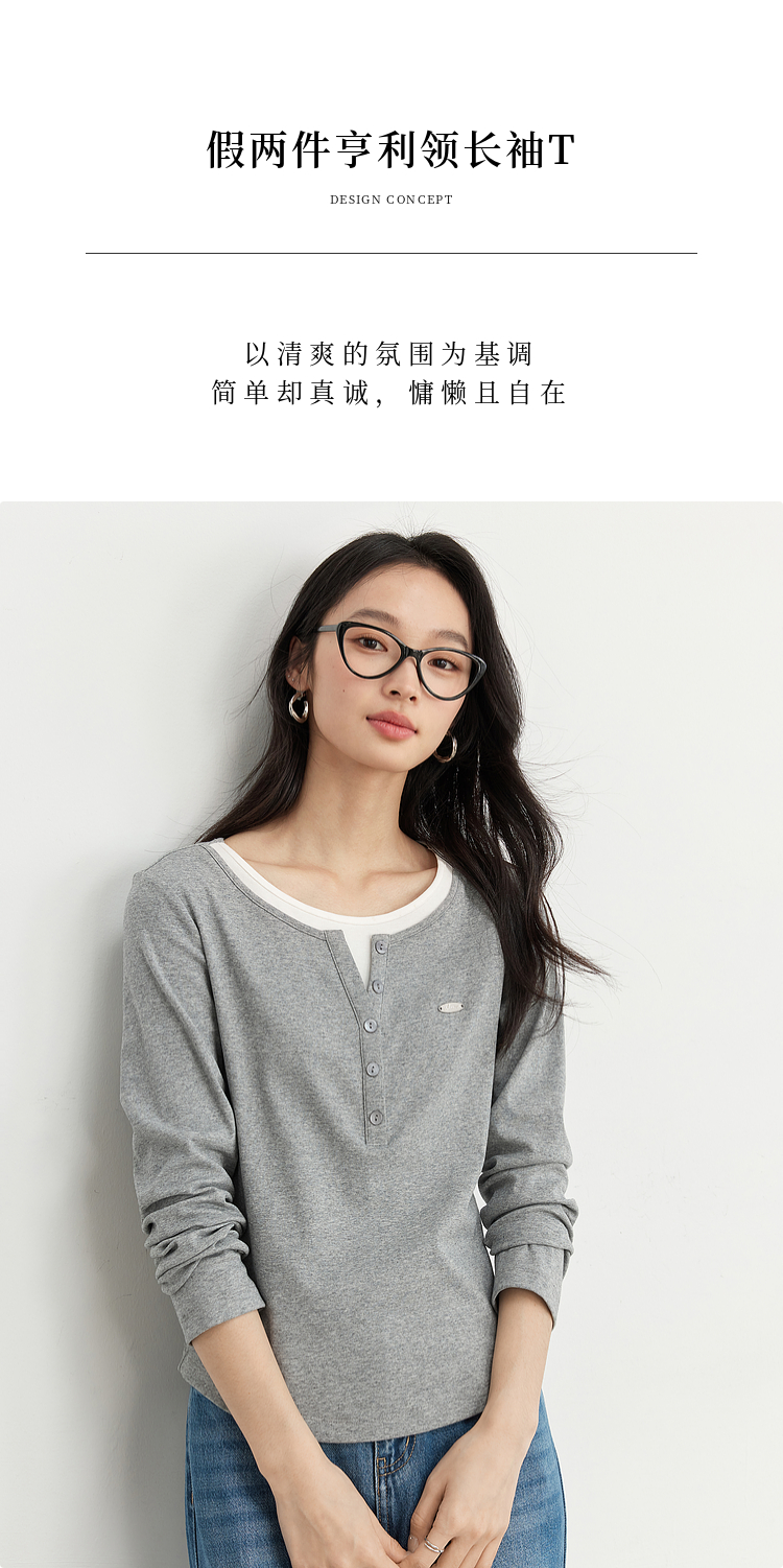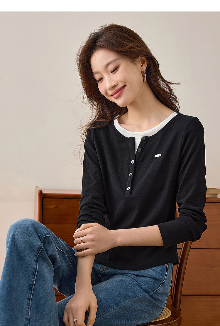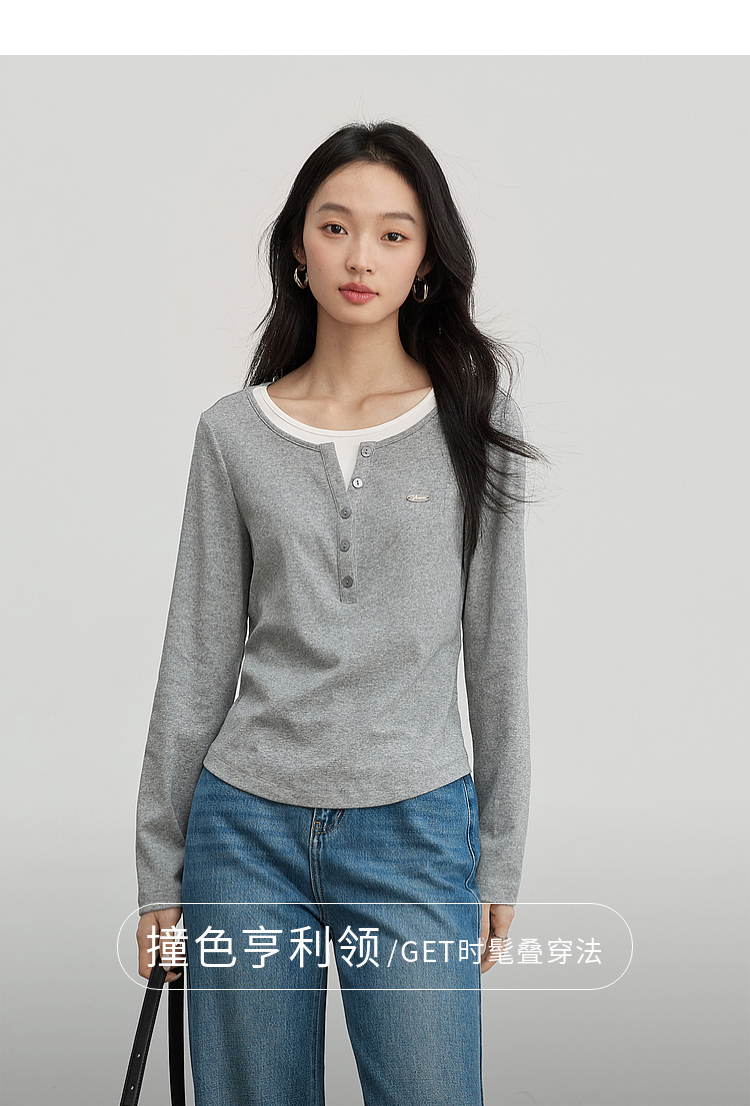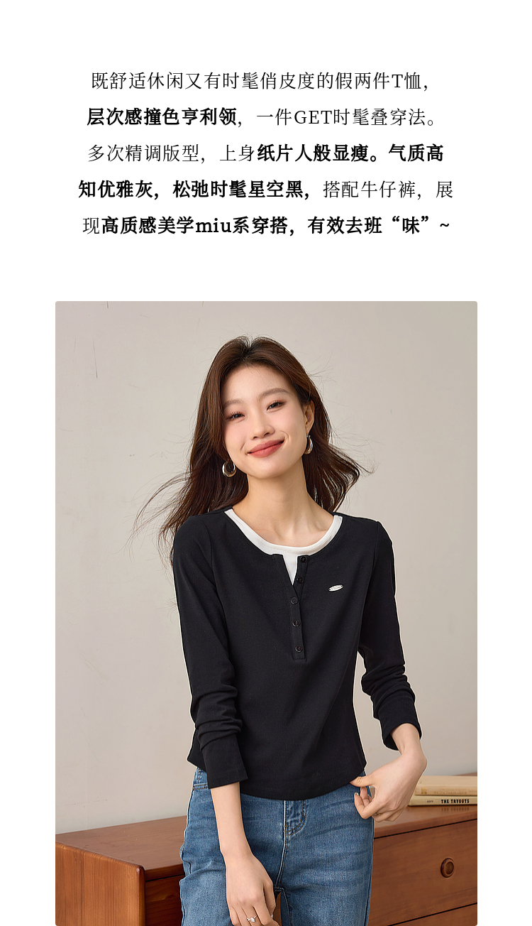 【春夏新品】熙世界熙世界法式撞色圆领假两件T恤长袖2025春秋新款长绒棉打底上衣
