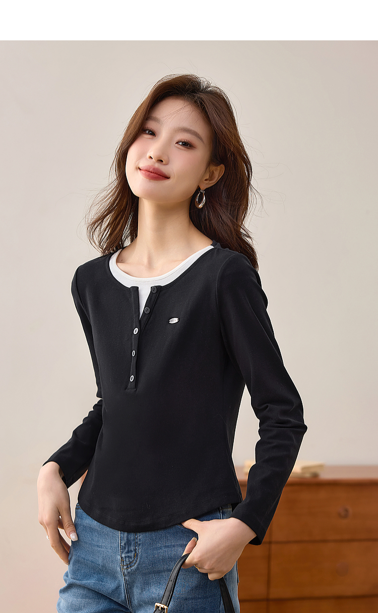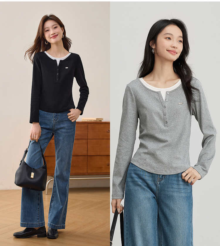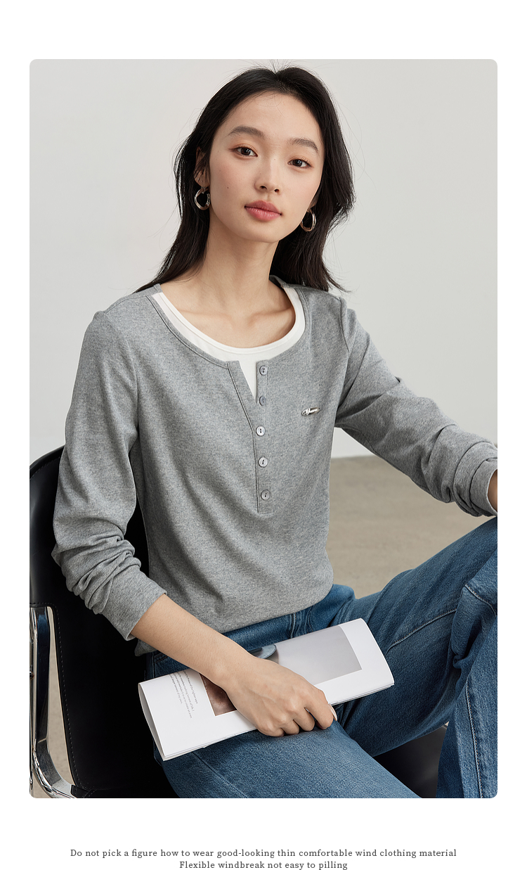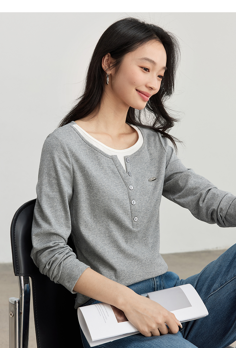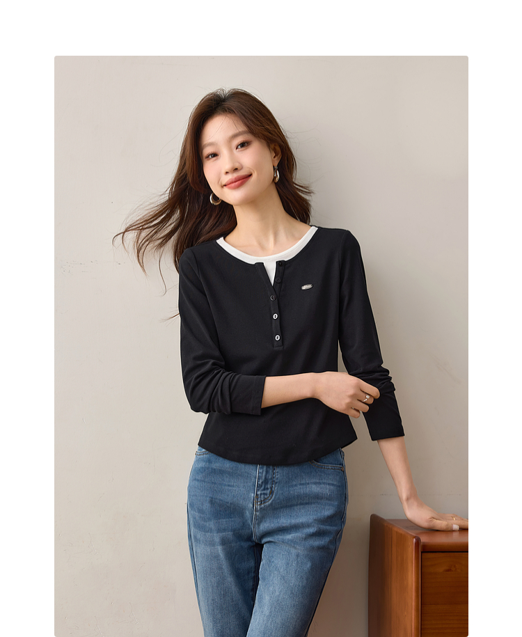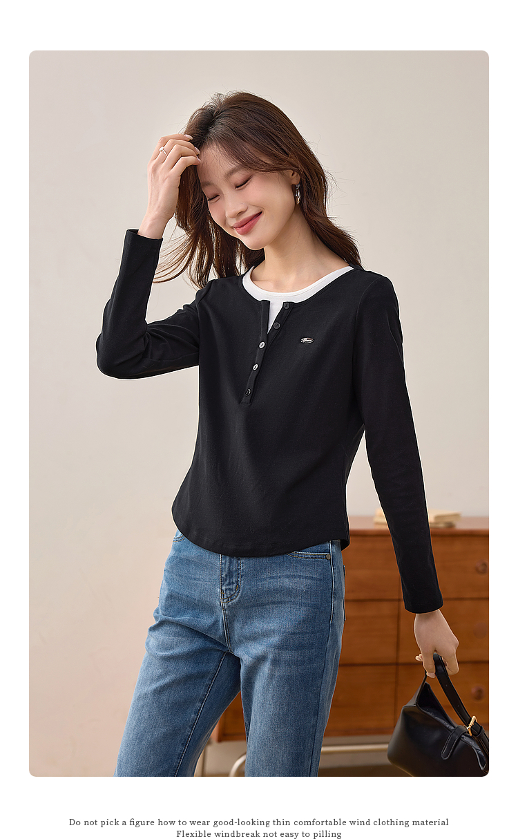 【春夏新品】熙世界熙世界法式撞色圆领假两件T恤长袖2025春秋新款长绒棉打底上衣