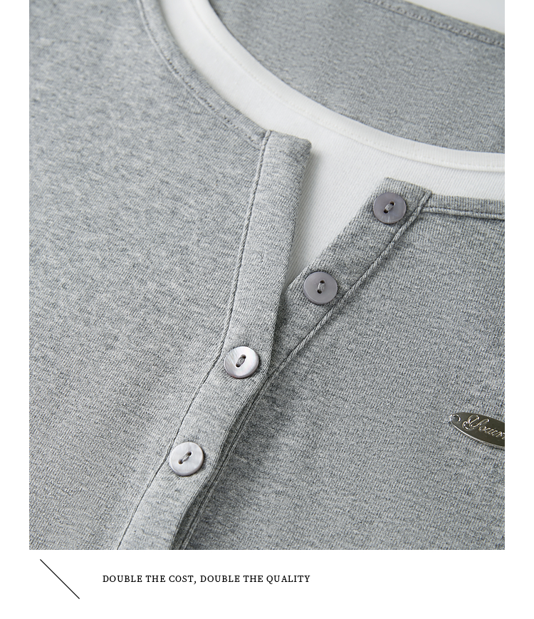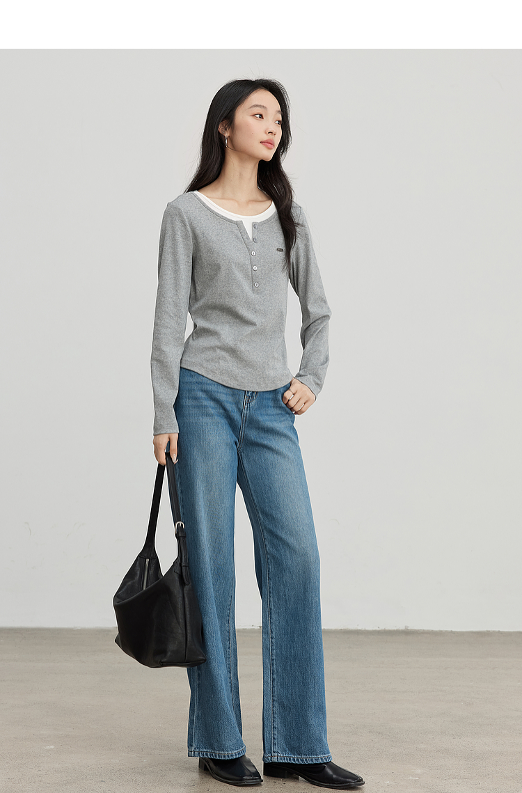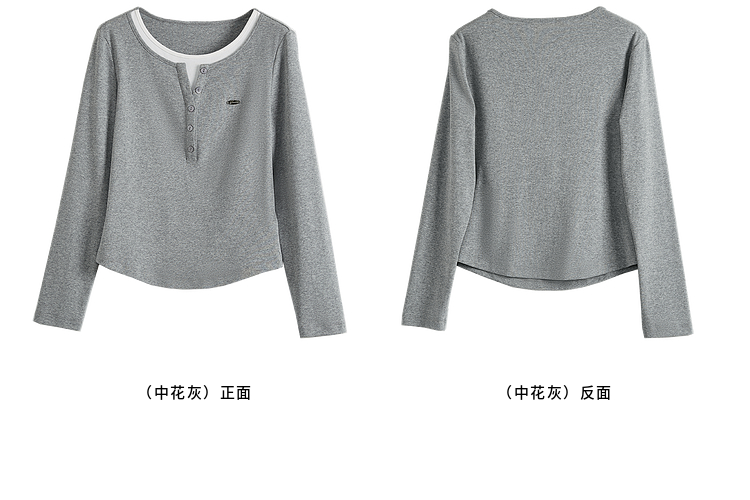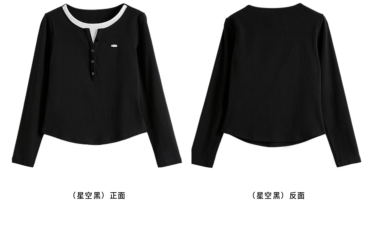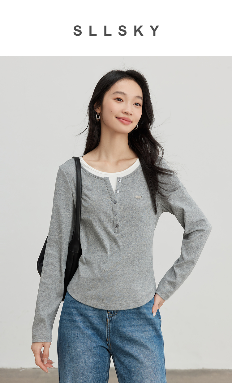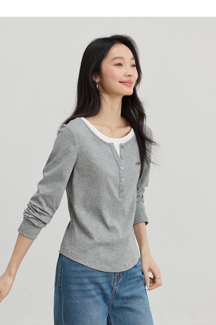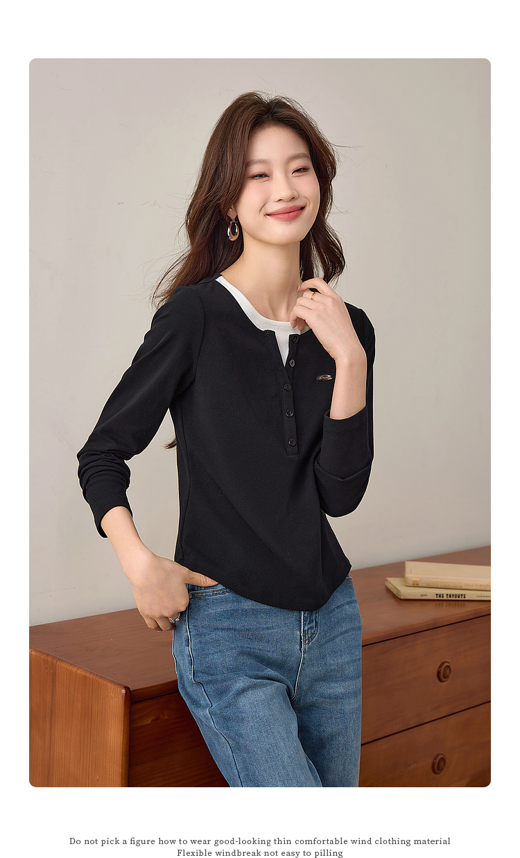 【春夏新品】熙世界熙世界法式撞色圆领假两件T恤长袖2025春秋新款长绒棉打底上衣