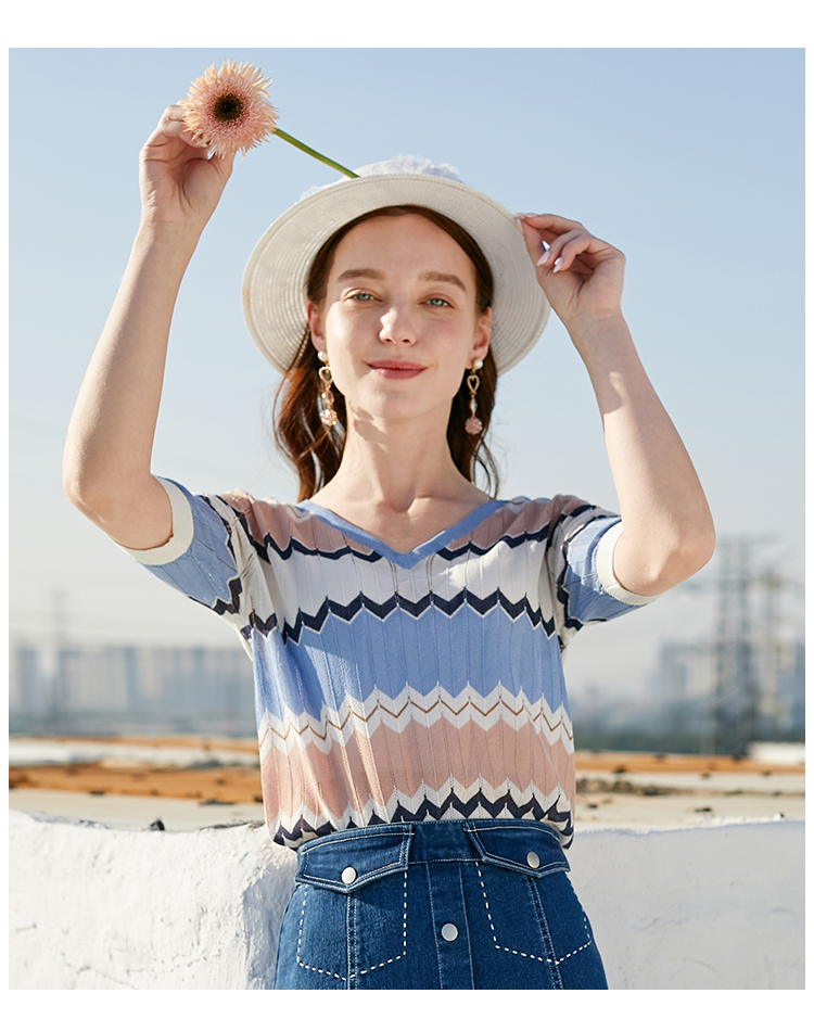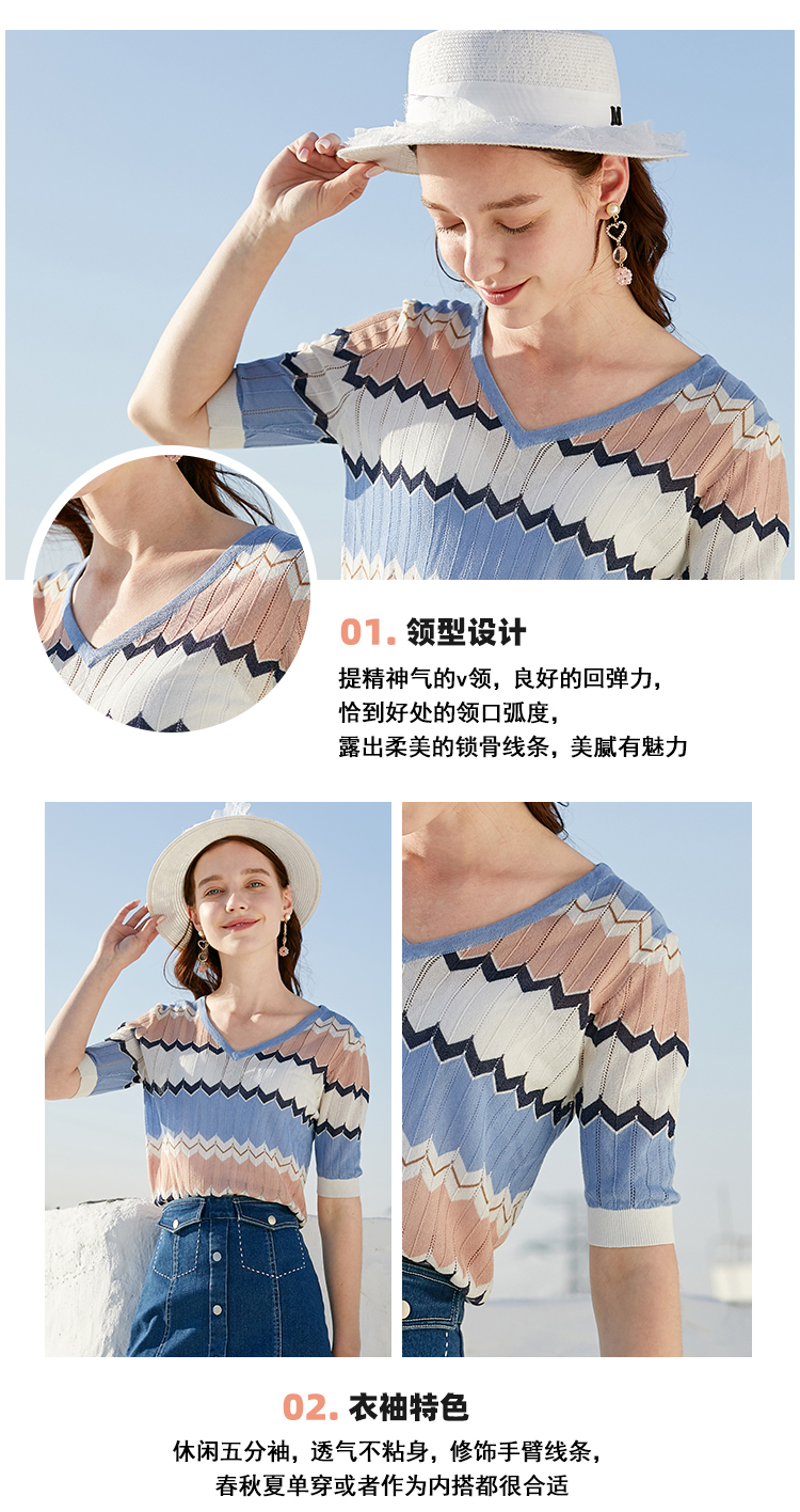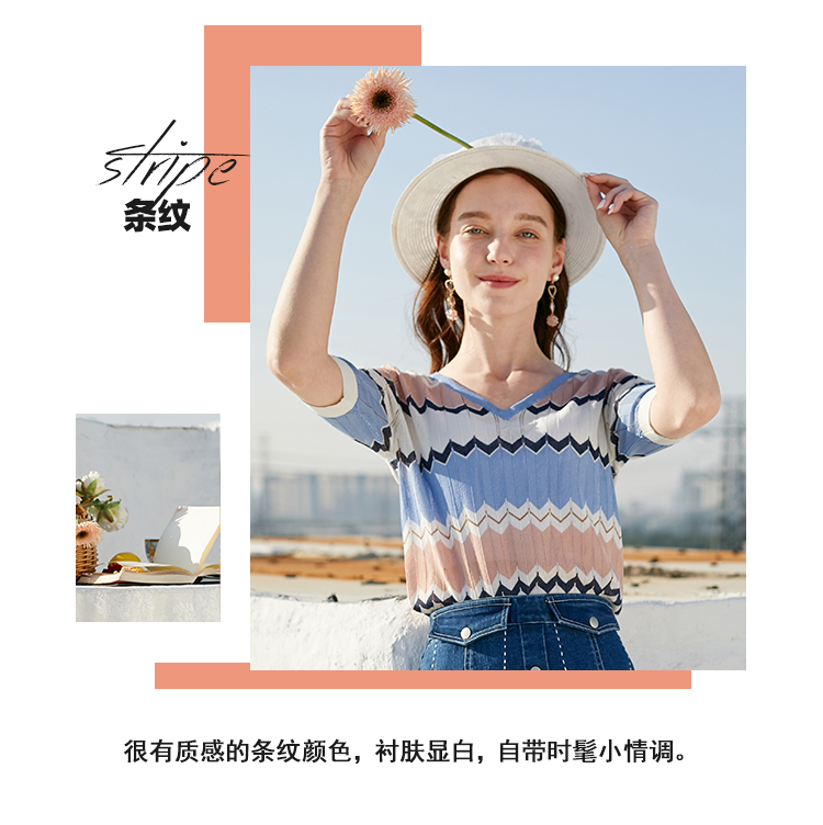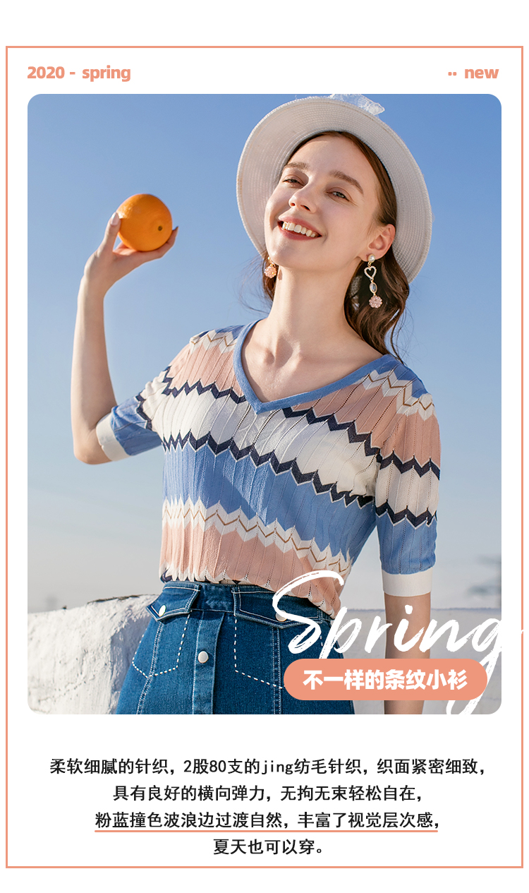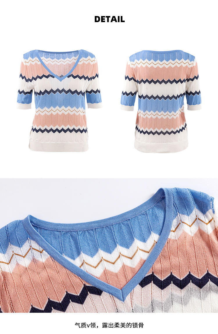 欧芮儿夏装新款V领短袖毛针织衫女拼色修身休闲上衣内搭打底