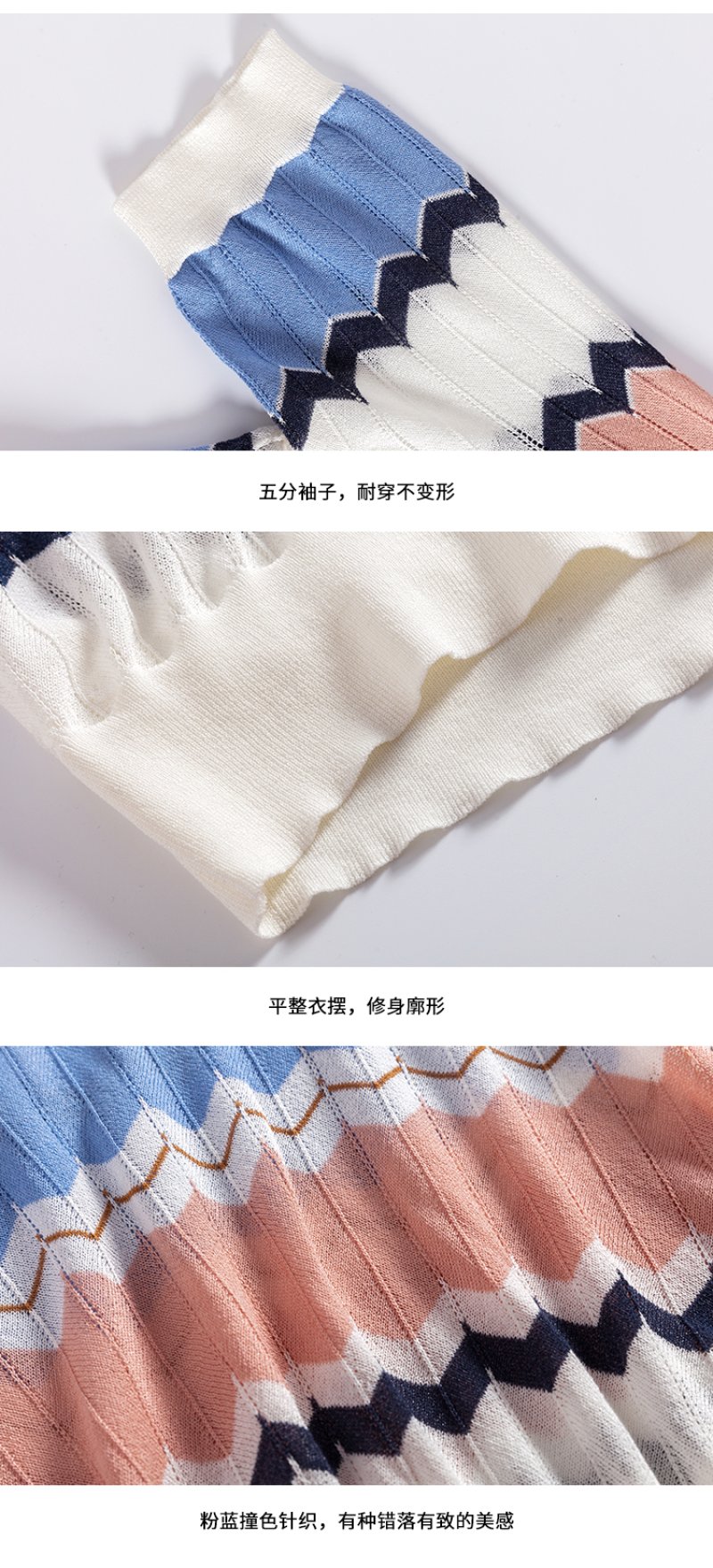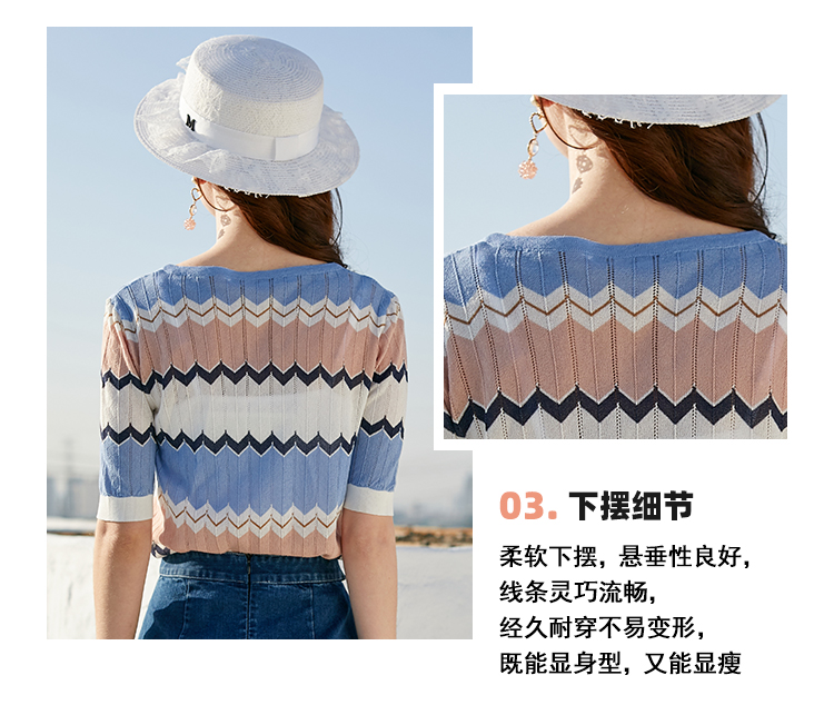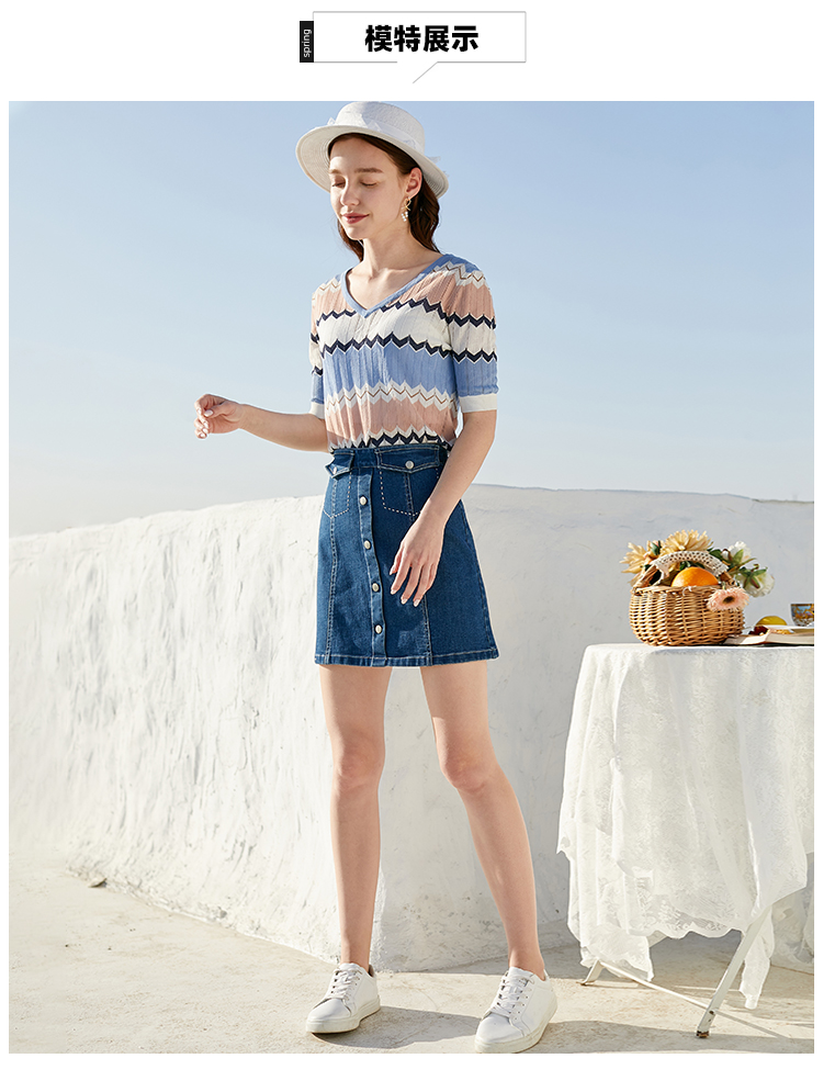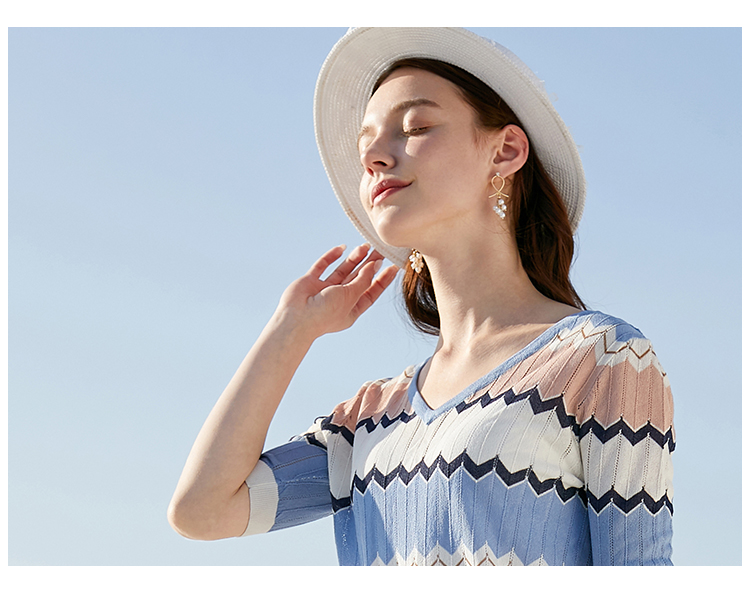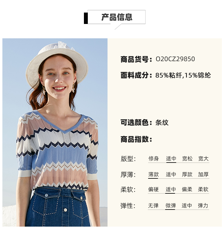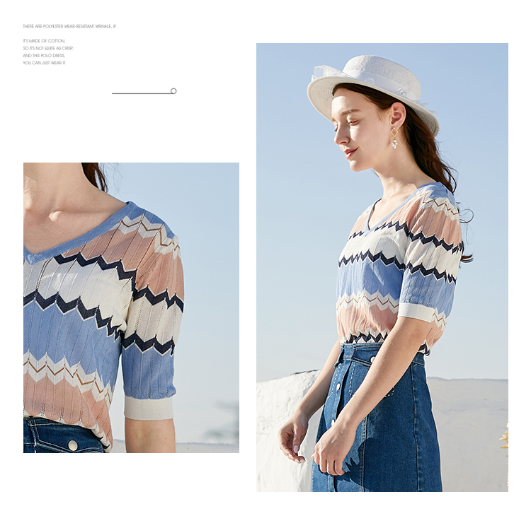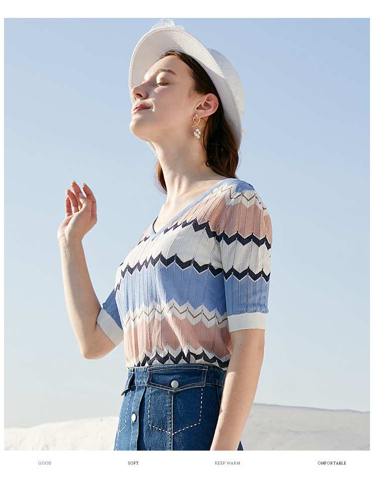 欧芮儿夏装新款V领短袖毛针织衫女拼色修身休闲上衣内搭打底