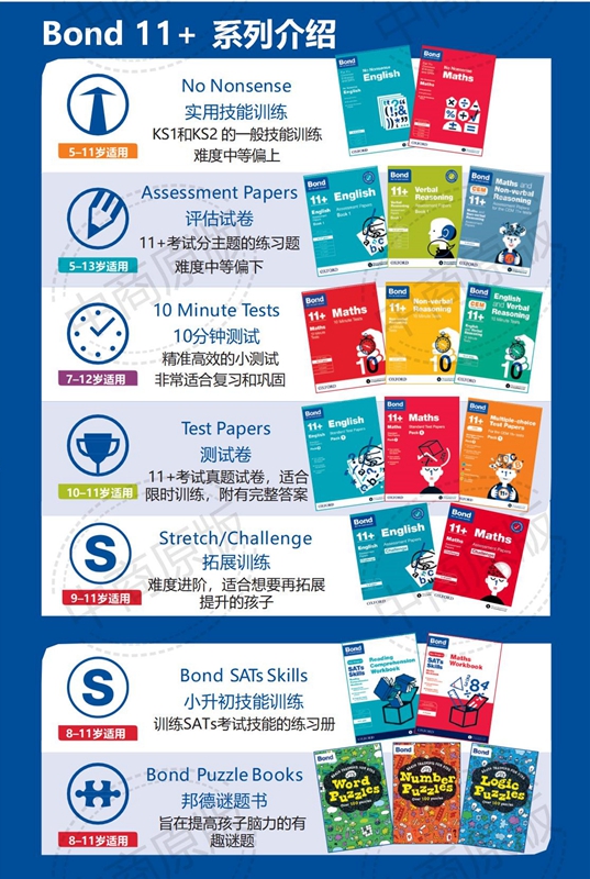 Bond 11+ 系列是英国牛津大学的出版物,在澳大利亚越来越受那些寻求不同类型的一般能力和推理问题的人欢迎。它为 5 至 13 岁的儿童提供有关英语、数学、语言推理和非语言推理的基本实践和支持。该系列面向参加选择性/入学考试的英国学生,例如 11+、普通入学考试或关键阶段 2 SAT、GL 评估和 CEM 11+ 考试。