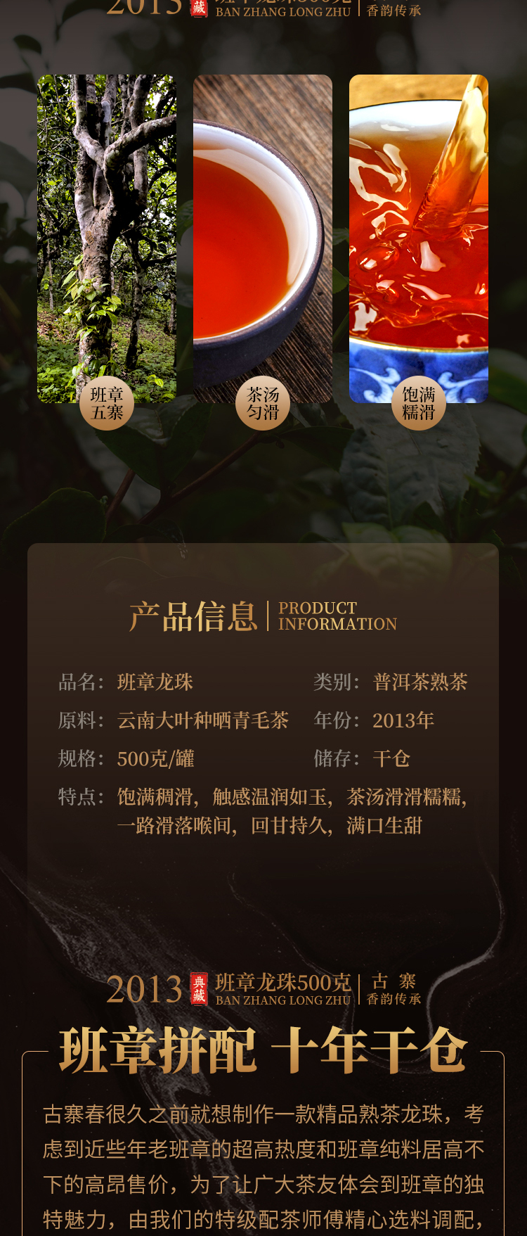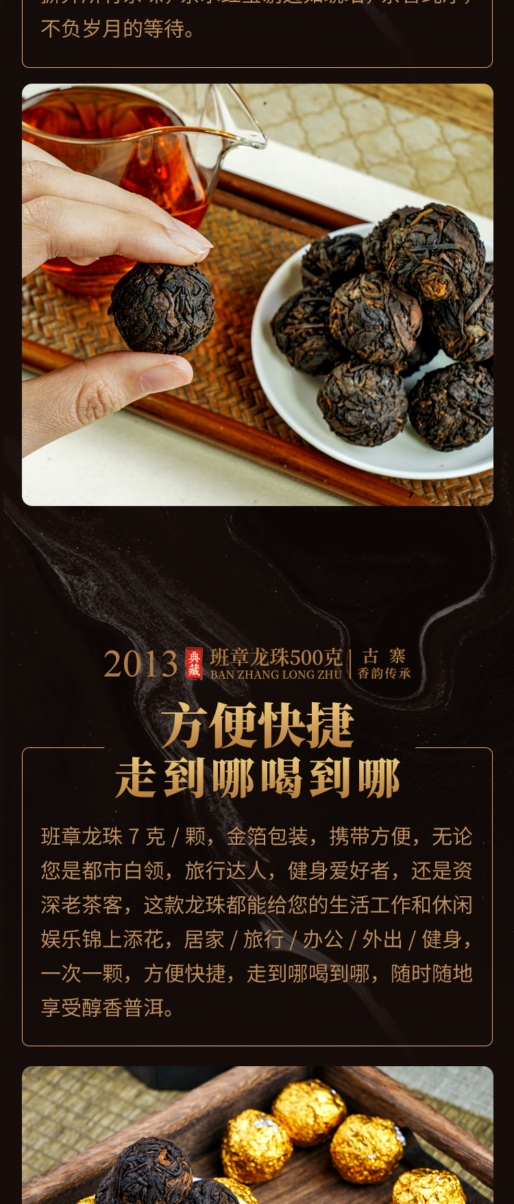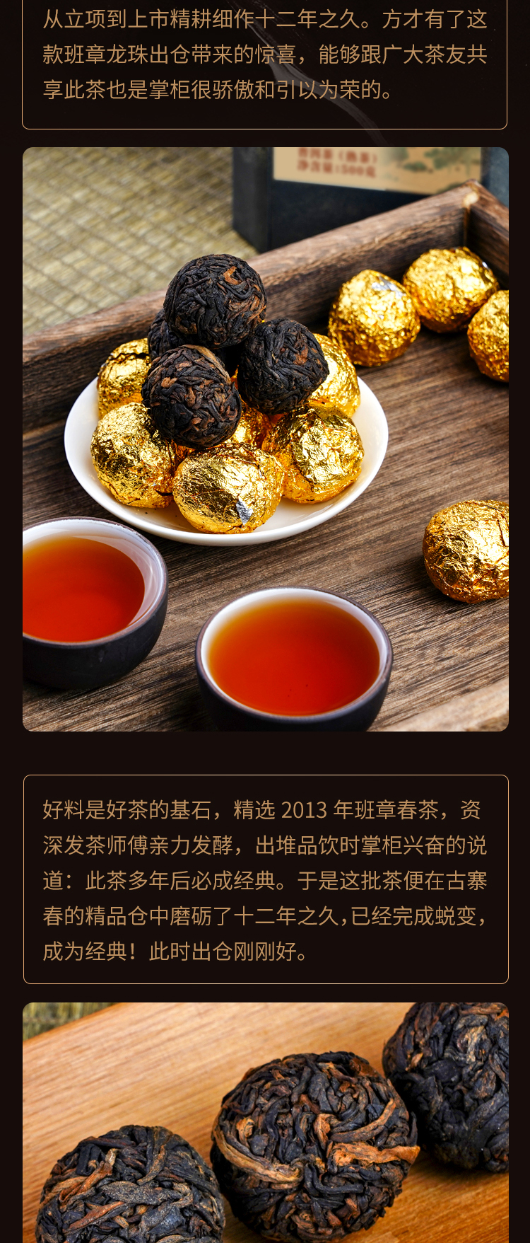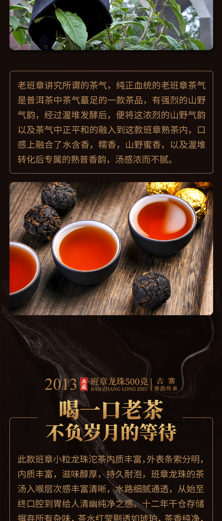 仅余几罐【班章熟茶龙珠】2013年勐海茶区班章拼配而成,甘醇香滑汤感厚实丰盈,500克/罐
