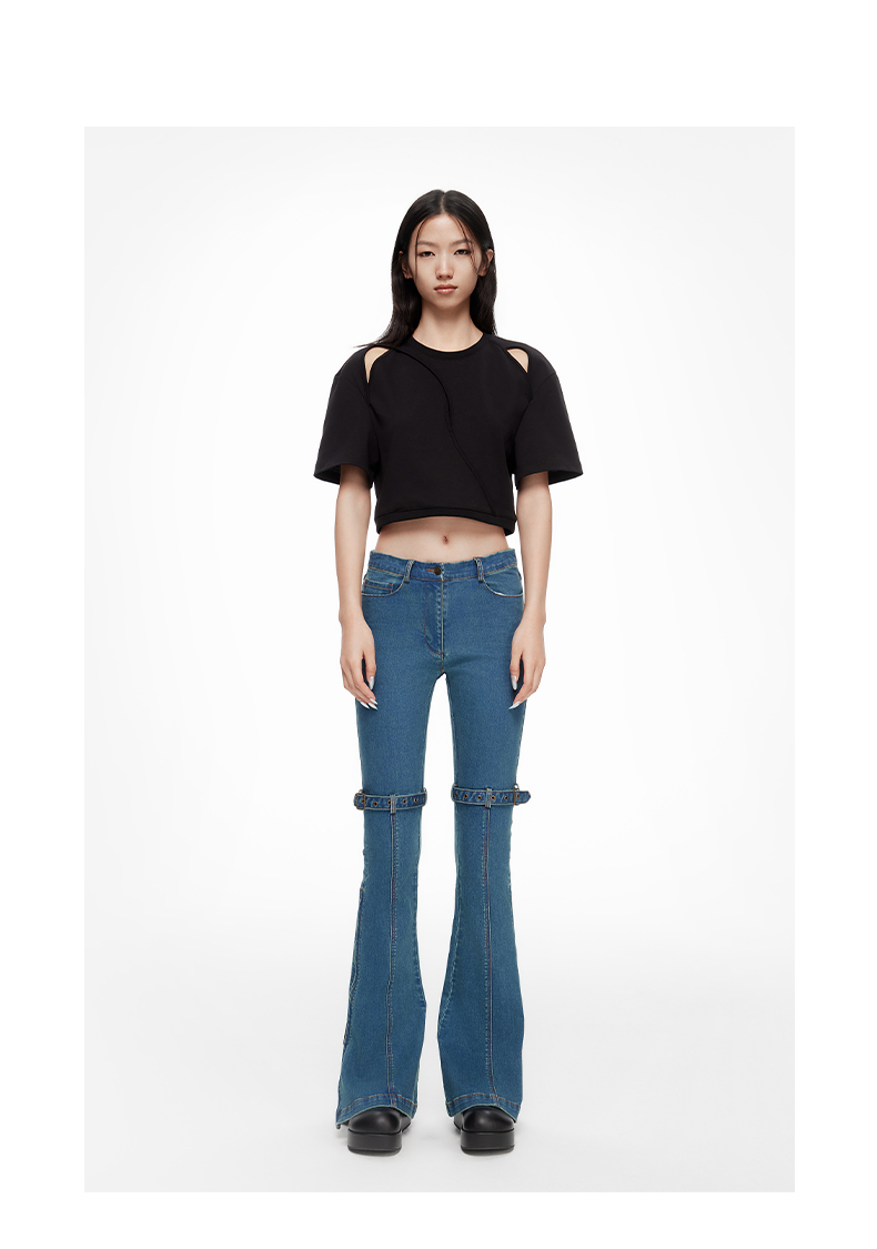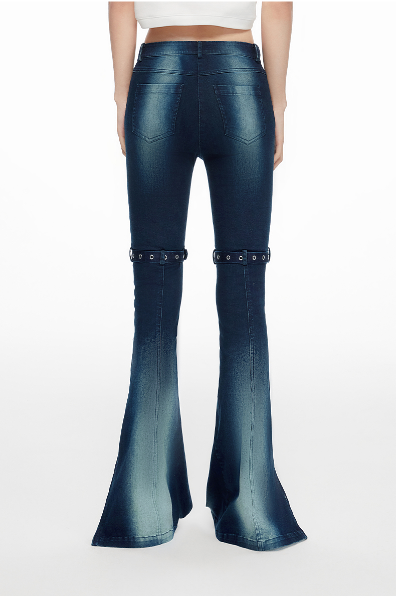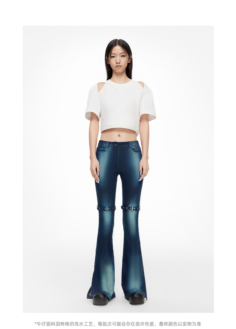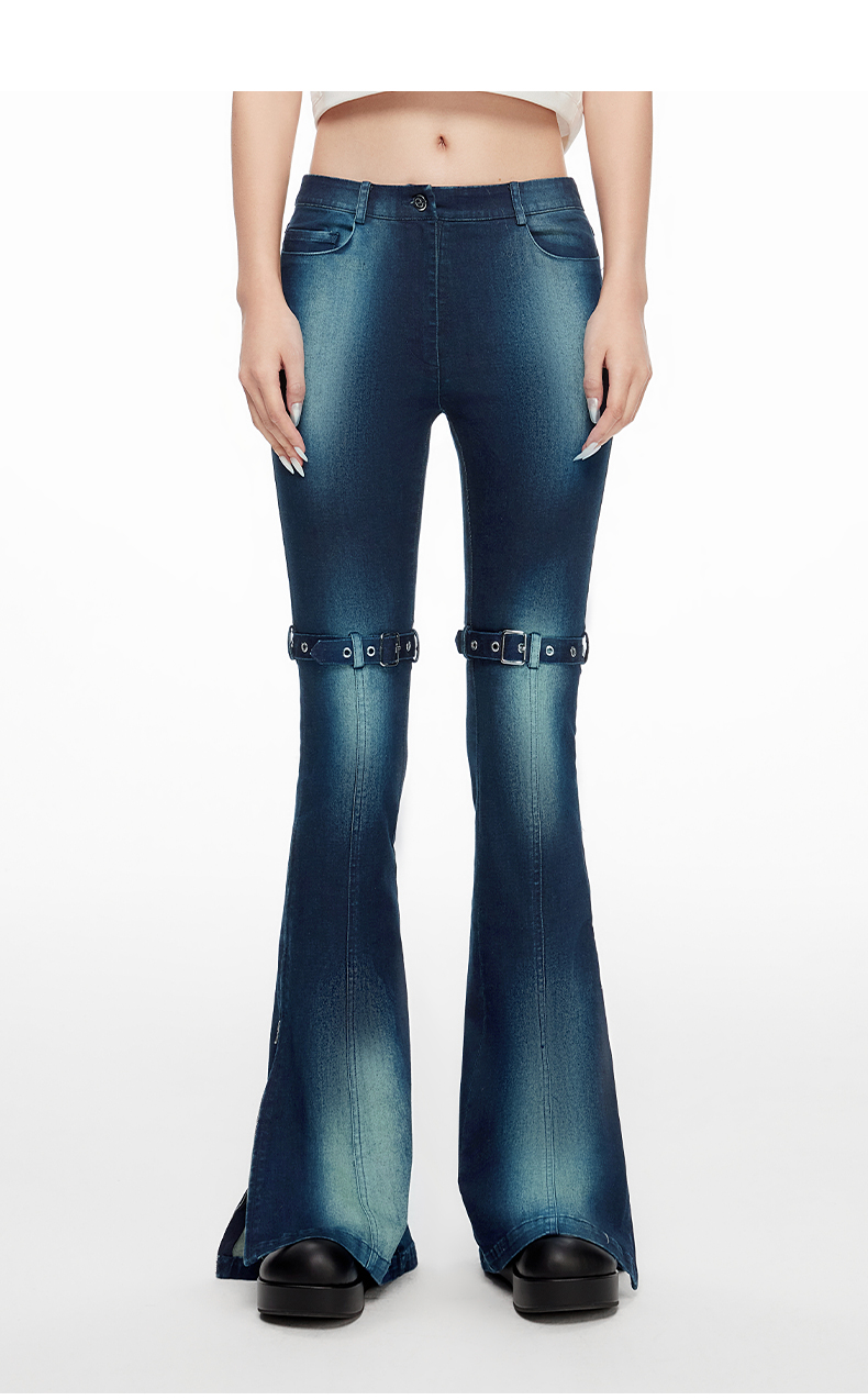 lost in echo2024春季新款设计师品牌双扣带紧身酸洗牛仔喇叭裤