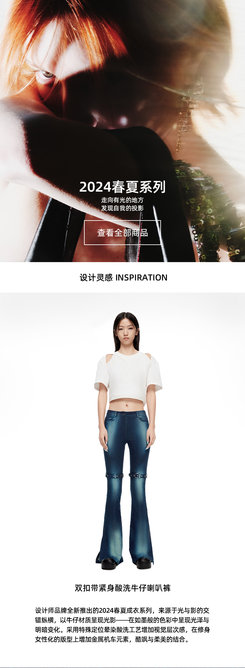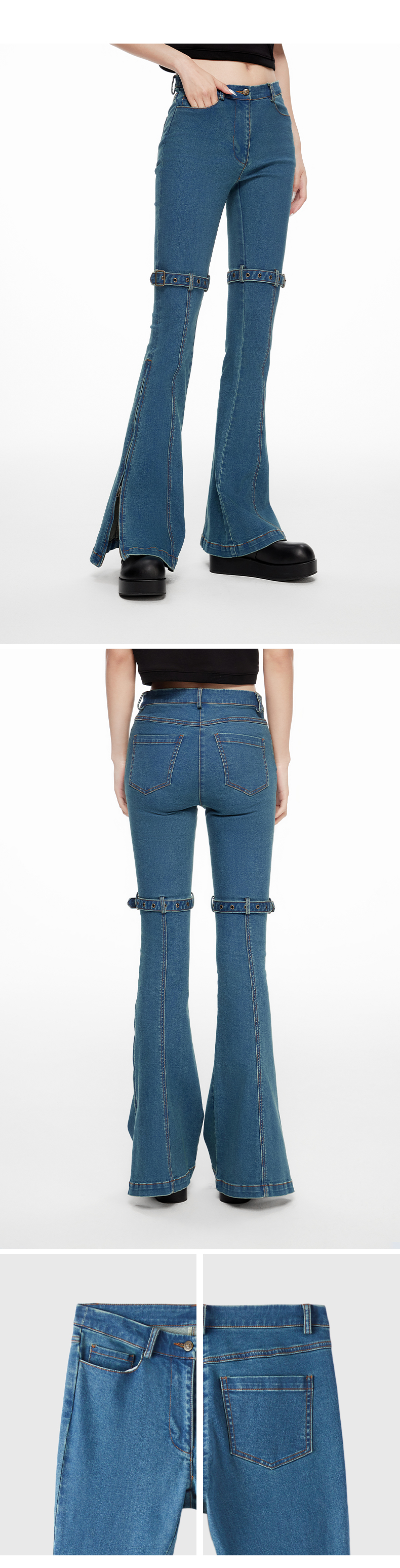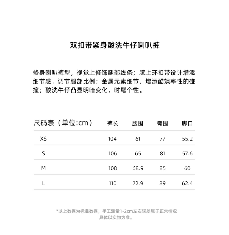 lost in echo2024春季新款设计师品牌双扣带紧身酸洗牛仔喇叭裤