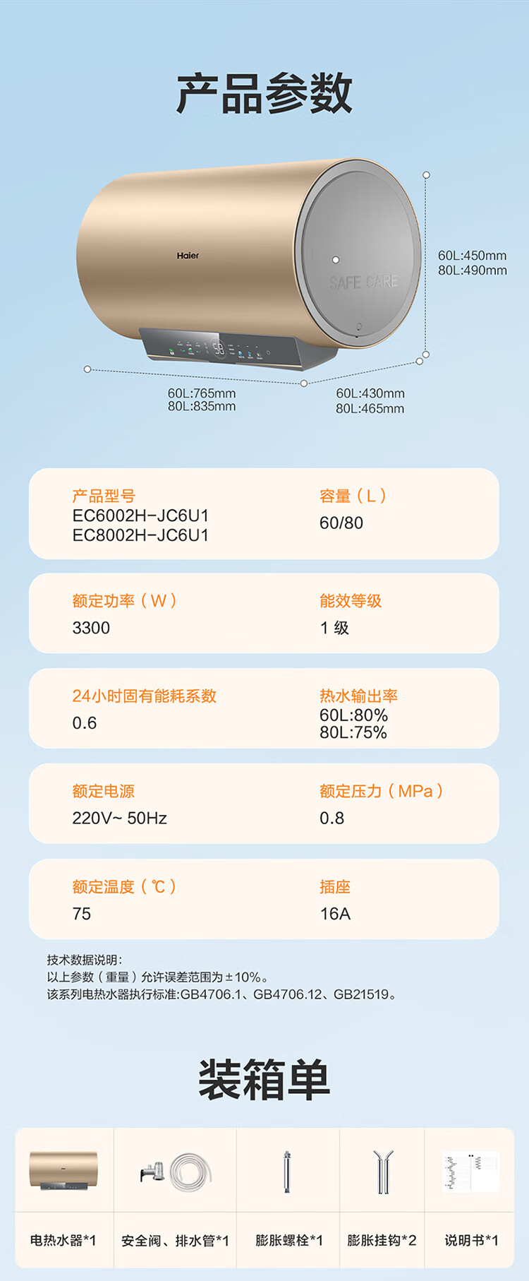 海尔(Haier)【JC6】60升电热水器 2.2/3.3KW变频速热 一级能效 金刚无缝胆 EC6002H-JC6U1