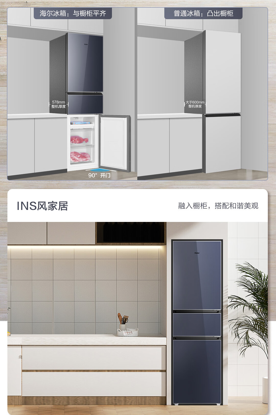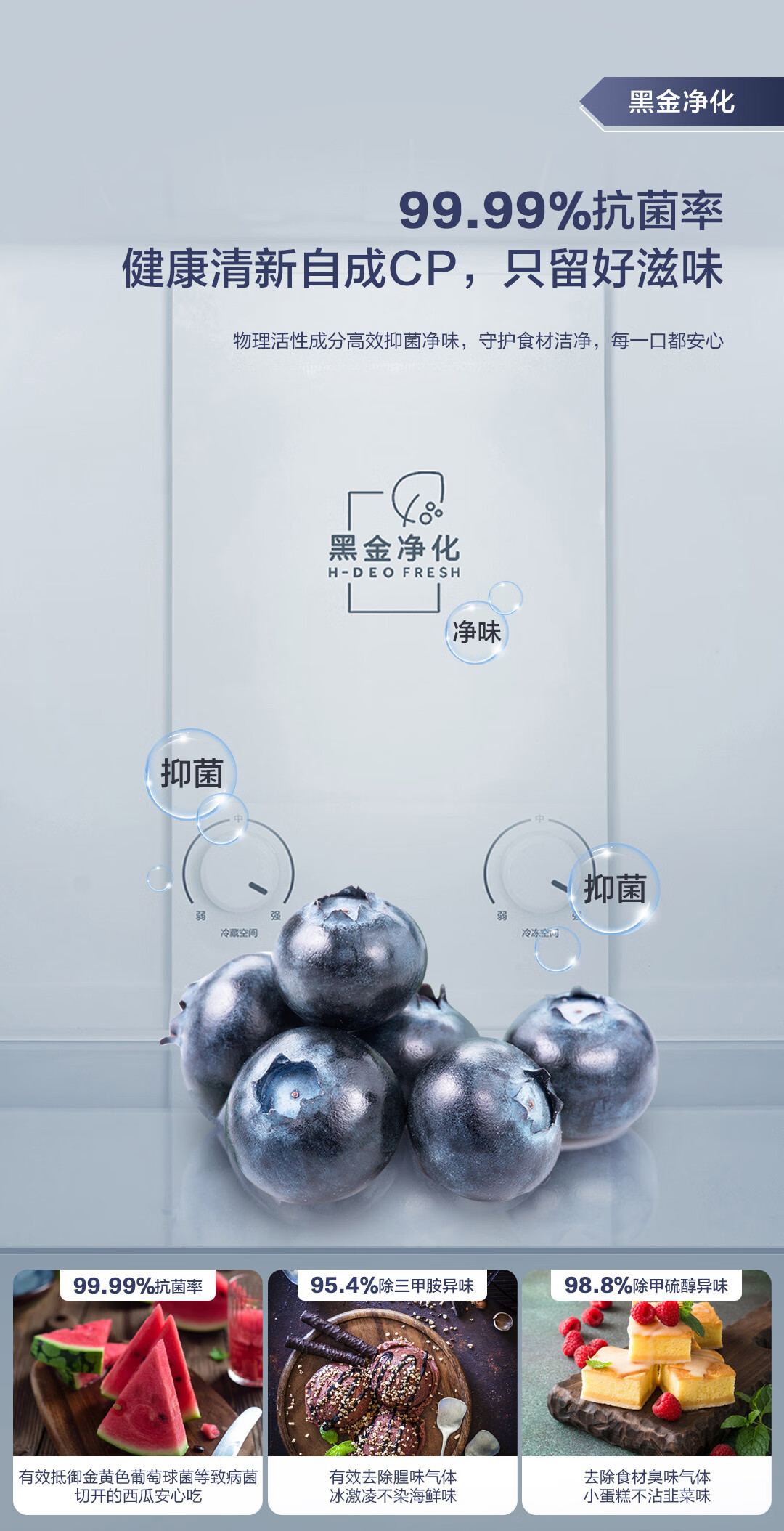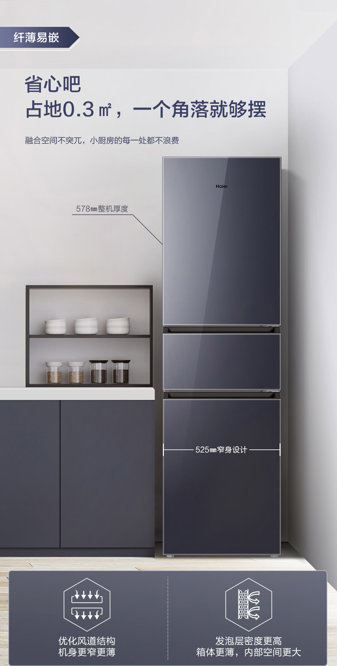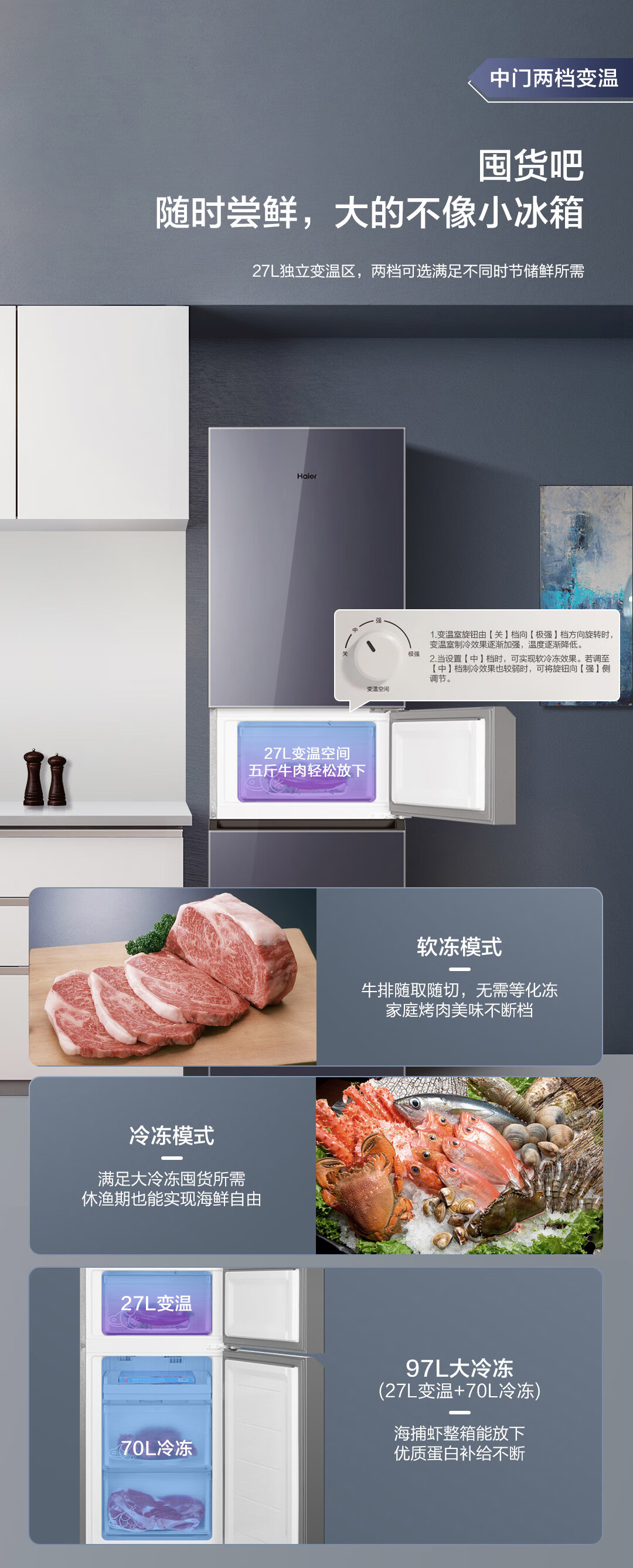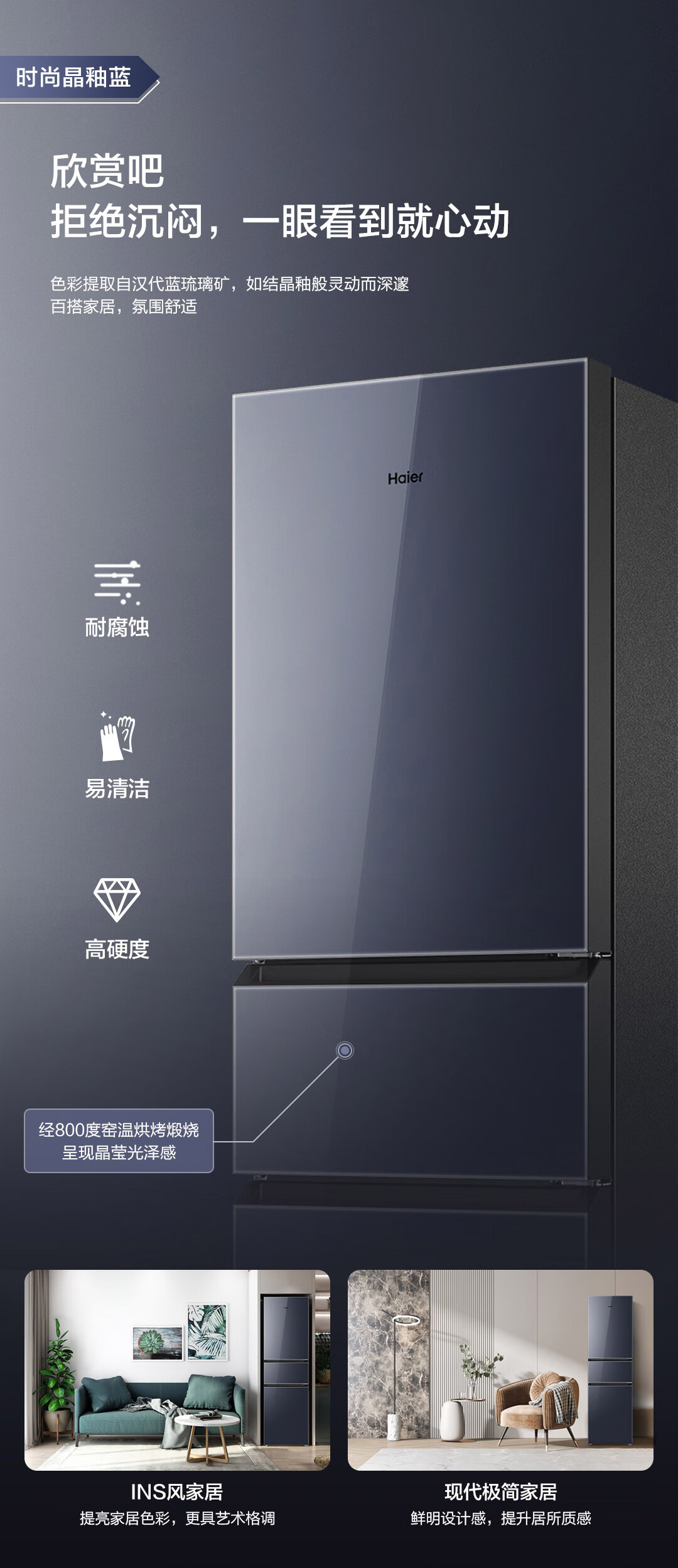 海尔 (Haier)218升 三门 风冷无霜 晶釉蓝玻璃面板 黑金净化 中门27L两档变温 BCD-218WGHC3R9B1变温大冷冻