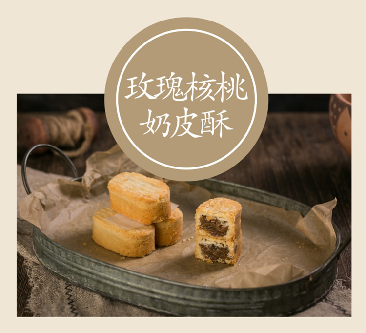 玫瑰核桃味道:小麦粉、黄油、白砂糖、核桃仁、玫瑰花酱(白砂糖、重瓣红玫瑰)、冬瓜蓉、牛奶、葵花籽油、鸡蛋、麦芽糖、食用盐;