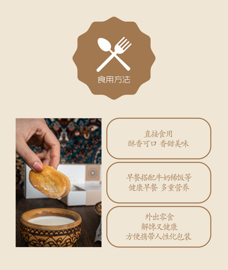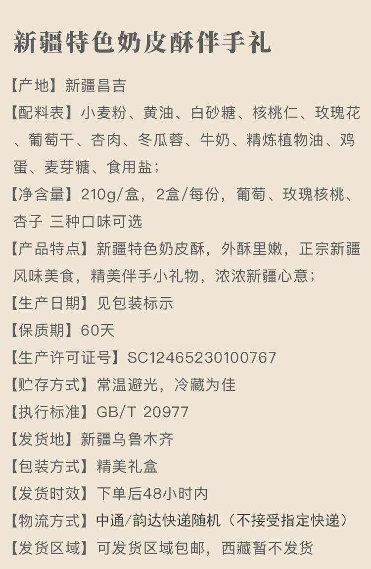 【产品特点】新疆特色奶皮酥,外酥里嫩,正宗新疆风味美食,精美伴手小礼物,浓浓新疆心意;