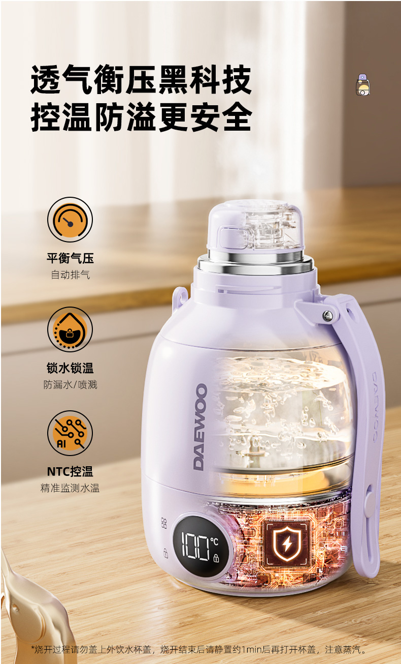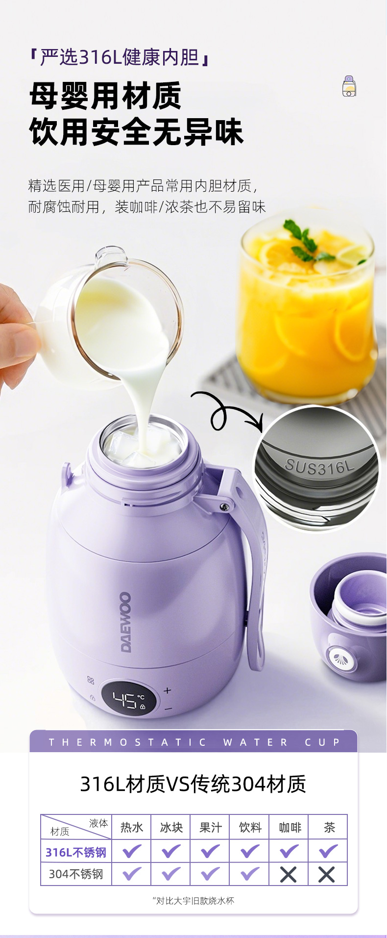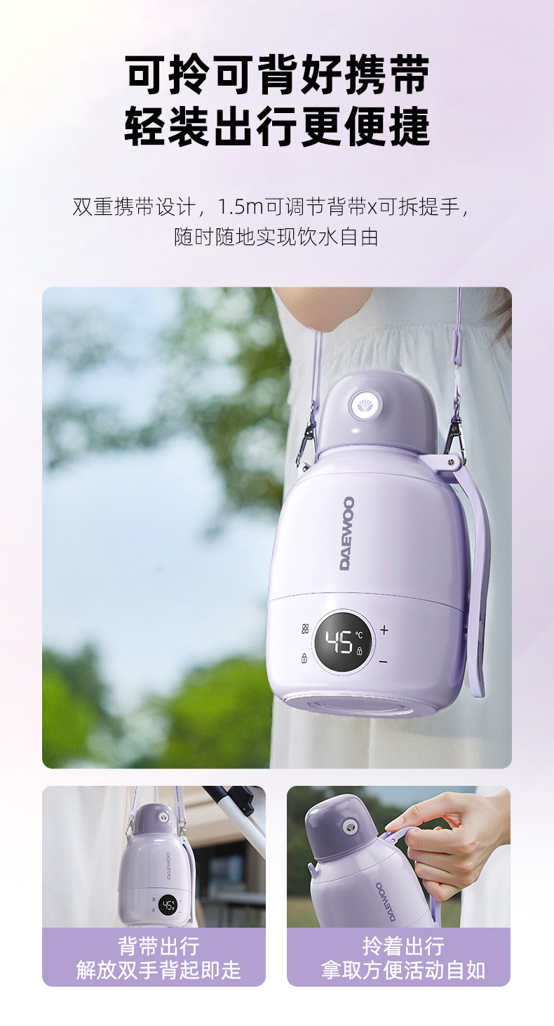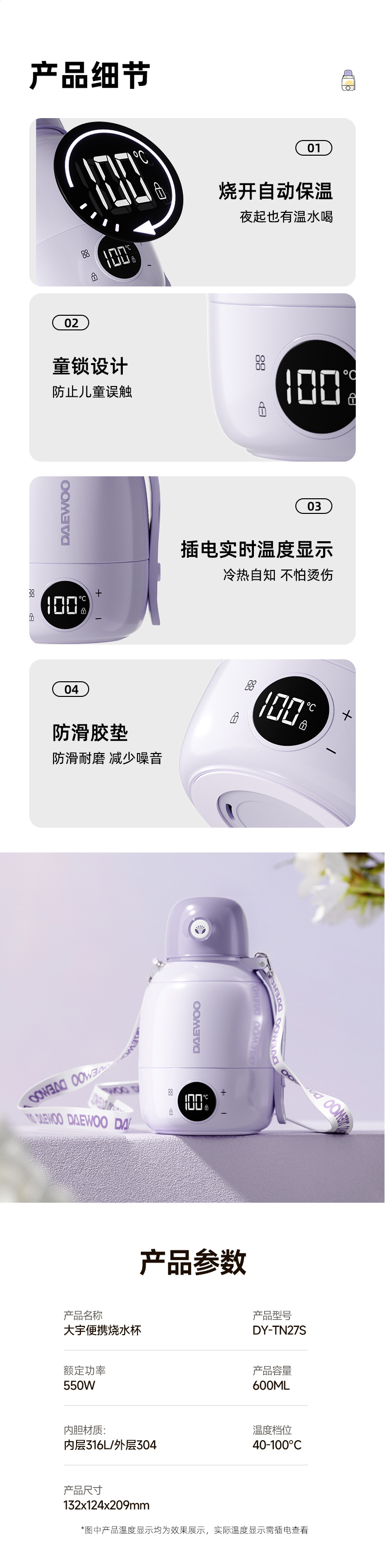【4min即热烧水】大宇恒温烧水杯DY-TN27S 即热烧水 一机相当于烧水壶/保温壶/调奶器/旅行壶 316L母婴用内胆 13段温度可调 7层真空锁温层 1.5m调节背带 容量600ml
