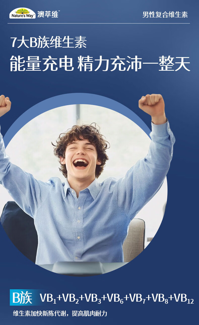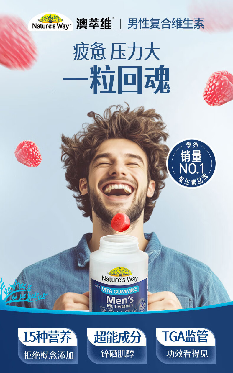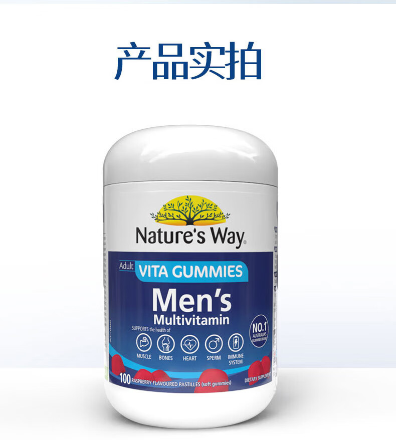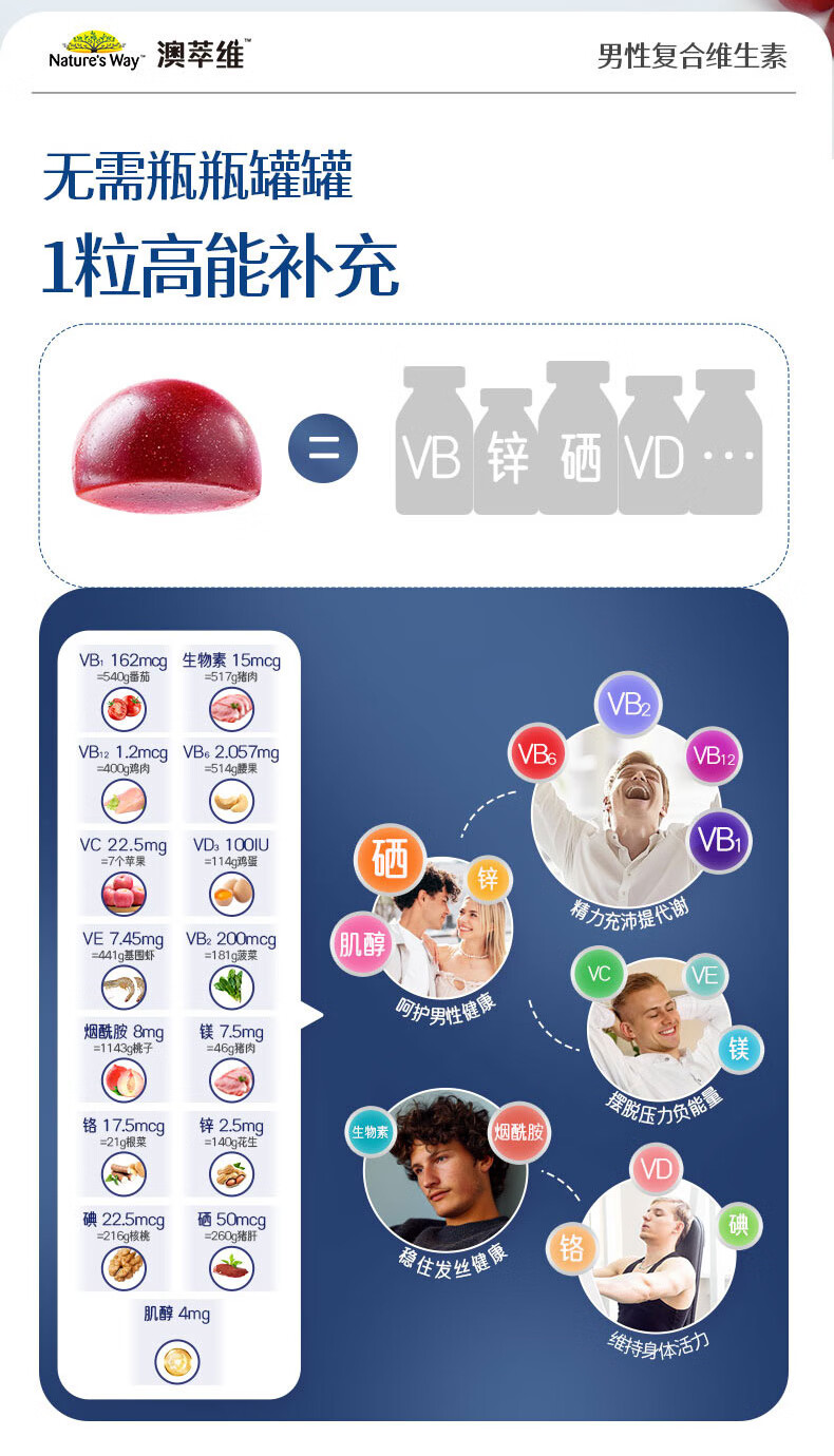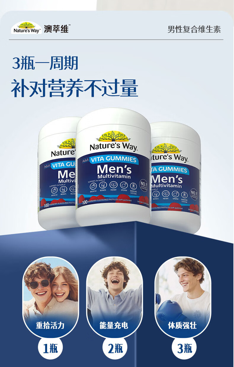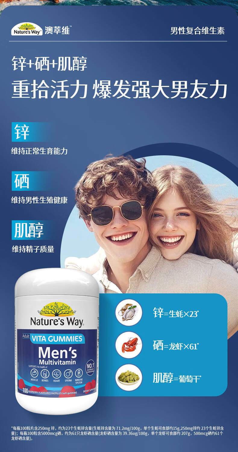 佳思敏(Nature's Way)澳萃维 男性复 合 维生素软糖 100粒/瓶 含多种维生素B族维C镁锌硒生物素 【15种男性营养】
