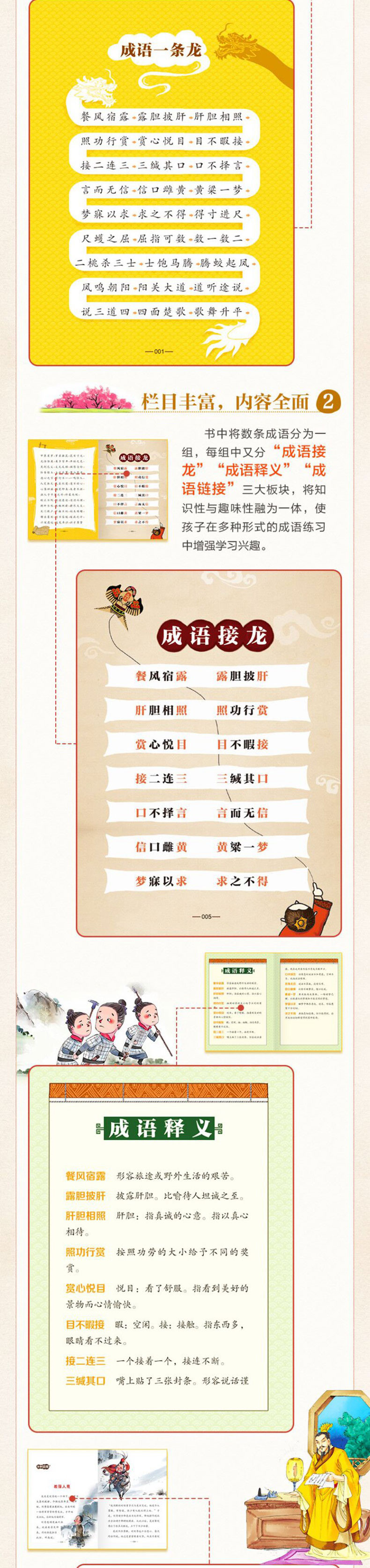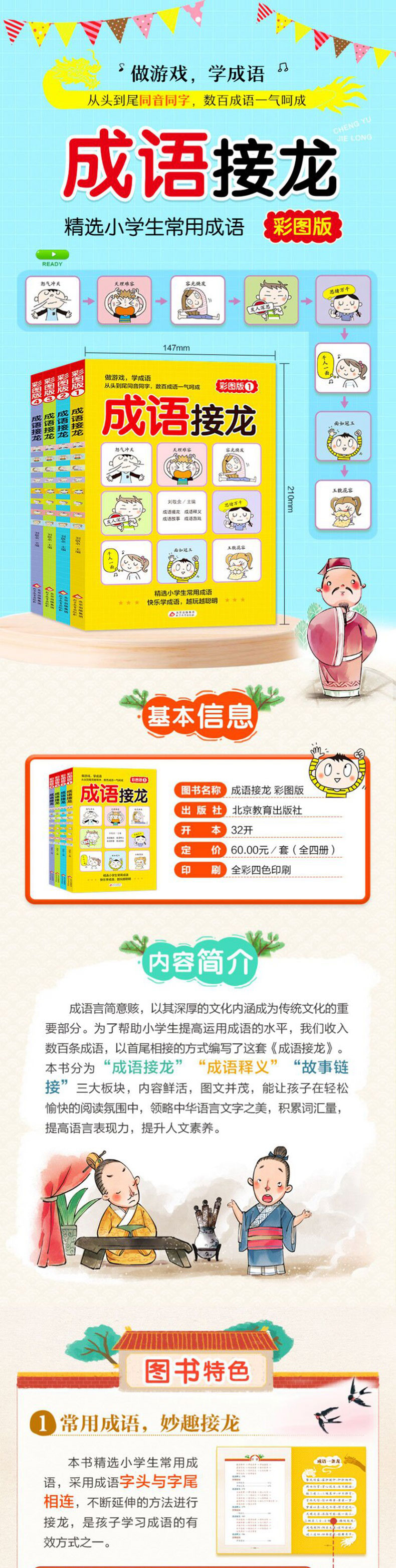 《成语接龙》是一套以5-10岁儿童为阅读对象的知识读本。本套丛书共四册,按照接龙的形式对成语展开叙述,内容精彩,知识丰富,寓教于乐,对小学生感受传统文化,学习传统文化知识大有裨益。本书将小学阶段的常用成语组成一条龙,对每个成语进行了解释,还有与成语相关的精彩故事和习题。可以帮助小学生加深理解、掌握成语。本套丛书还配有多幅精美的插图,全面而直观地展现出成语所处时代及其背景,大大增强了本书的可读性和趣味性,从而使孩子们更直观、更感性地了解成语,获得知识。