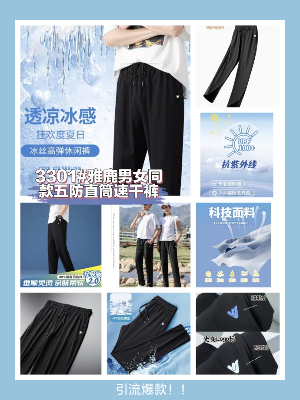 【冰丝透气】雅鹿 春夏男女同款五防冰爽直筒速干裤