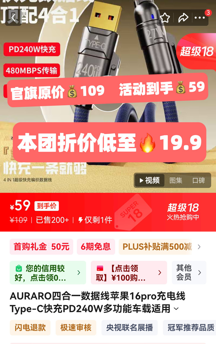 亲测❗️华为/苹果适配!💰19.9到手1.8米长线❗❗以一敌四 💥品质巨好!【Auraro 四合一超级快充数据线】四种接口随意切换安卓/苹果