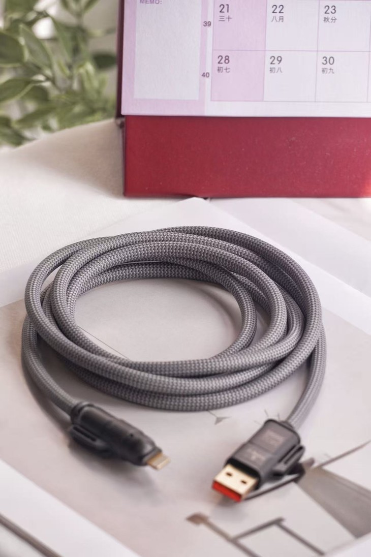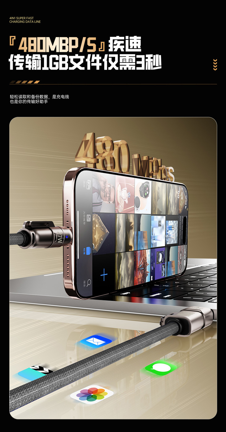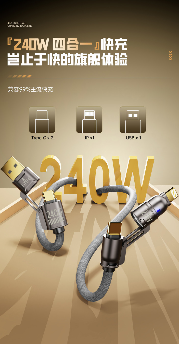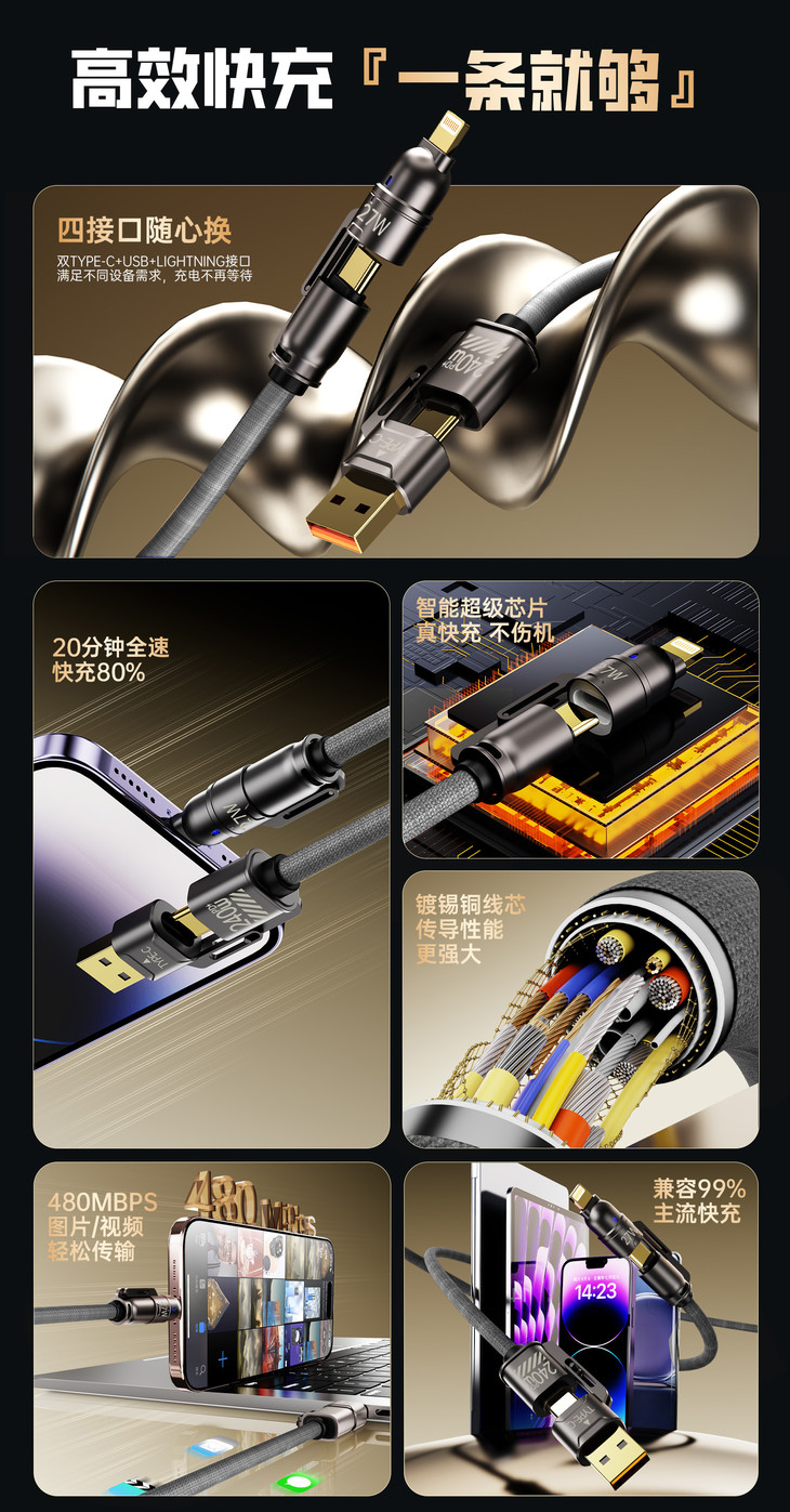 ✅20WPD/65W安卓快速充电,480mbps高数据传输 ✅超强四合一,一线四用,一根更比4根强 ✅E-Mark 芯片安全加持,安全高效两不误 ✅加粗尼龙编织绳线身配镀铜接口,耐造不缠绕