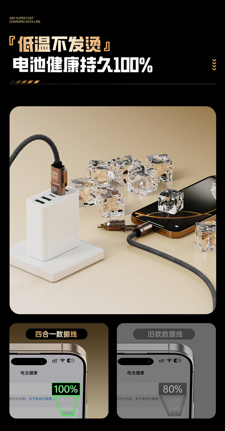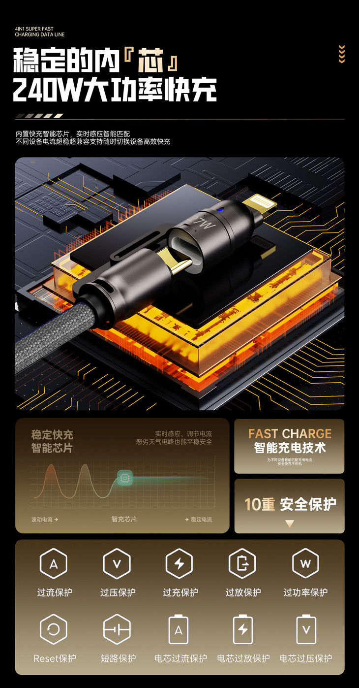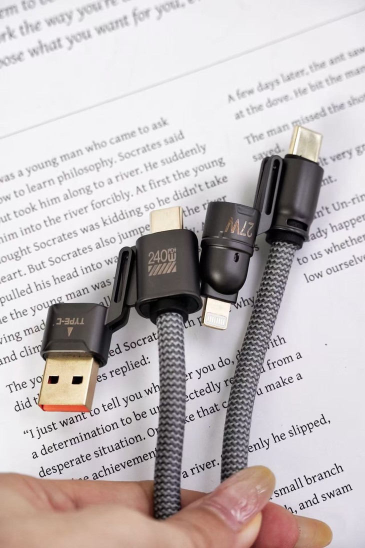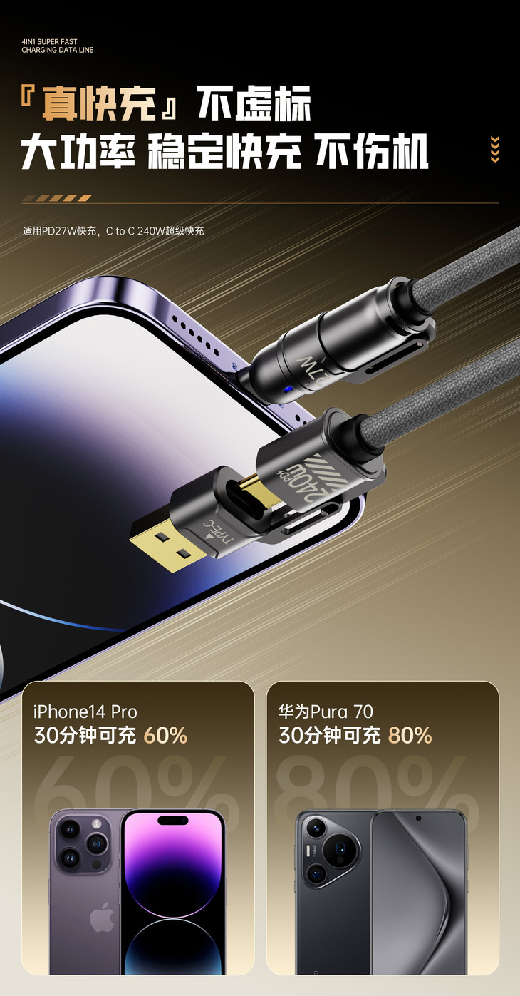 ✅20WPD/65W安卓快速充电,480mbps高数据传输 ✅超强四合一,一线四用,一根更比4根强 ✅E-Mark 芯片安全加持,安全高效两不误 ✅加粗尼龙编织绳线身配镀铜接口,耐造不缠绕