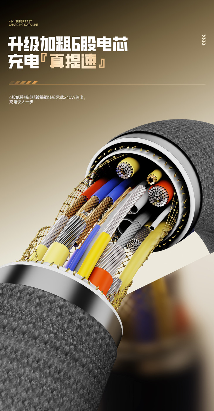 🔺升级加粗6股电芯 6股低损耗超粗镀锡铜轻松承载240W输出 充电速度肉眼可见的快 一杯咖啡的时间就能充到畅玩
