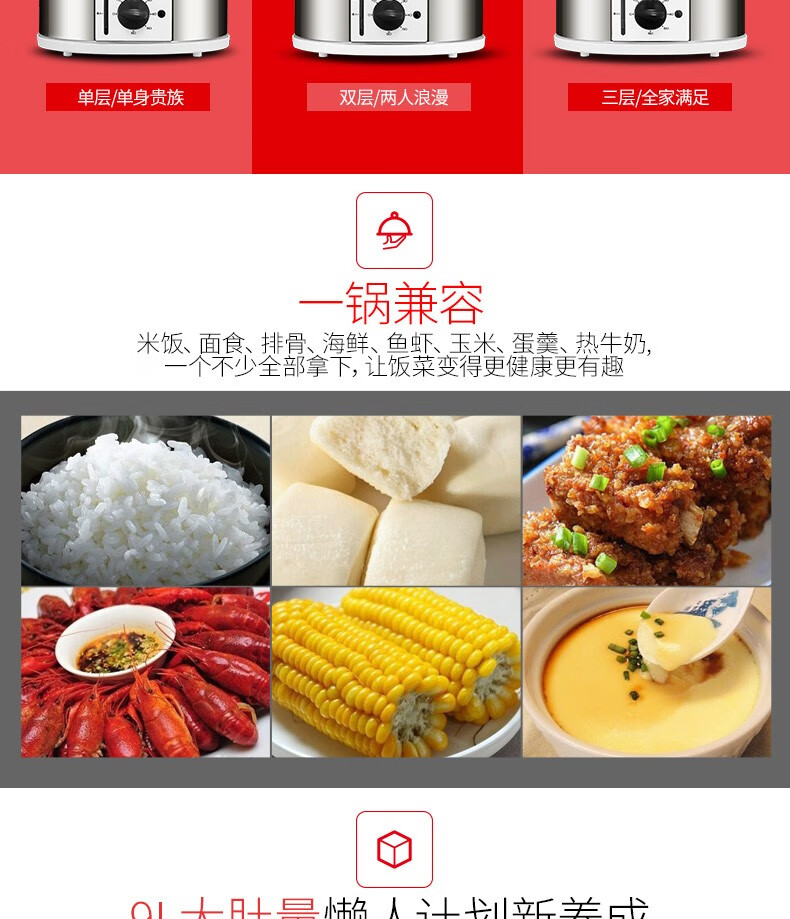摩飞电器(Morphyrichards) 多功能电蒸锅蒸笼三层家用蒸菜蒸鱼电热锅MR1148 出厂标配