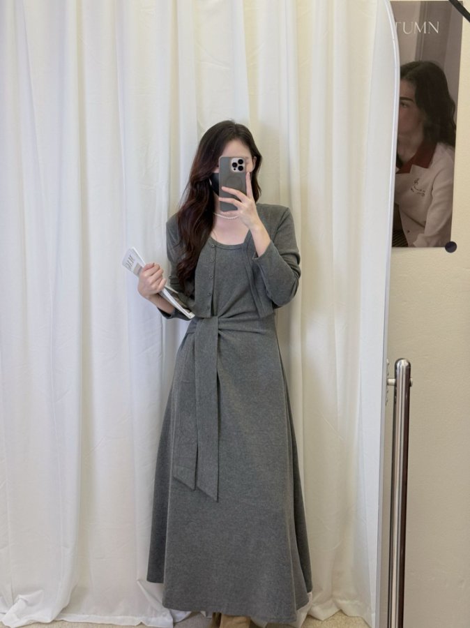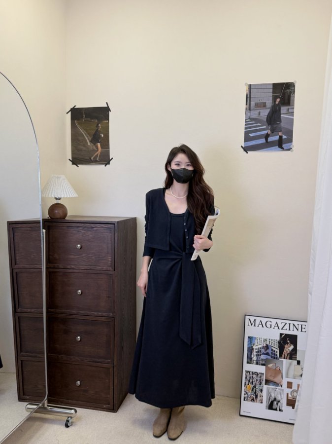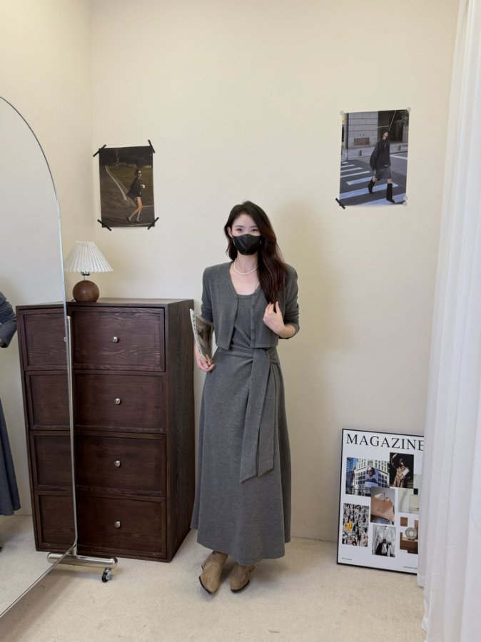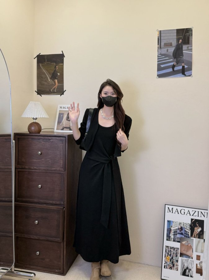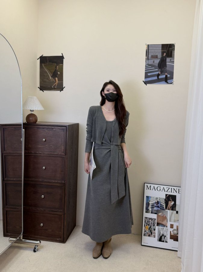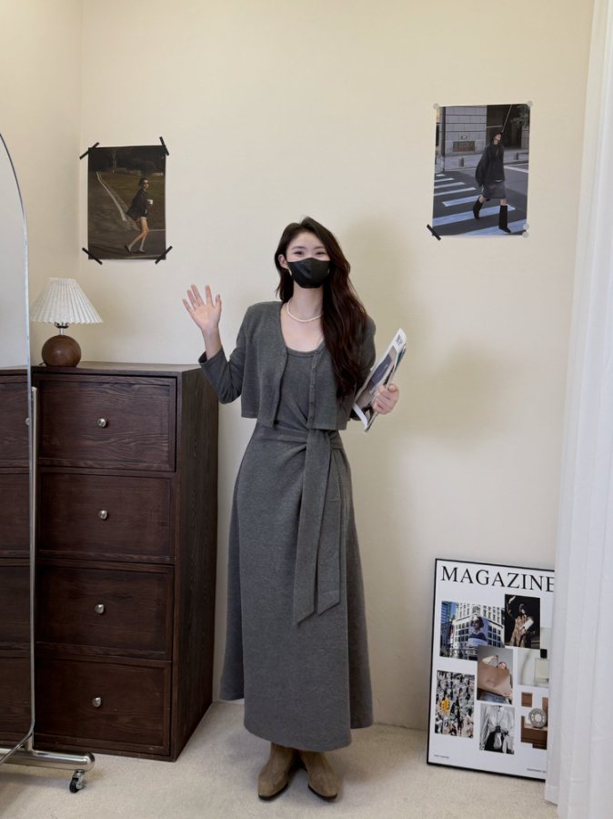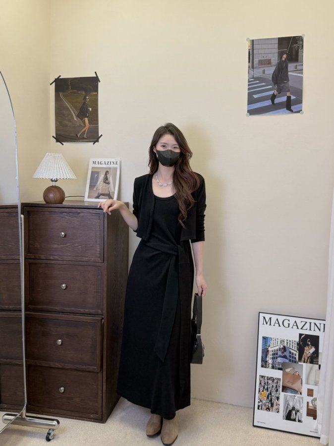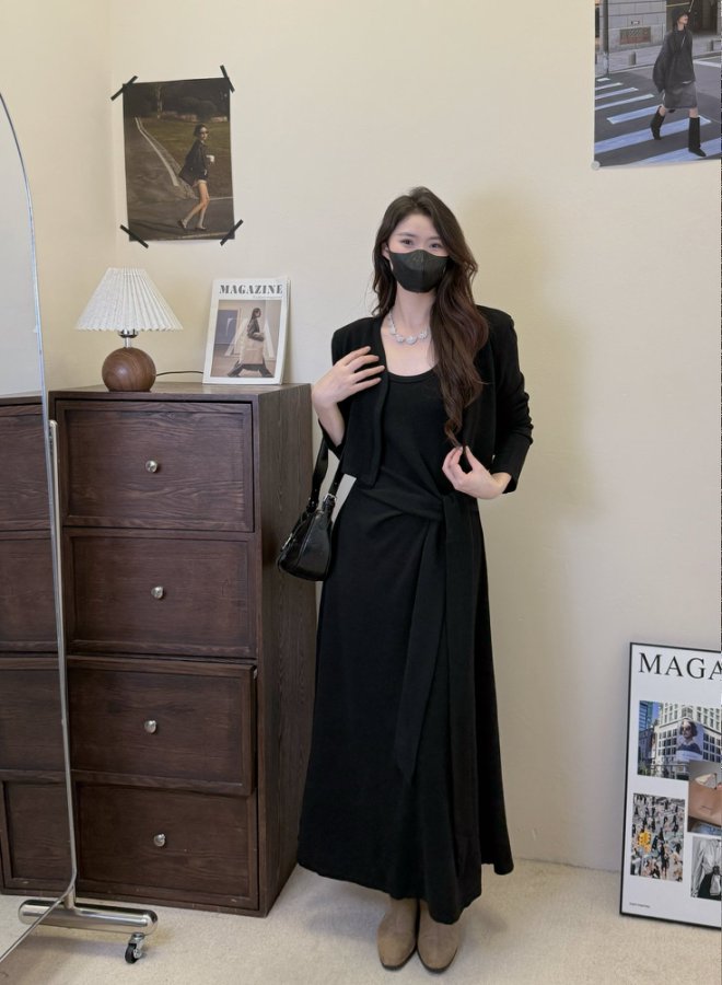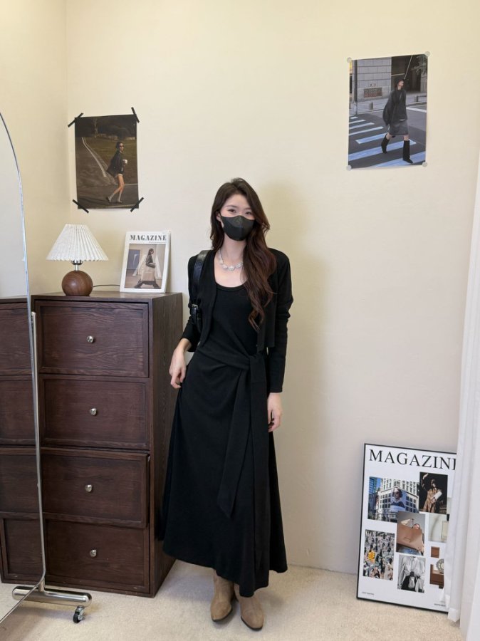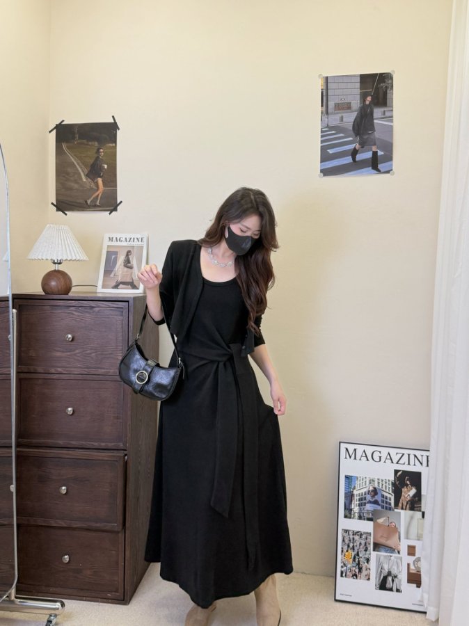 【GZ】无忧购韩版设计感长袖连衣裙新款两件套休闲修身系带长裙8079(截单后3-5天发货)