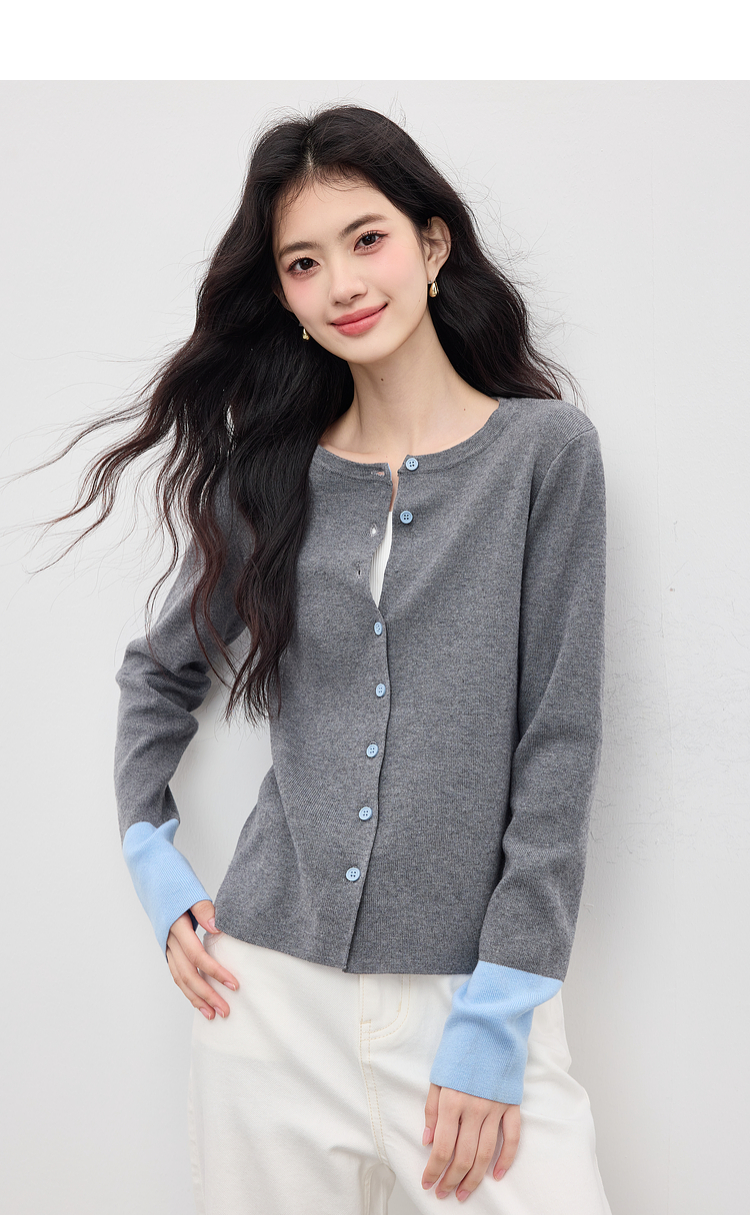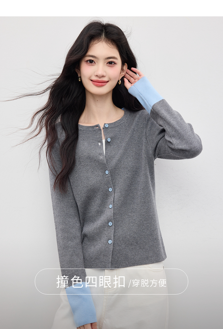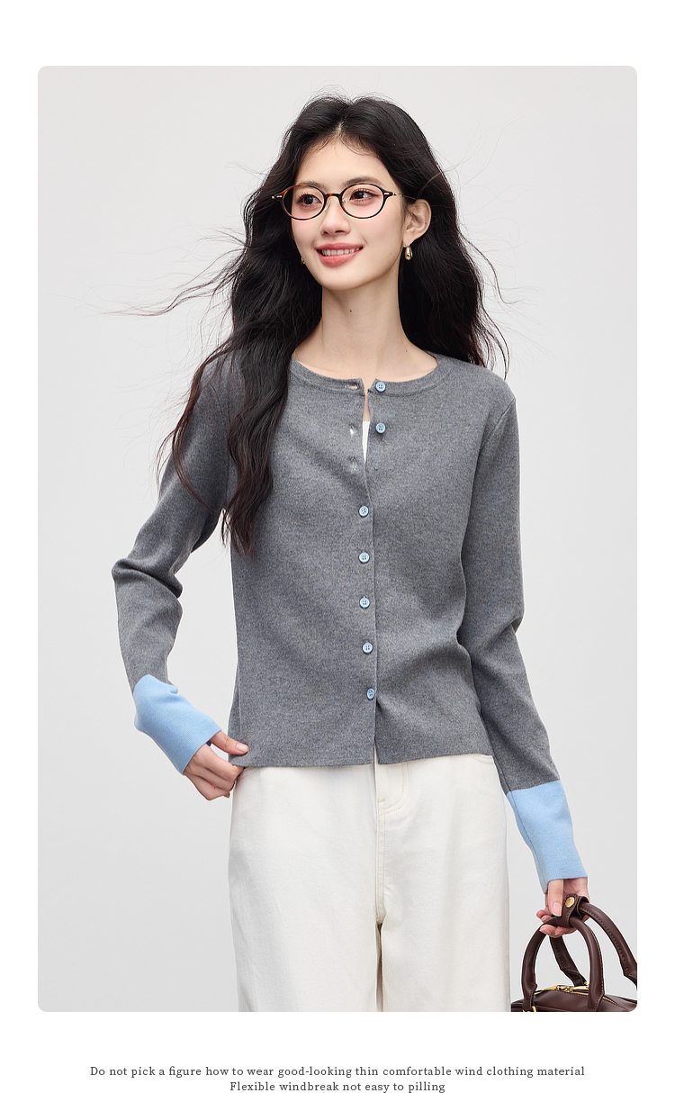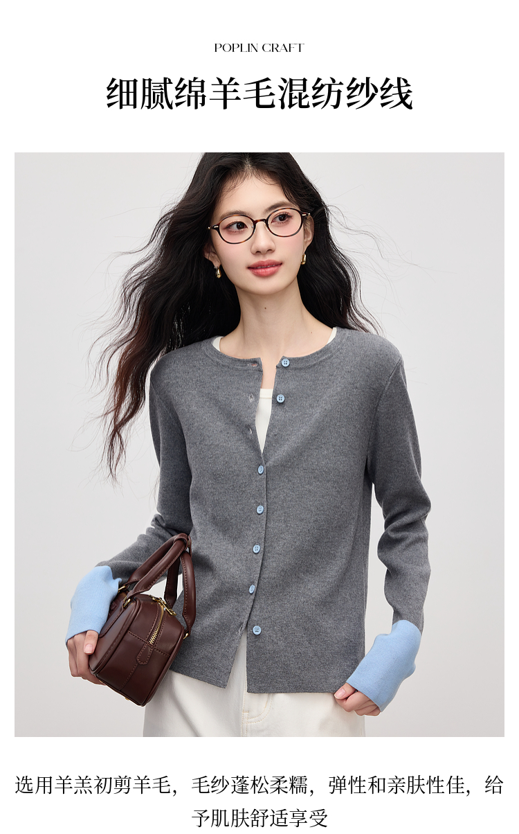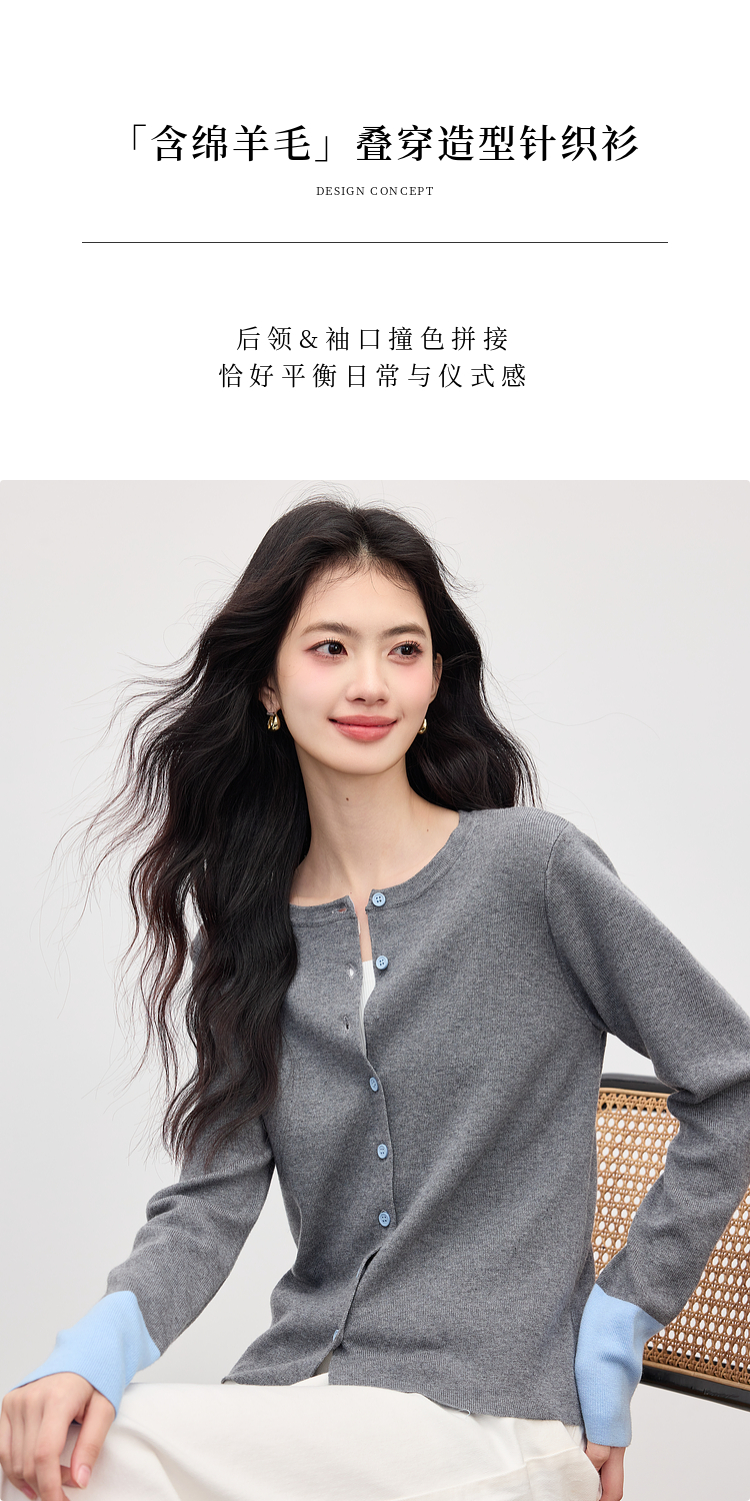 【09/03新品】熙世界2025女秋季新款拼色长袖羊毛针织衫女休闲修身圆领毛衣开衫